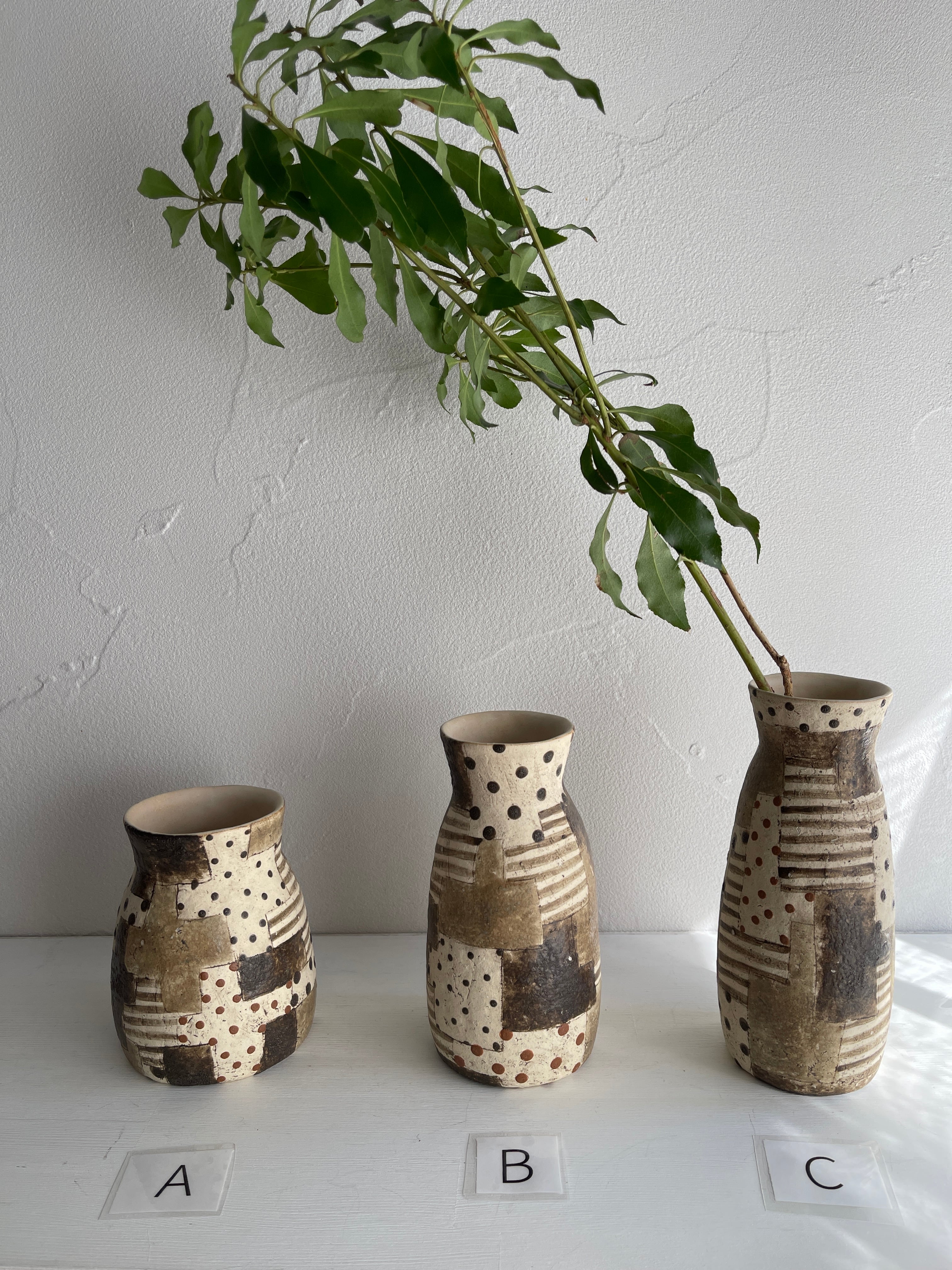 草花をたくさん入れることも可能な大きめの置き型花器です。一輪挿しでも素敵ですし、ドライフラワーを入れるのも陶器の質感と合うと思います。モザイク柄は、グルっと柄が違うのでどこを正面にするかで新鮮な気持ちになります。口部分は、草花が生けやすい形で安定感があります。茶系の色合いは、植物との相性も〇
