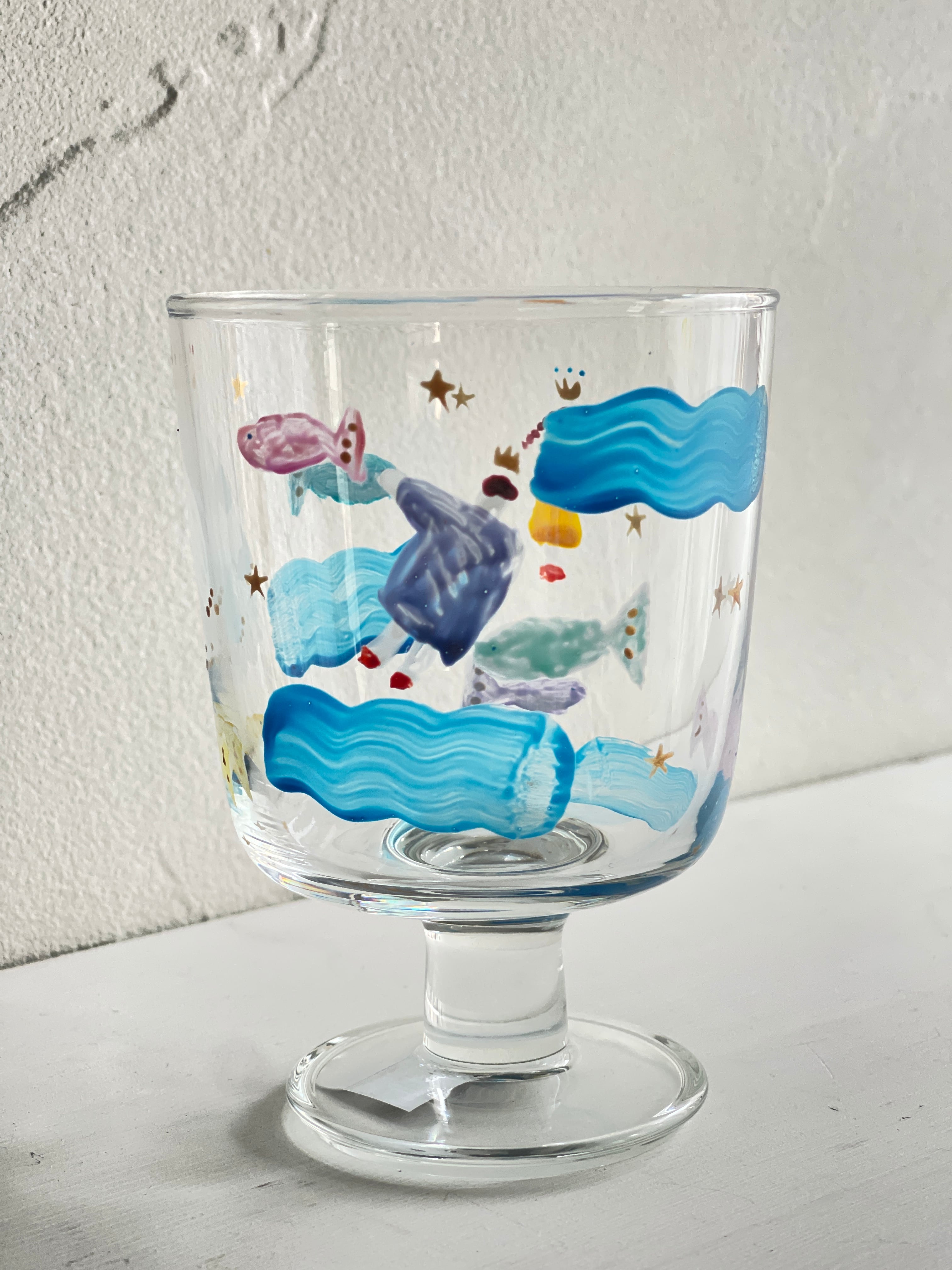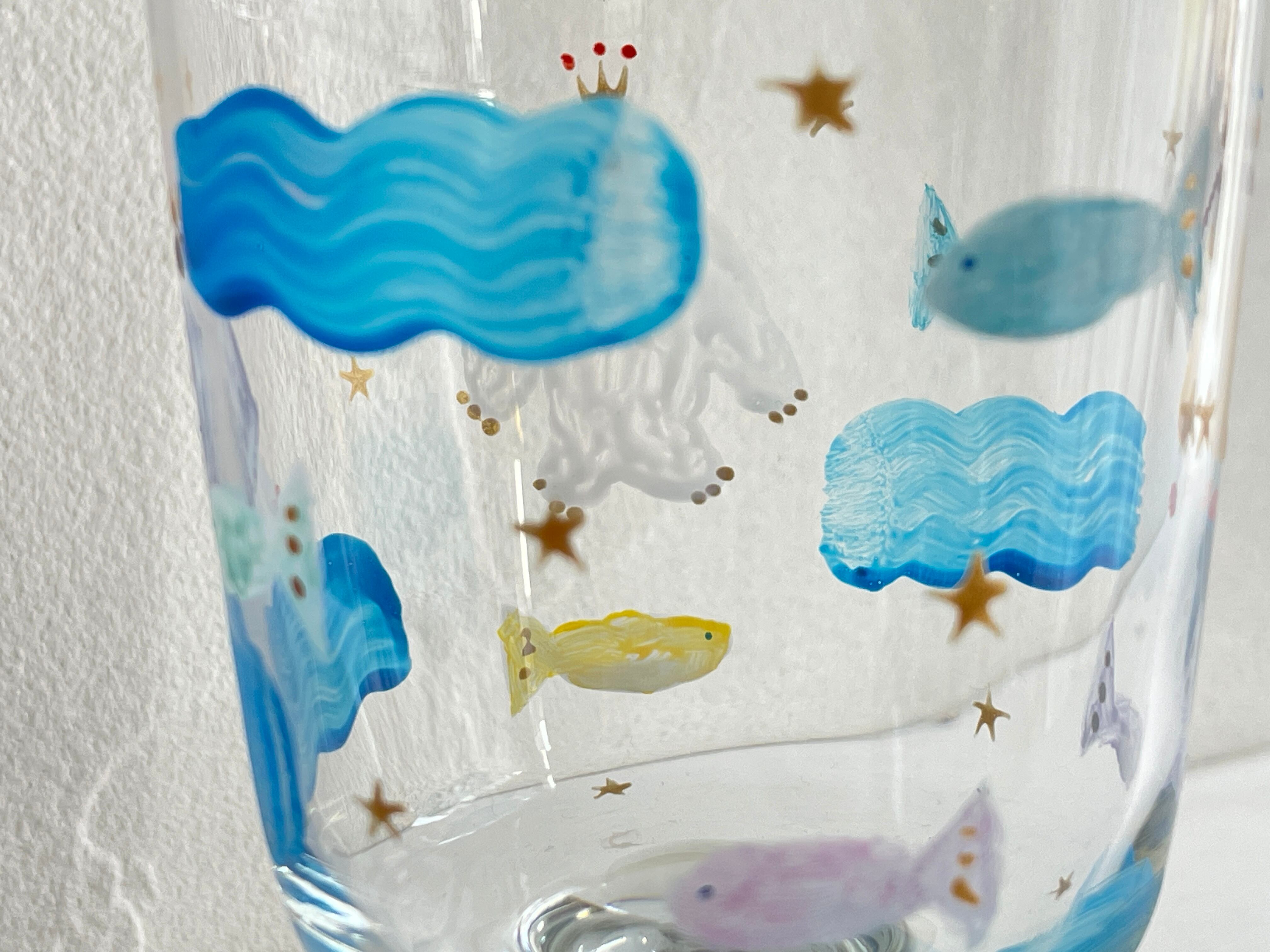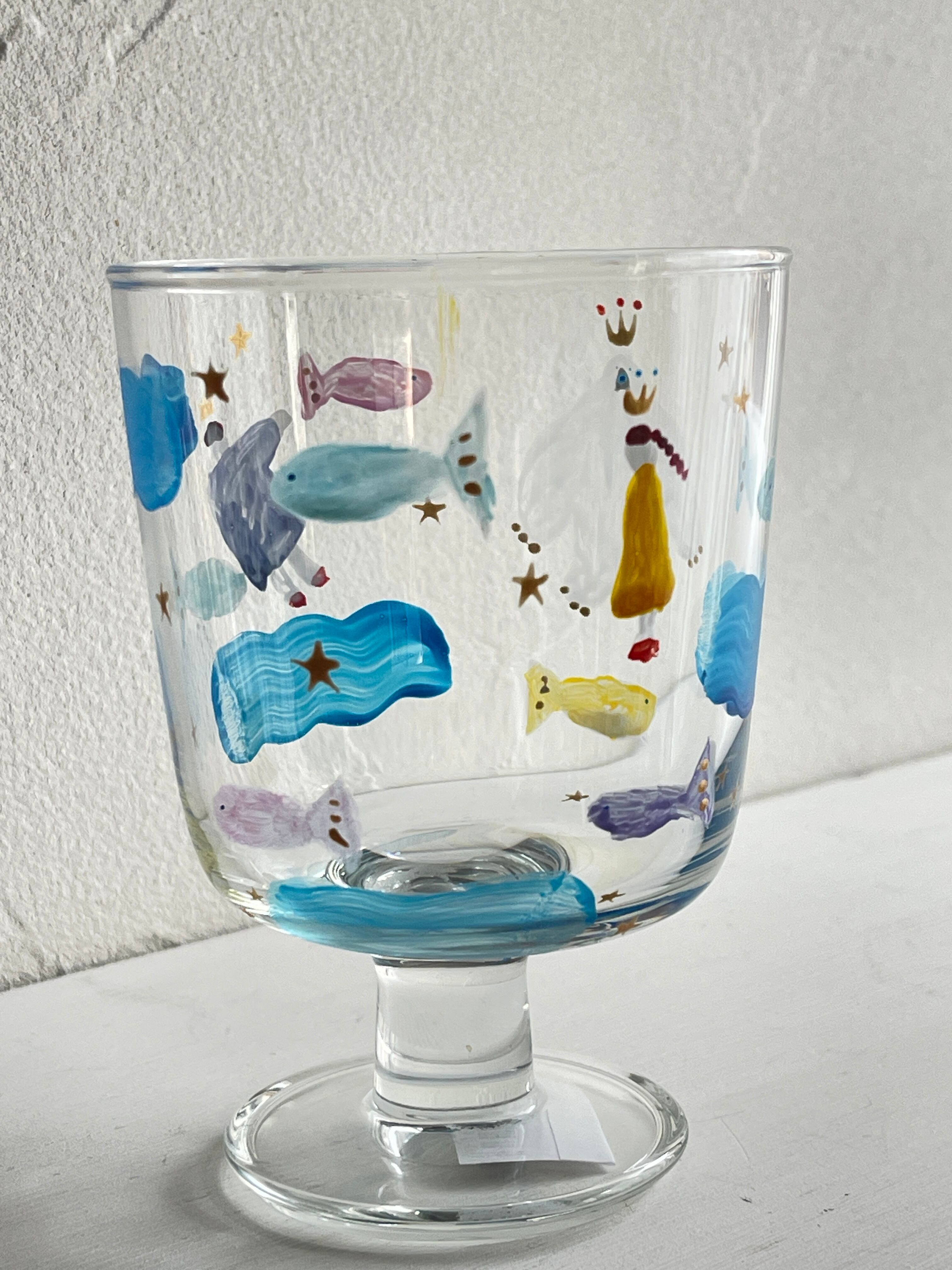 TOKITUGI さんの手書きの1点ものゴブレットグラスです。白いふわふわとした大きなトリの王様とお魚たち、星や王冠を㈱tg多男の子と女の子のデザイン。様々な飲み物を入れると、グラスの世界観が変わります。アイスクリームやデザート、野菜スティック等食材をいれても〇持ちやすいグラスで安定感あり。比較的割れにくいガラスのタイプなので、小さなお子様でも使いやすいグラスです。贈り物にも喜ばれています。