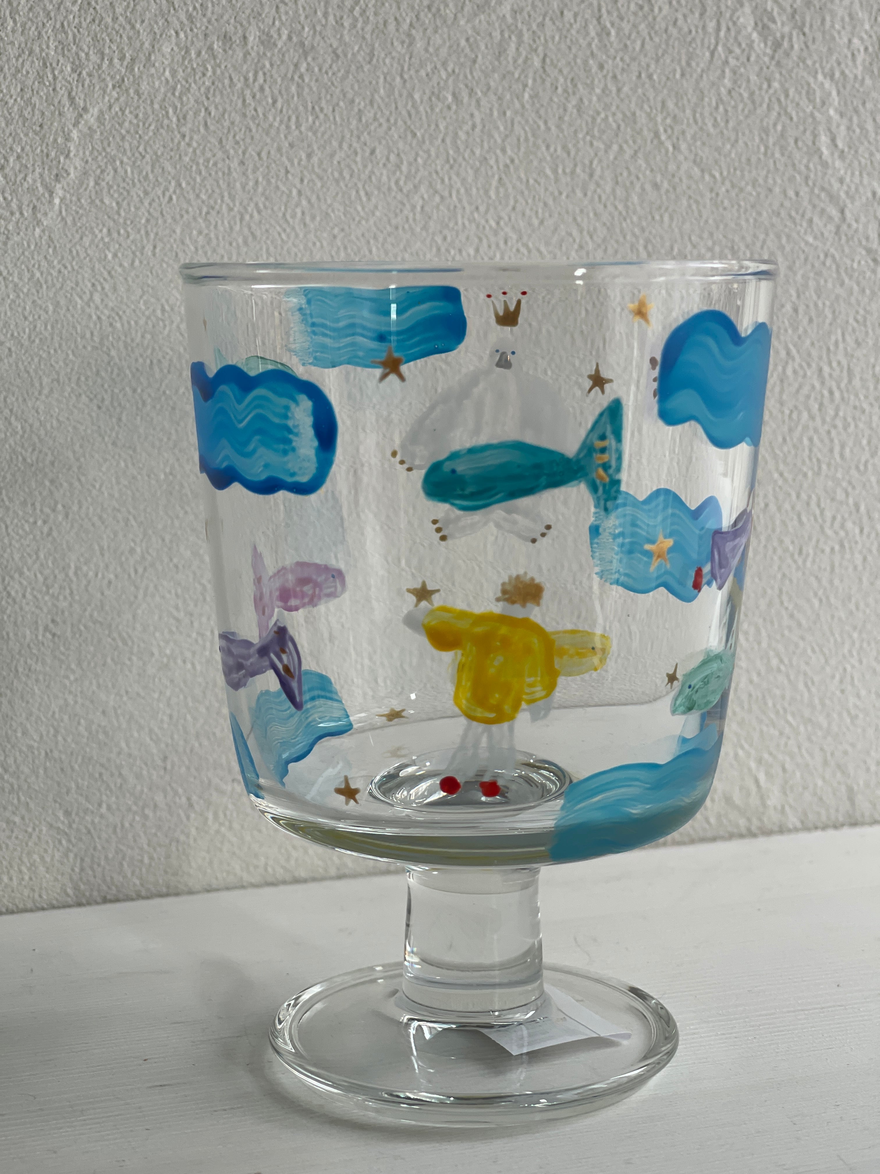 TOKITUGI さんの手書きの1点ものゴブレットグラスです。白いふわふわとした王冠をつけたトリと、お魚たちがぐるぐる泳いでいます。小さな男の子と女の子のデザインも。様々な飲み物を入れると、グラスの世界観が変わります。アイスクリームやデザート、野菜スティック等食材をいれても〇持ちやすいグラスで安定感あり。比較的割れにくいガラスのタイプなので、小さなお子様でも使いやすいグラスです。贈り物にも喜ばれています。