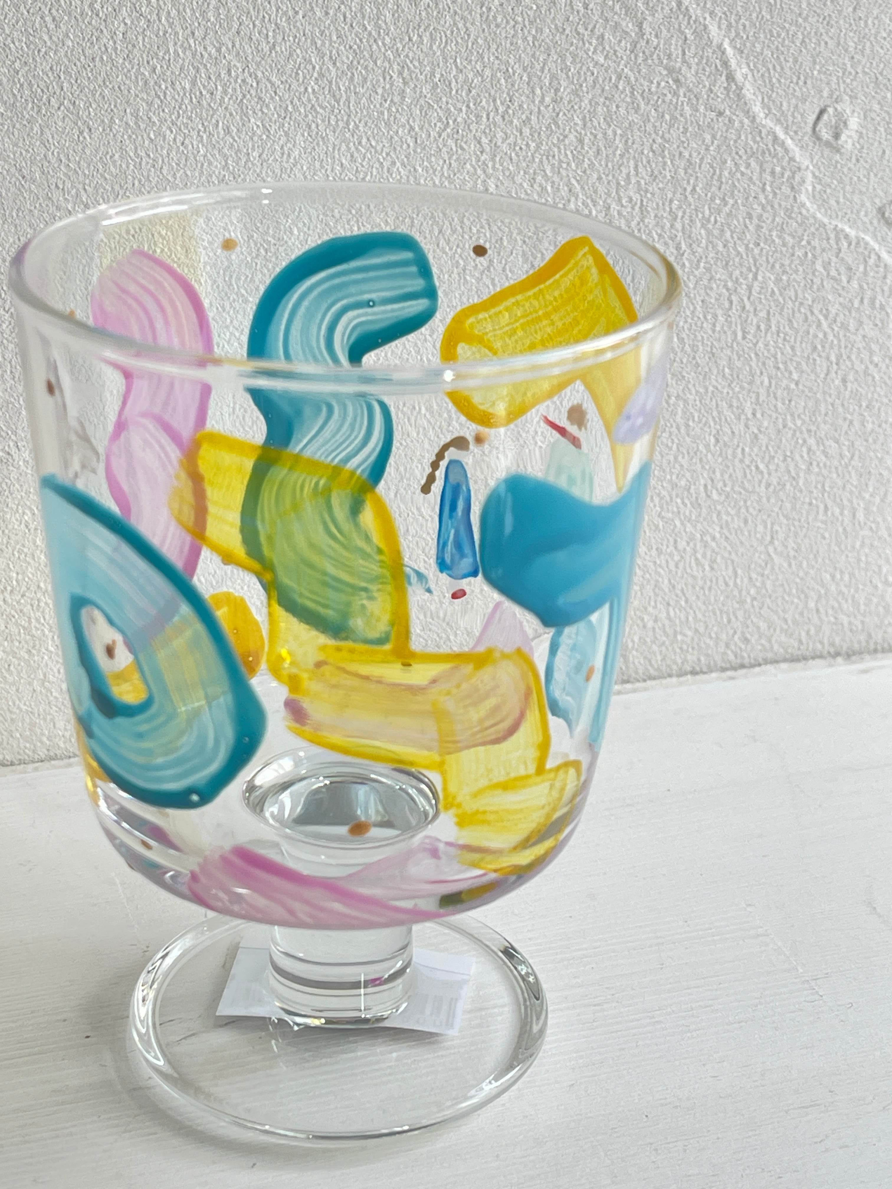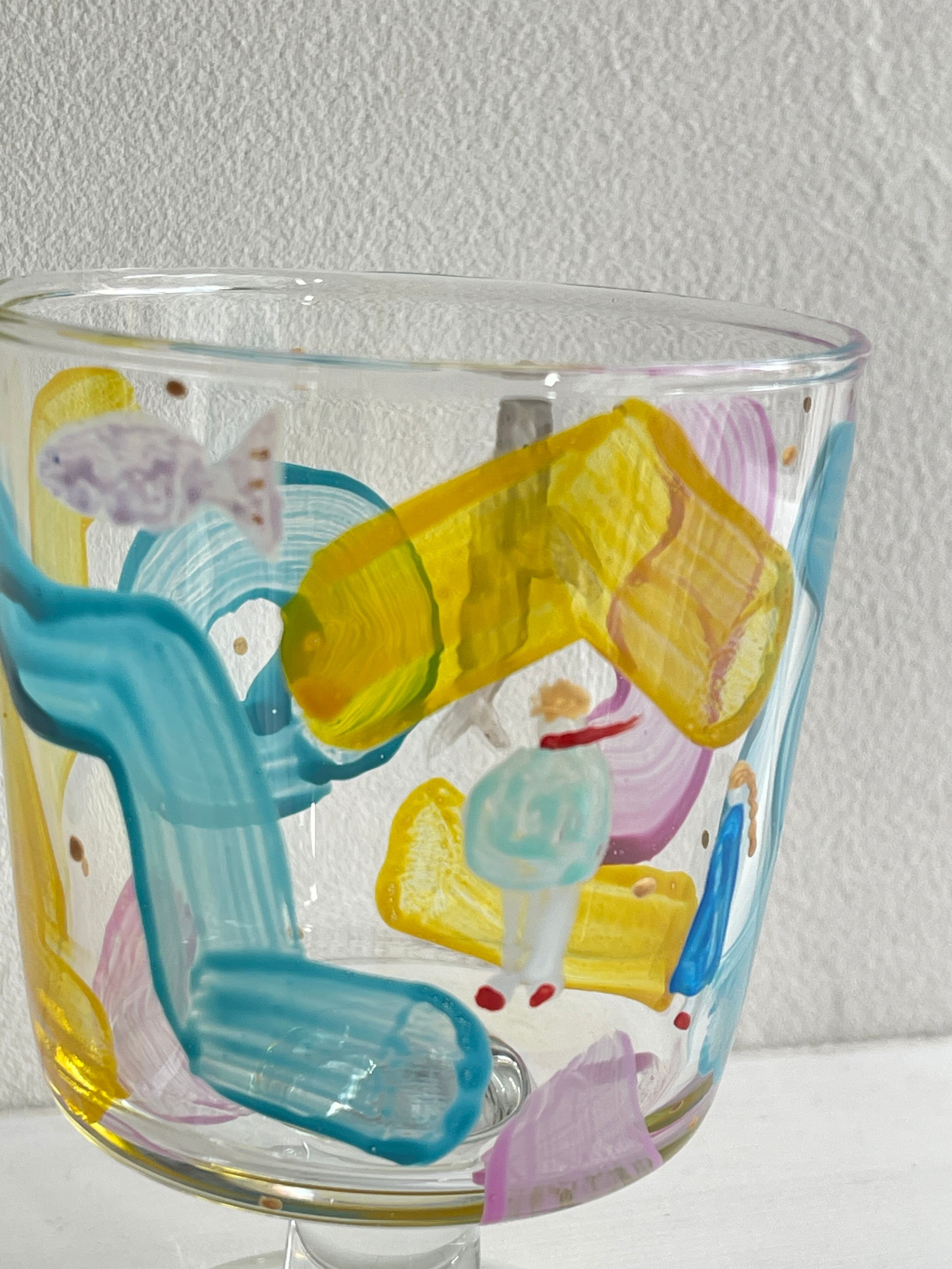 TOKITUGI さんの手書きの1点ものゴブレットグラスです。クジラの絵は貴重なデザイン。お魚や男の子と女の子などのイラストが描かれています。様々な飲み物を入れると、グラスの世界観が変わります。アイスクリームやデザート、野菜スティック等食材をいれても〇持ちやすいグラスで安定感あり。比較的割れにくいガラスのタイプなので、小さなお子様でも使いやすいグラスです。贈り物にも喜ばれています。