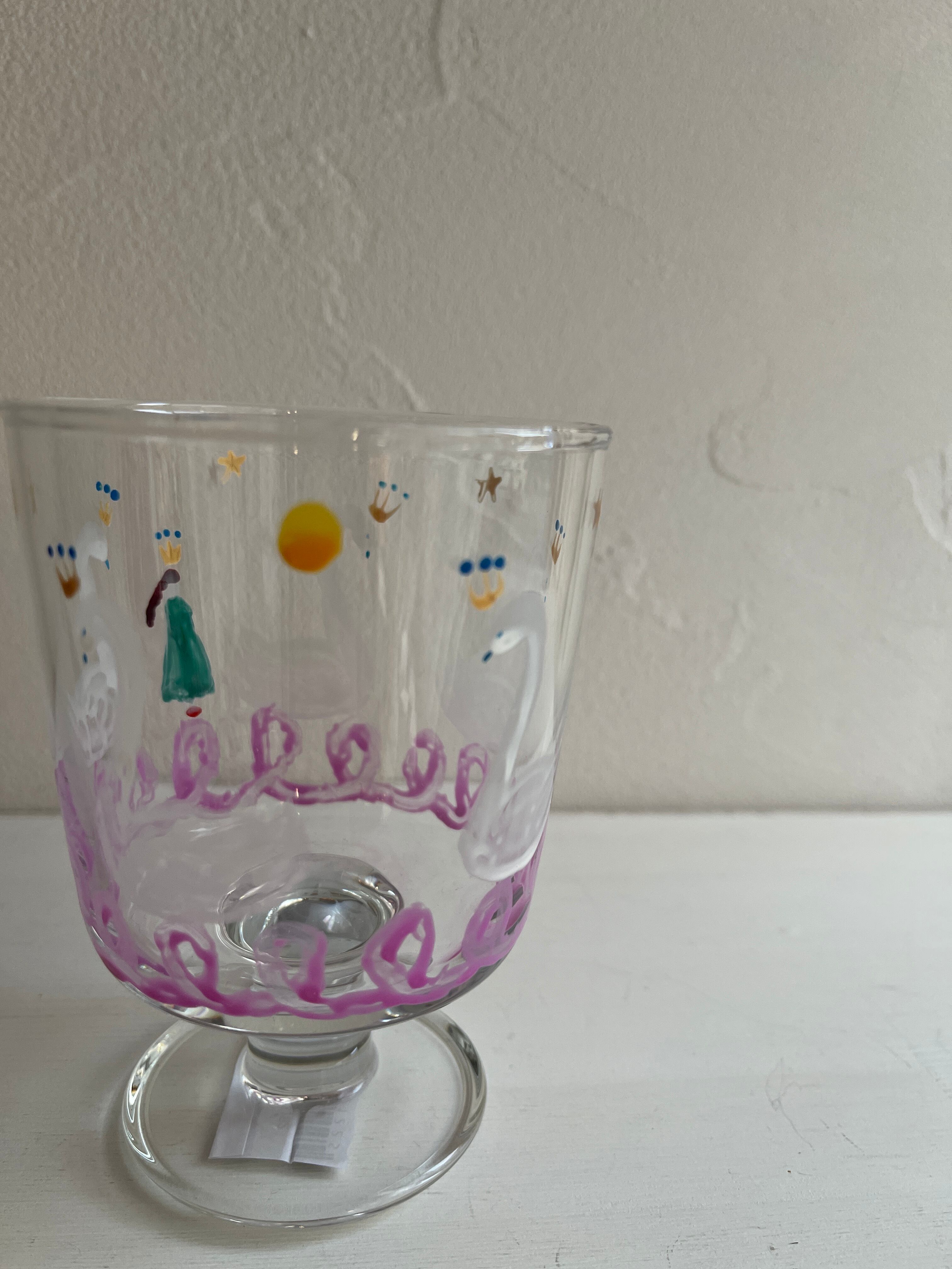 TOKITUGI さんの手書きの1点ものゴブレットグラスです。王冠をつけたスワンたちがピンクの波の上で踊っているような世界。王冠をつけた小さな女の子のデザインも。様々な飲み物を入れると、グラスの世界観が変わります。アイスクリームやデザート、野菜スティック等食材をいれても〇持ちやすいグラスで安定感あり。比較的割れにくいガラスのタイプなので、小さなお子様でも使いやすいグラスです。贈り物にも喜ばれています。