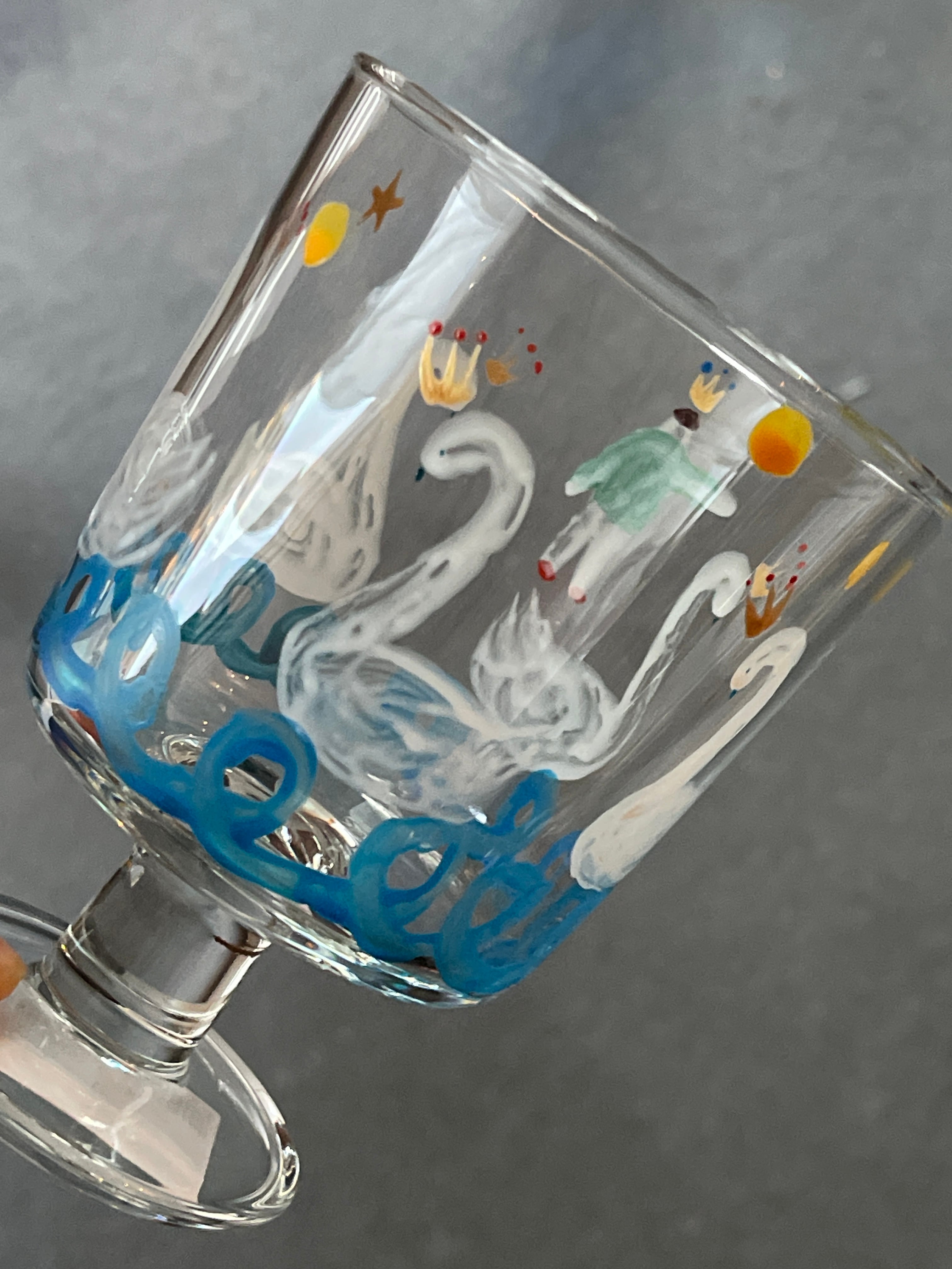 TOKITUGI さんの手書きの1点ものゴブレットグラスです。王冠をつけた白鳥たちが波の上で踊っているようなデザイン。小さな王冠をつけた男の子も。様々な飲み物を入れると、グラスの世界観が変わります。アイスクリームやデザート、野菜スティック等食材をいれても〇持ちやすいグラスで安定感あり。比較的割れにくいガラスのタイプなので、小さなお子様でも使いやすいグラスです。贈り物にも喜ばれています。