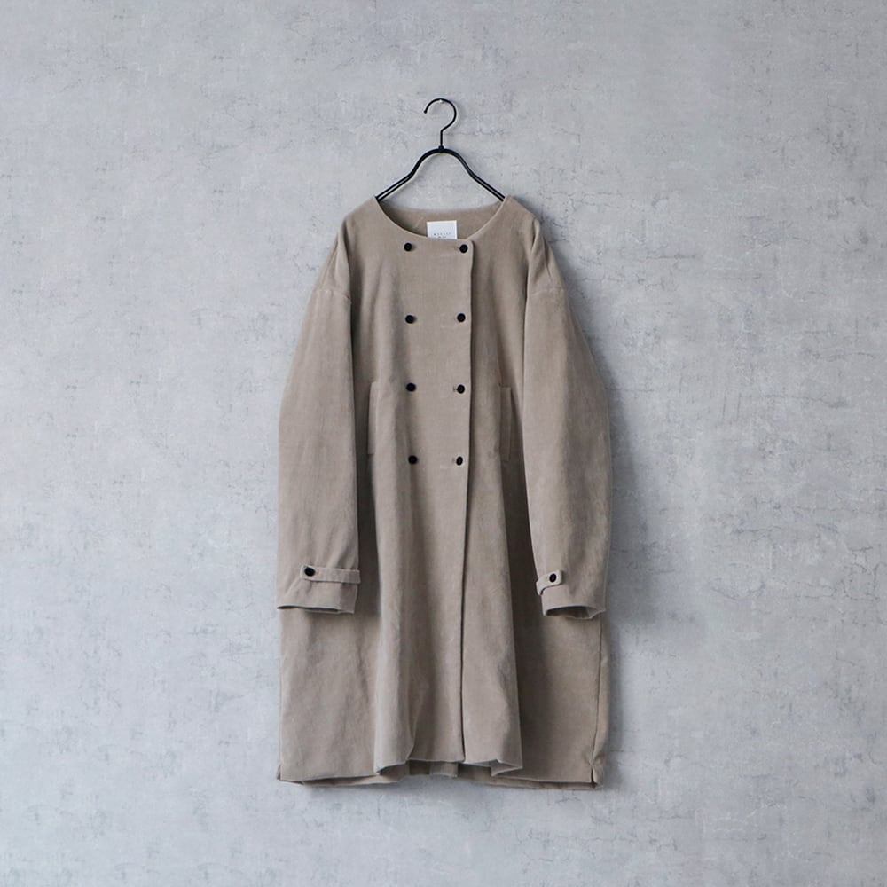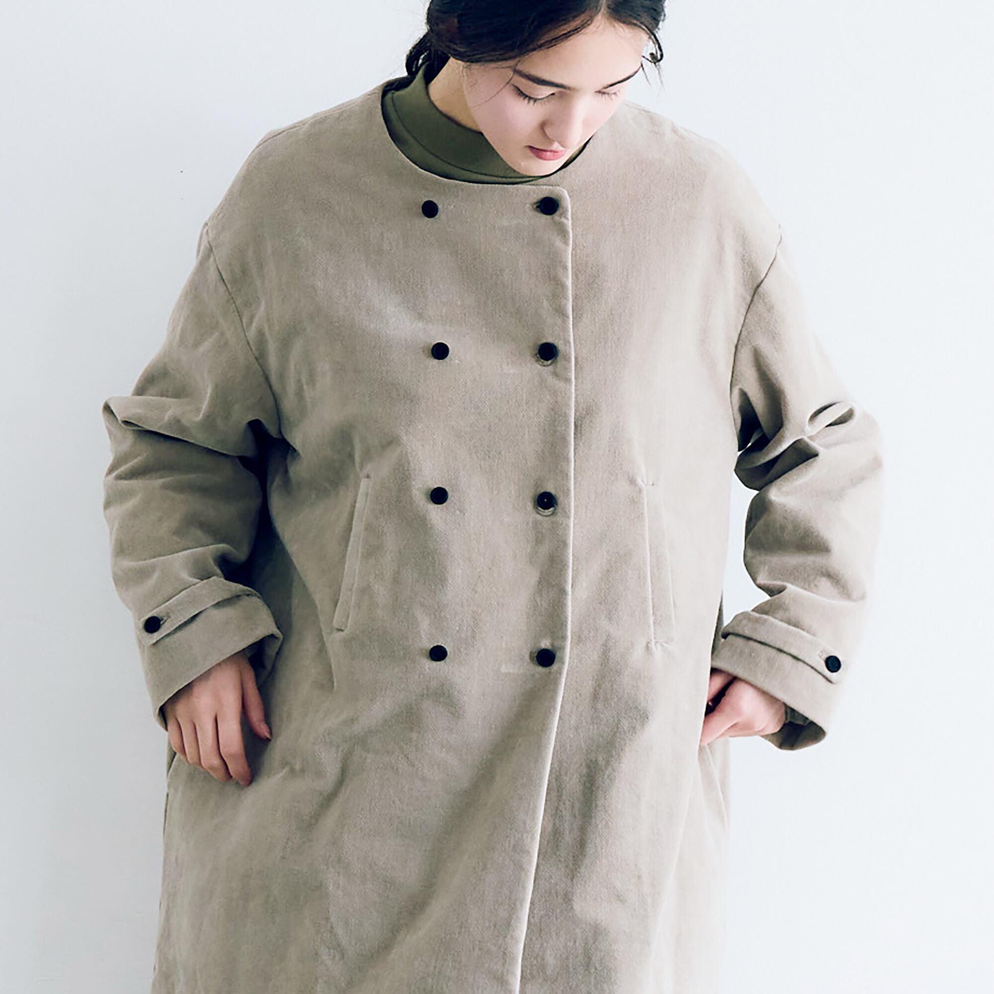 ダブルボタンのノーカラーコートはゆったりとオーバーサイズ気味ながら、
