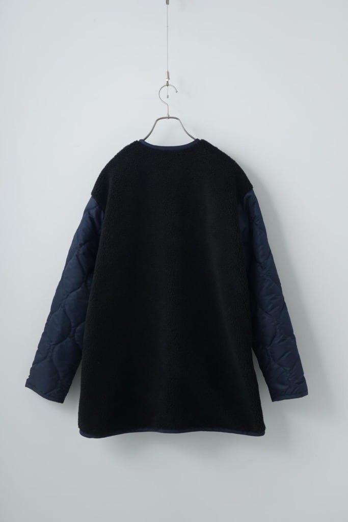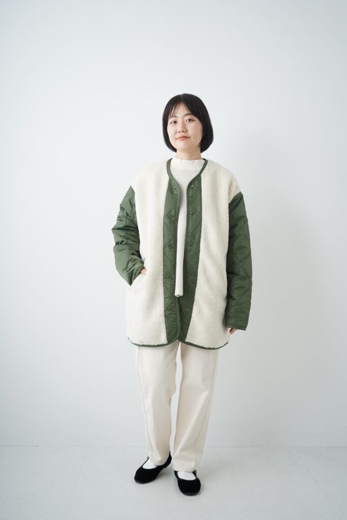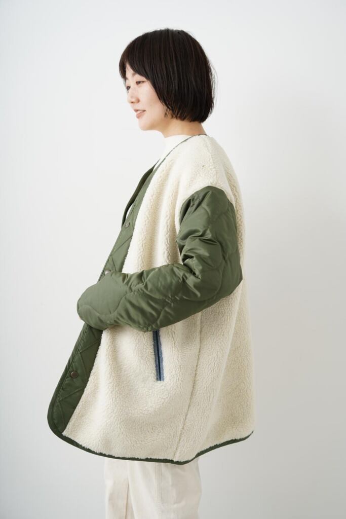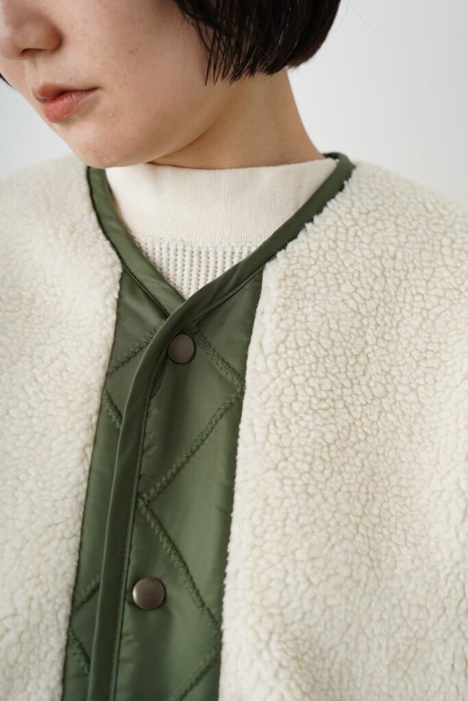 暖かみのあるボアと大人カジュアルな雰囲気を持つナイロンキルトを組み合わせた、重くない軽めのライナーコート。使いやすいハーフ丈コートで身頃にはボア、袖を始めとした部分的にナイロンキルトを使用することによって異素材の変化を楽しむことが出来ます。アームホールに身幅といった、着用した際に気になるところにはゆとりを持たせ、中にトップス類を着込みやすくしています。お尻周りをすっぽりと覆う安心感のある着丈の長さを保ちながらも、長すぎないので小回りの利く動きやすさも忘れずに。ポケット口のデニムは、身頃のカラーによって加工の色が違いさりげないアクセント的な存在です。コーディネートの主役になる1着、この秋冬にオススメのコートです。