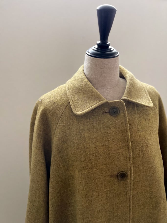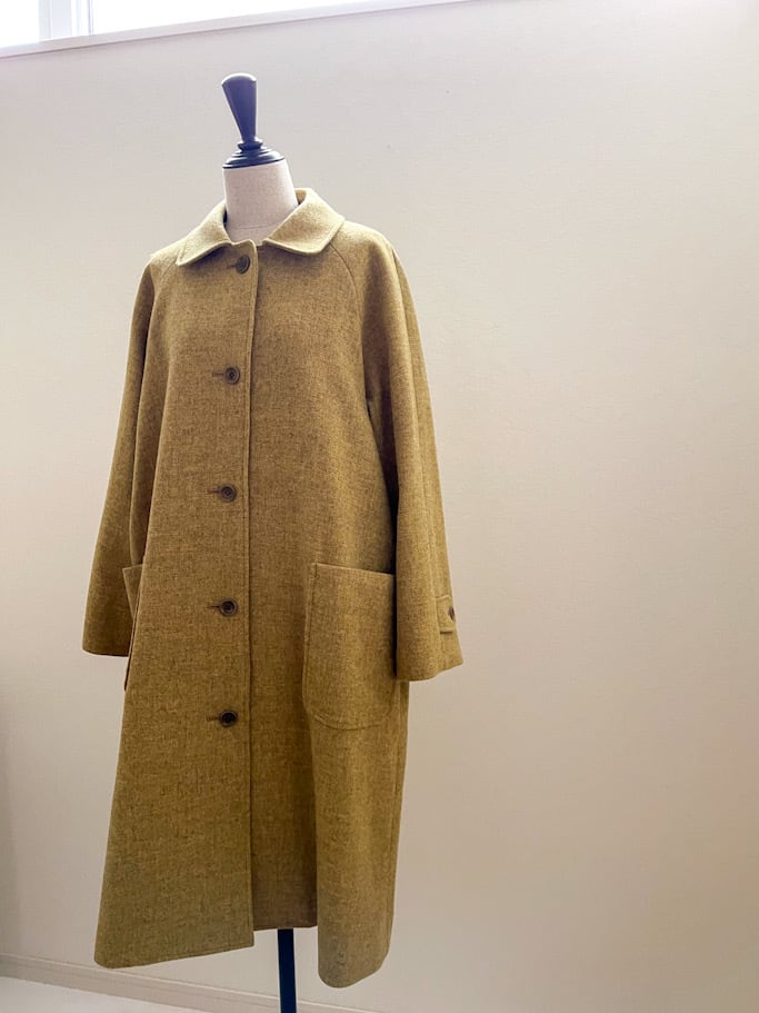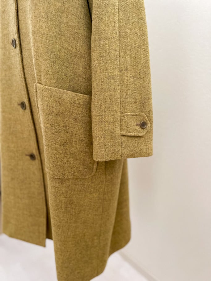 ヘリンボーン生地で、落ち着いたイエロー系のコート。