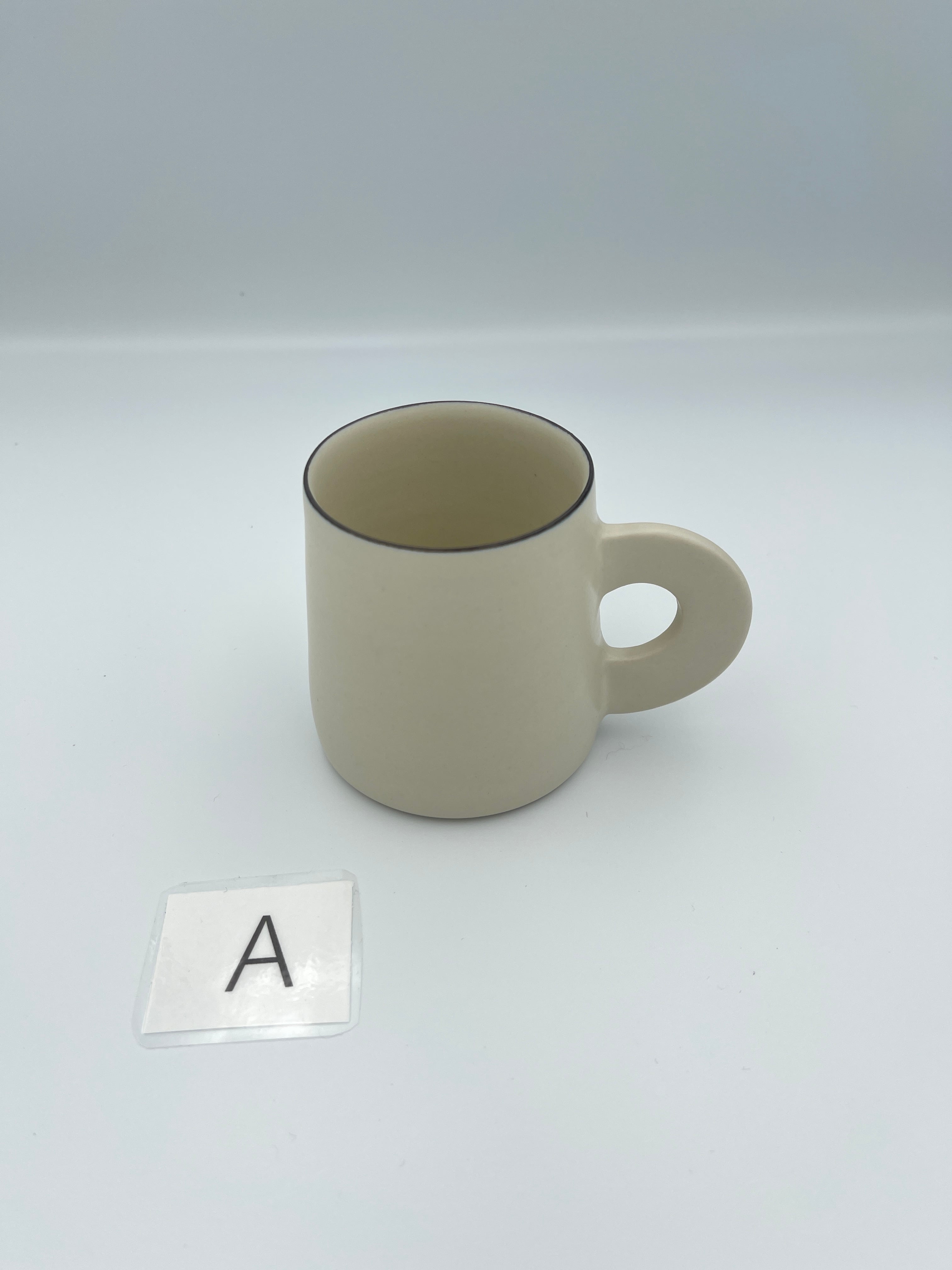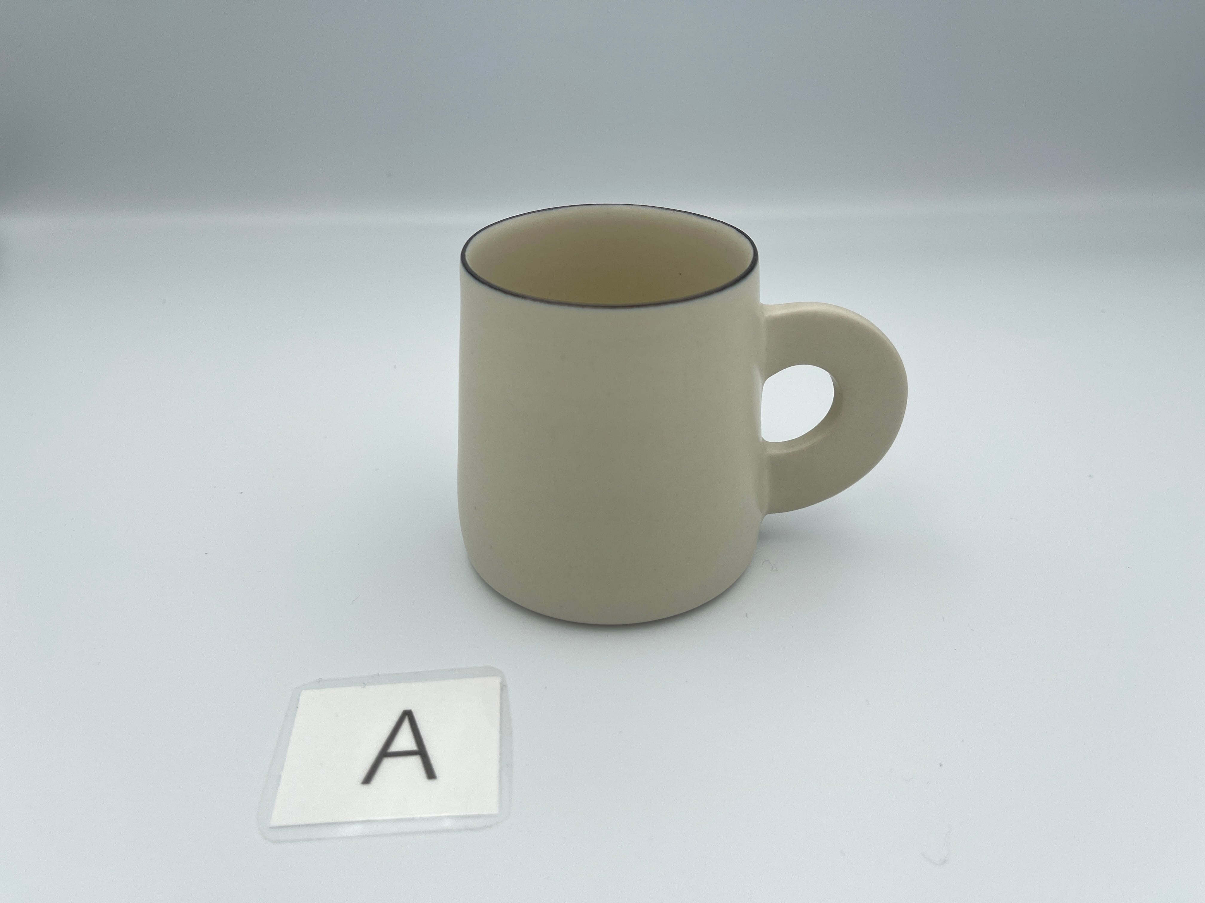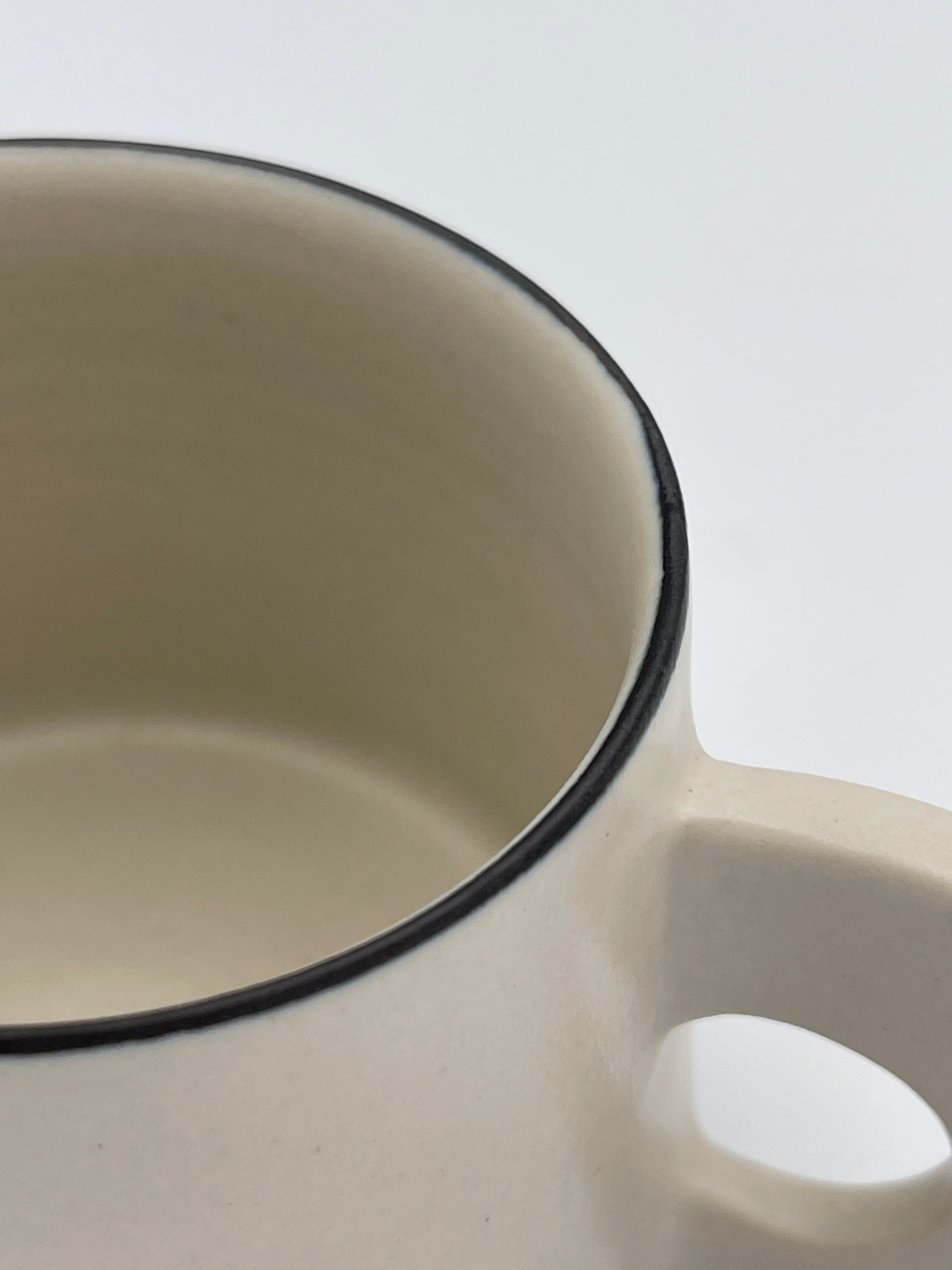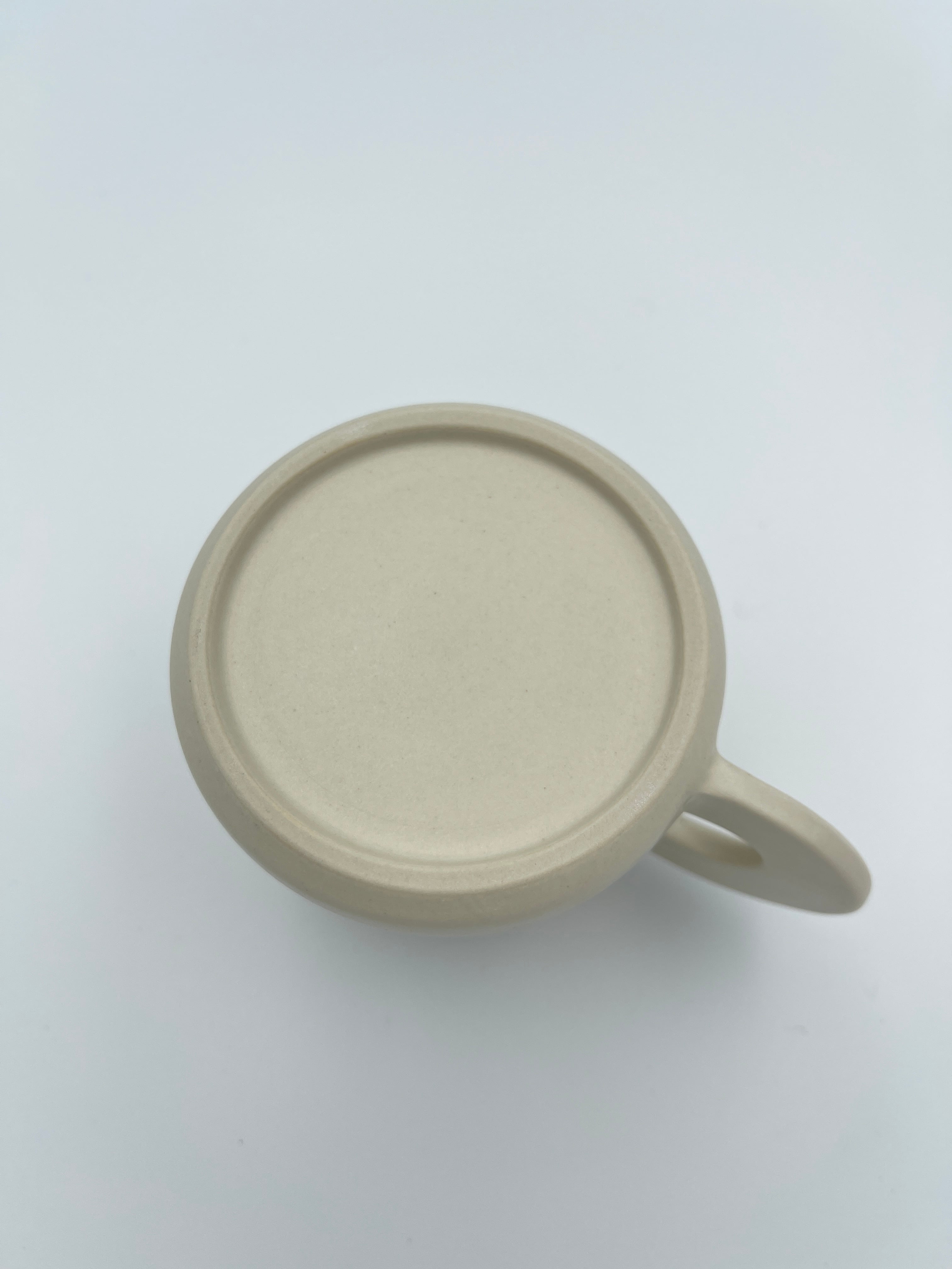シンプルなフォルムに、持ち手がくるんと平たくて丸い可愛らしいマグカップです。縁の部分はごく細い黒いライン(呉須まき)が付けられています。口当たりはとても良いので味覚が際立ち、お茶が美味しく感じられます。
