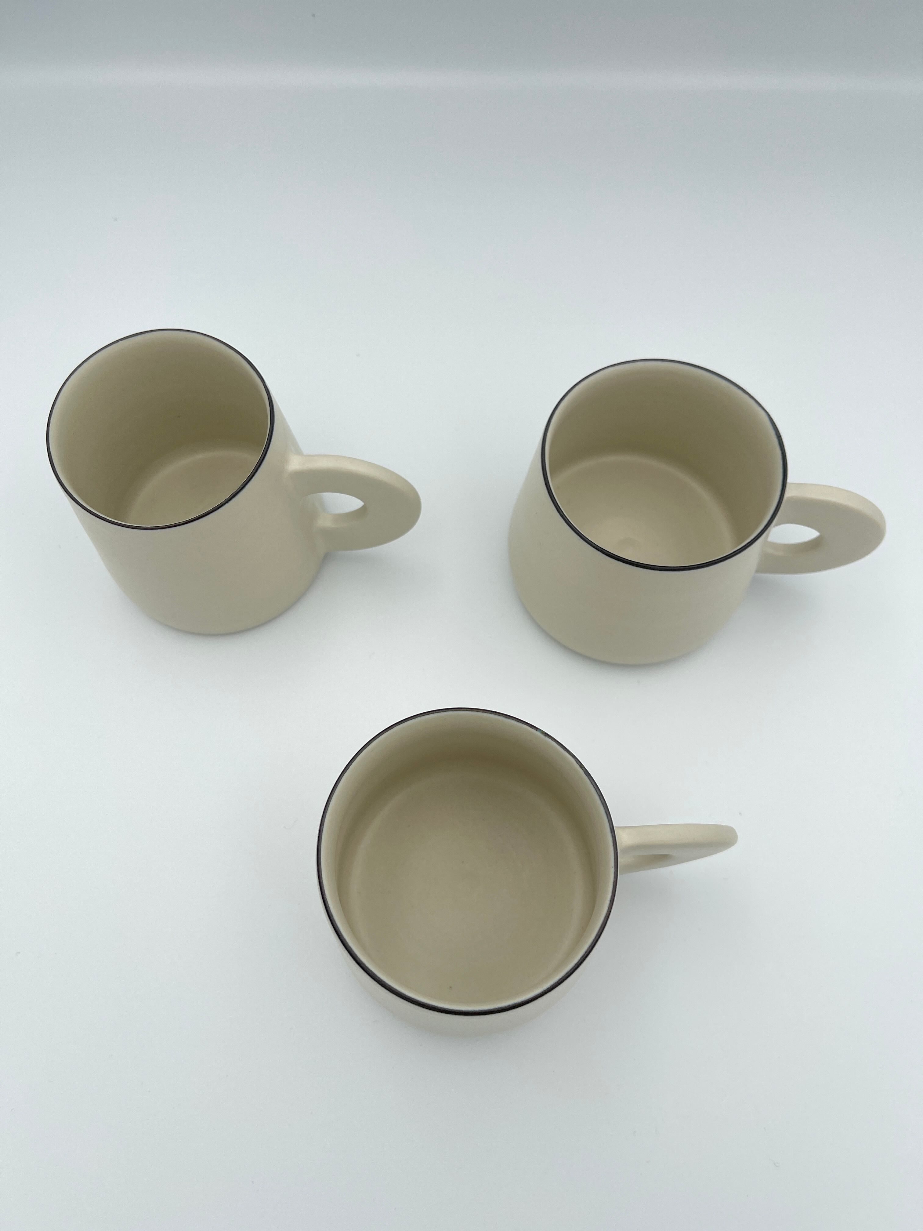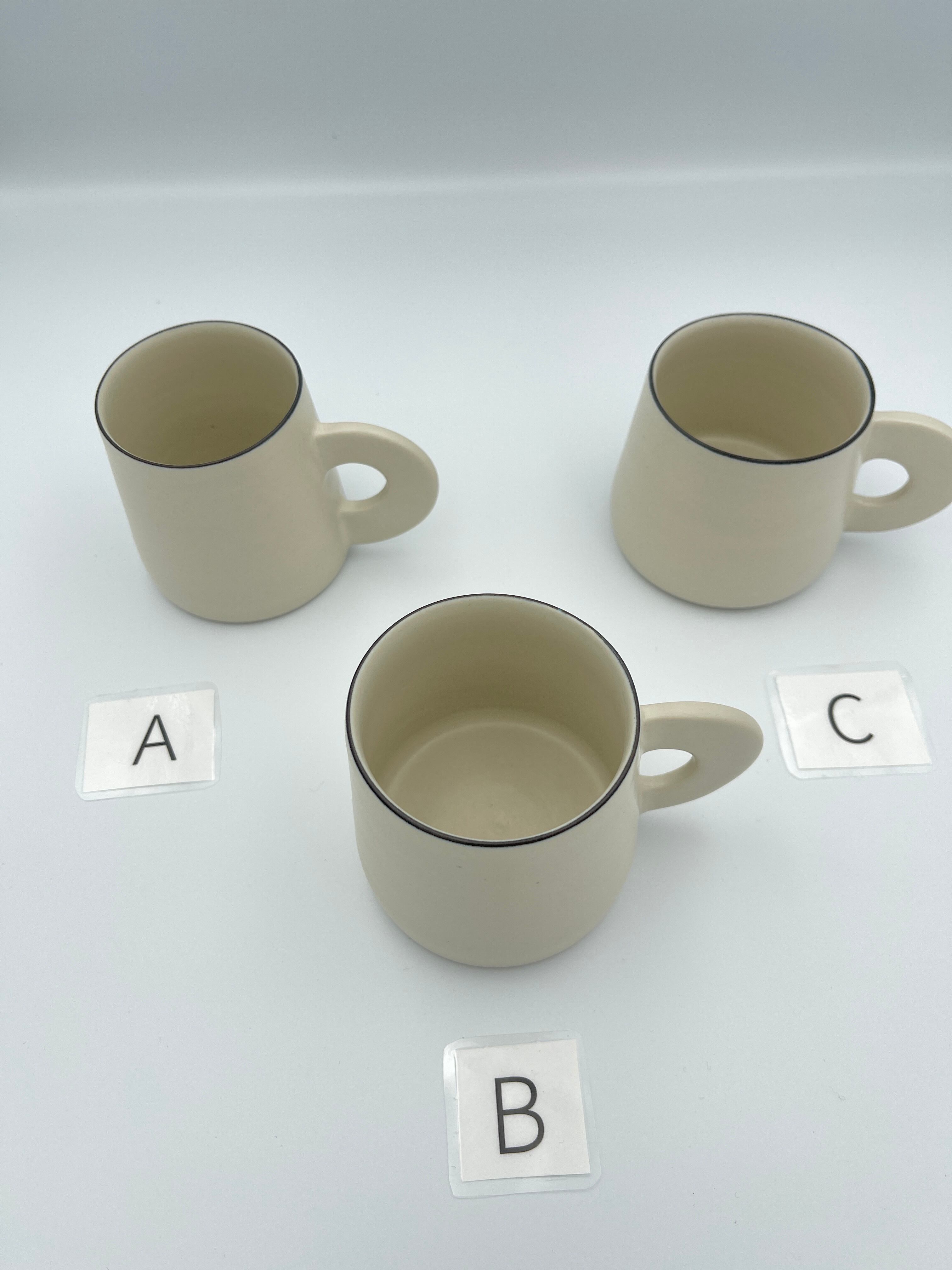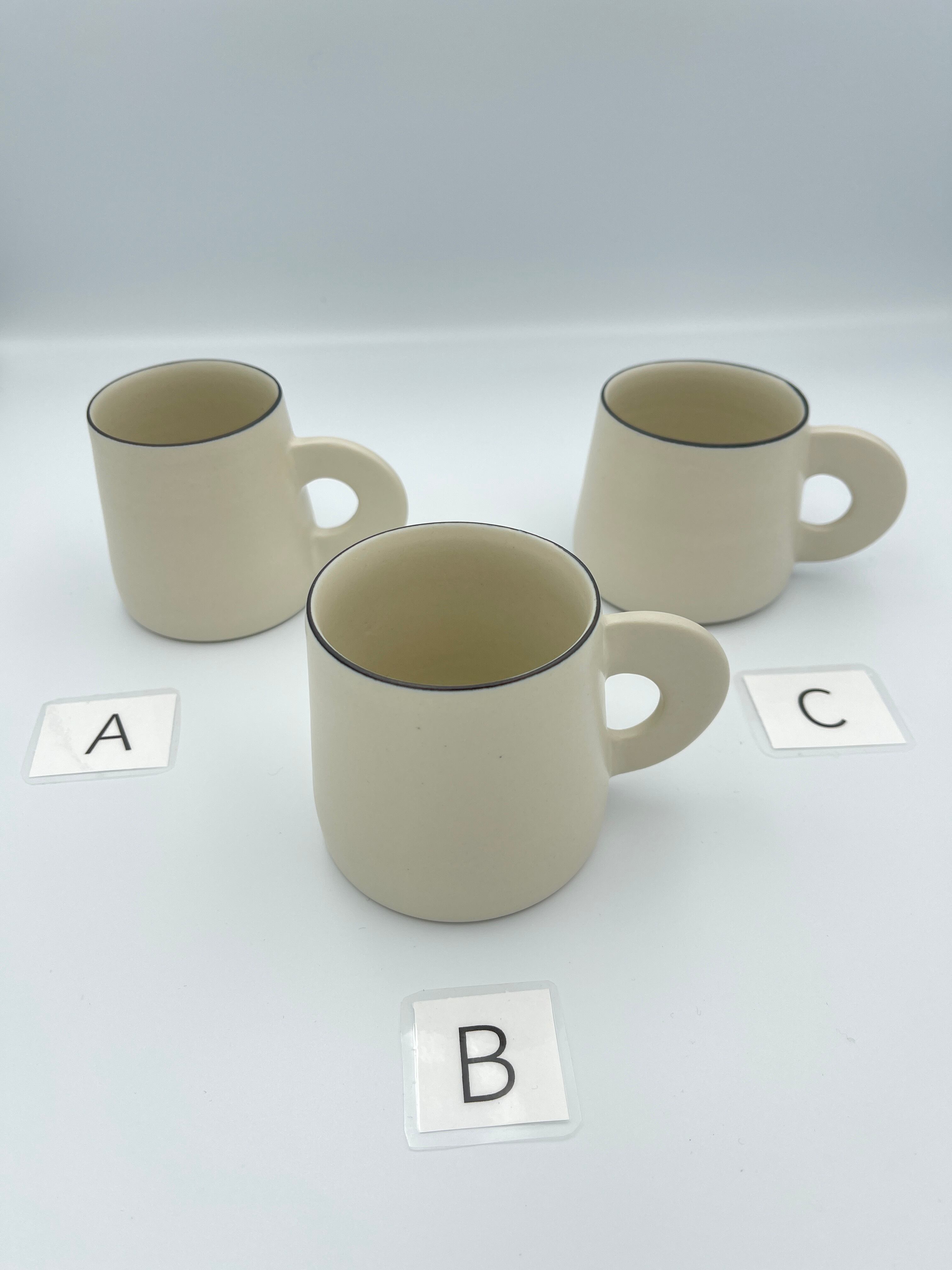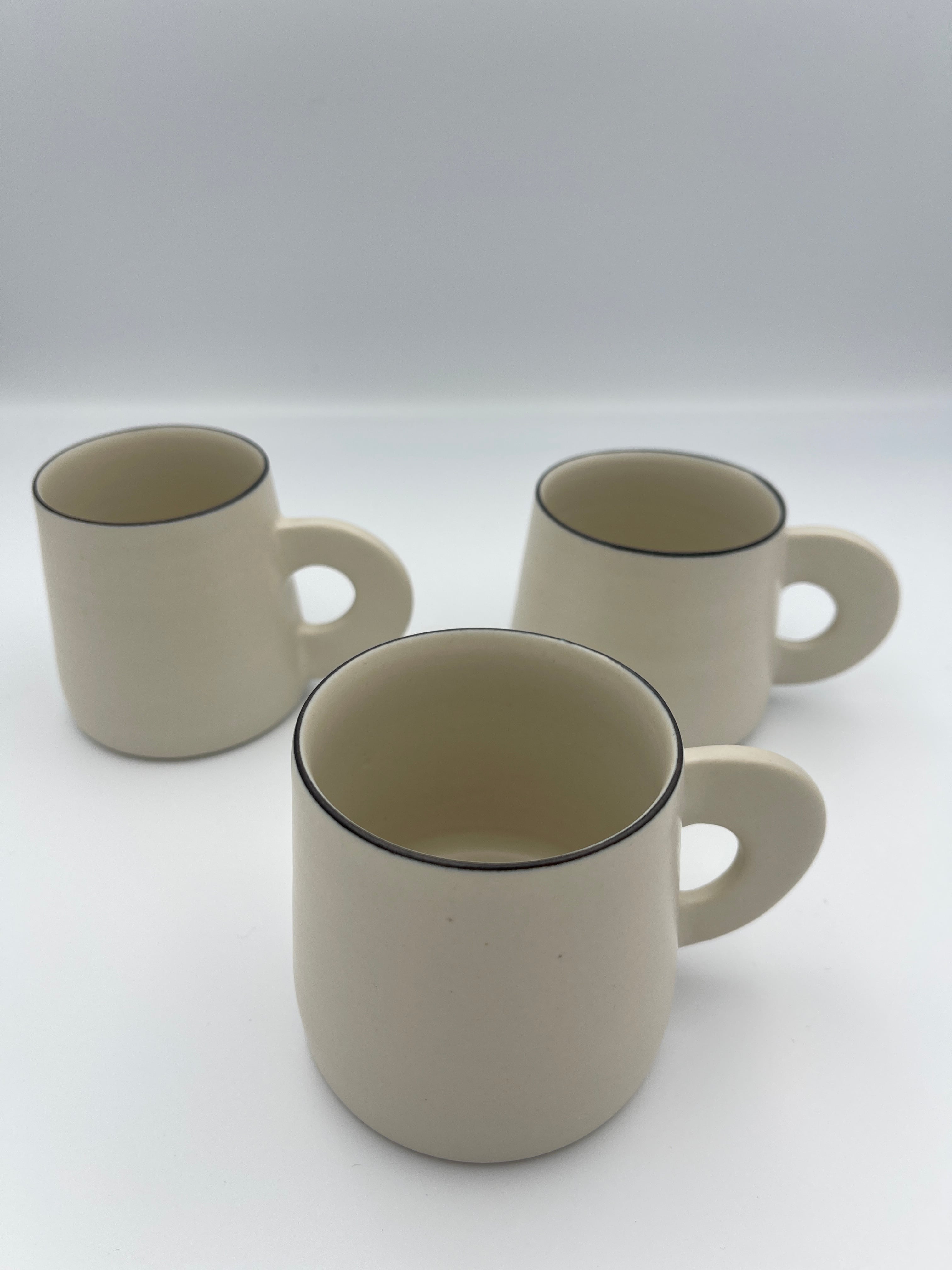 シンプルなフォルムに、持ち手がくるんと平たくて丸い可愛らしいマグカップです。縁の部分はごく細い黒いライン(呉須まき)が付けられています。口当たりはとても良いので味覚が際立ち、お茶が美味しく感じられます。