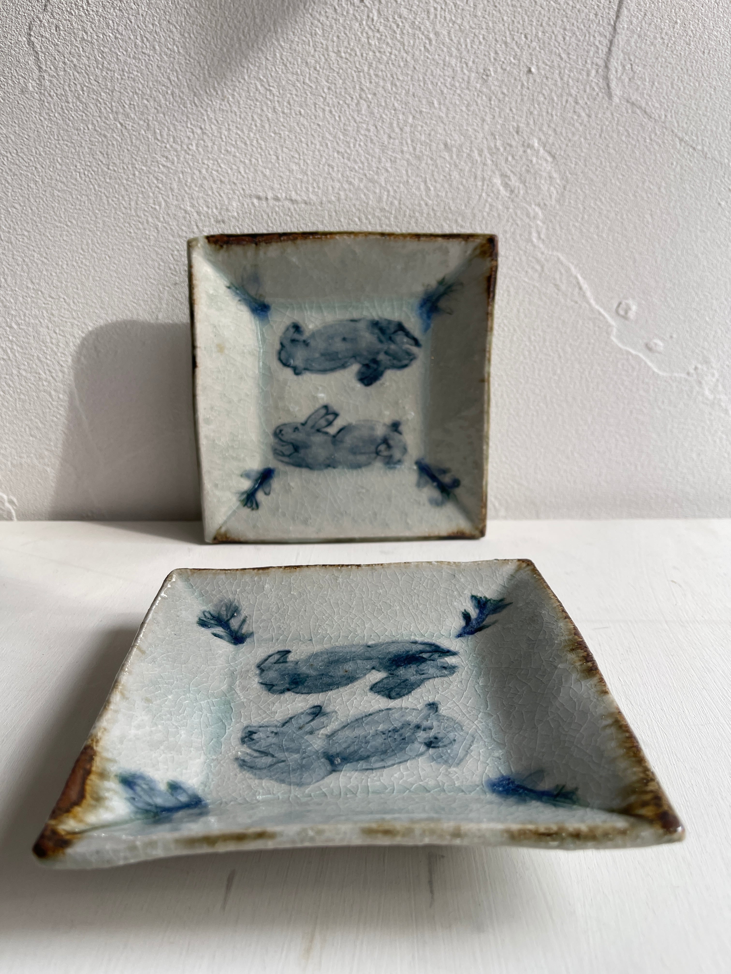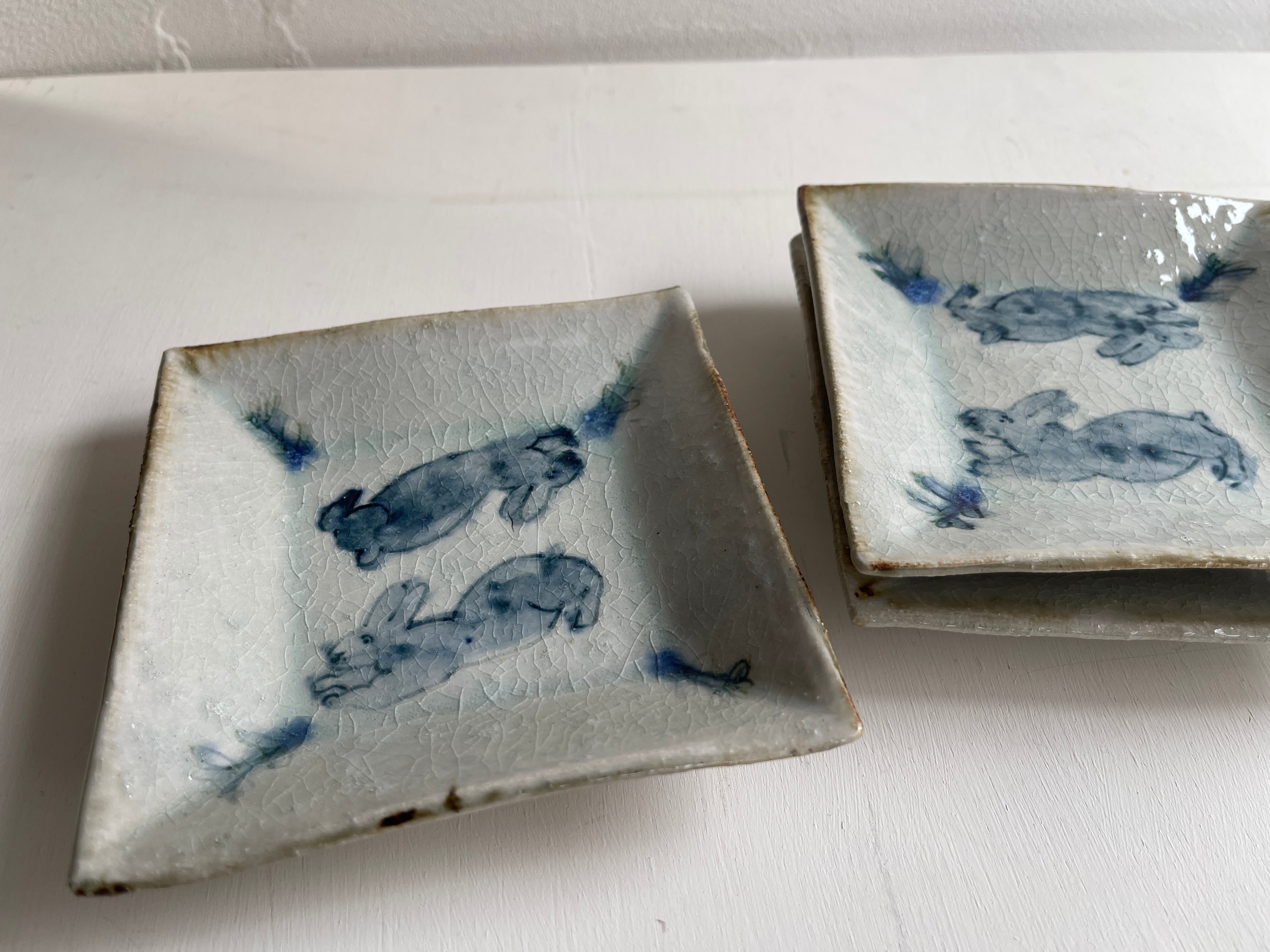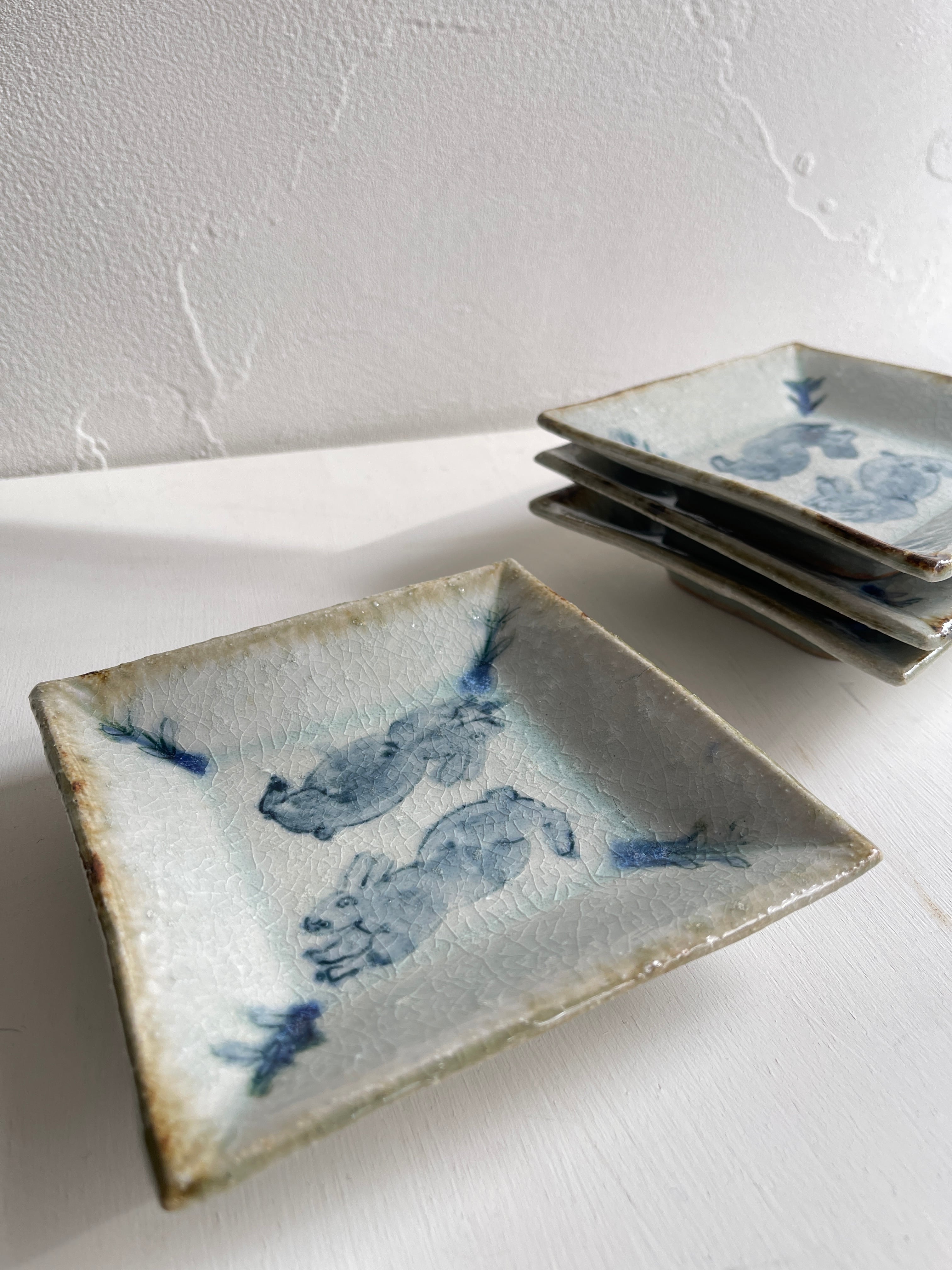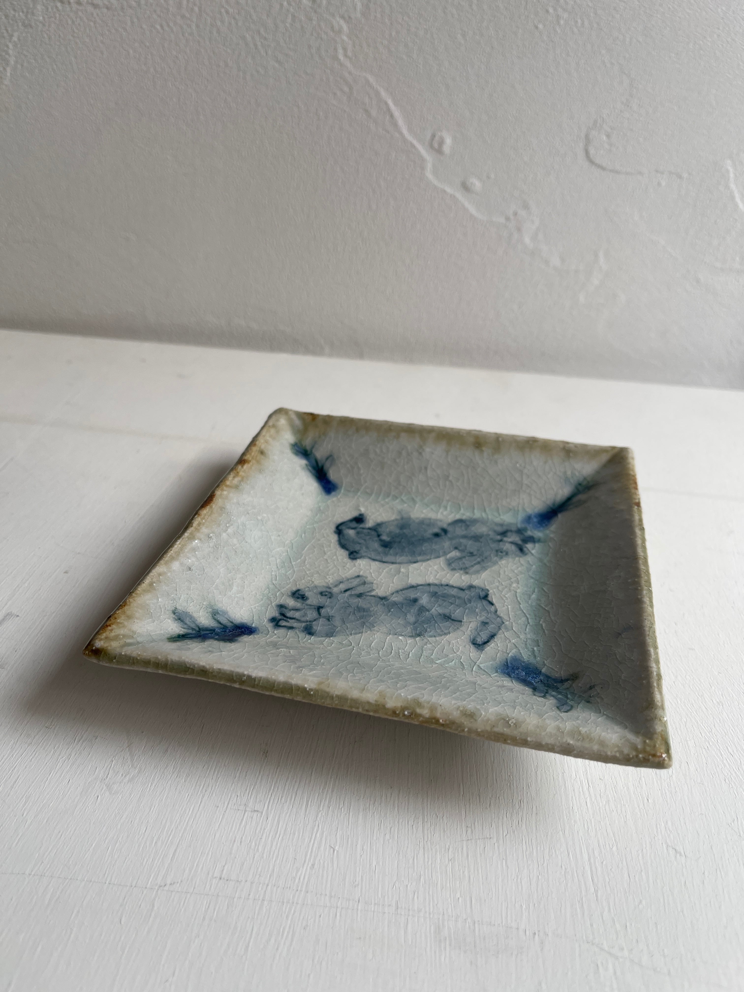 呉須でウサギが描かれた四角い鉢です。やや立ち上がりがある皿は、重ねやすく取りやすい形状で、小さすぎず大きすぎず万能に使えるサイズです。取り皿、小皿、デザート皿、おかず皿など。ぜひとも枚数をそろえておきたい作品です。