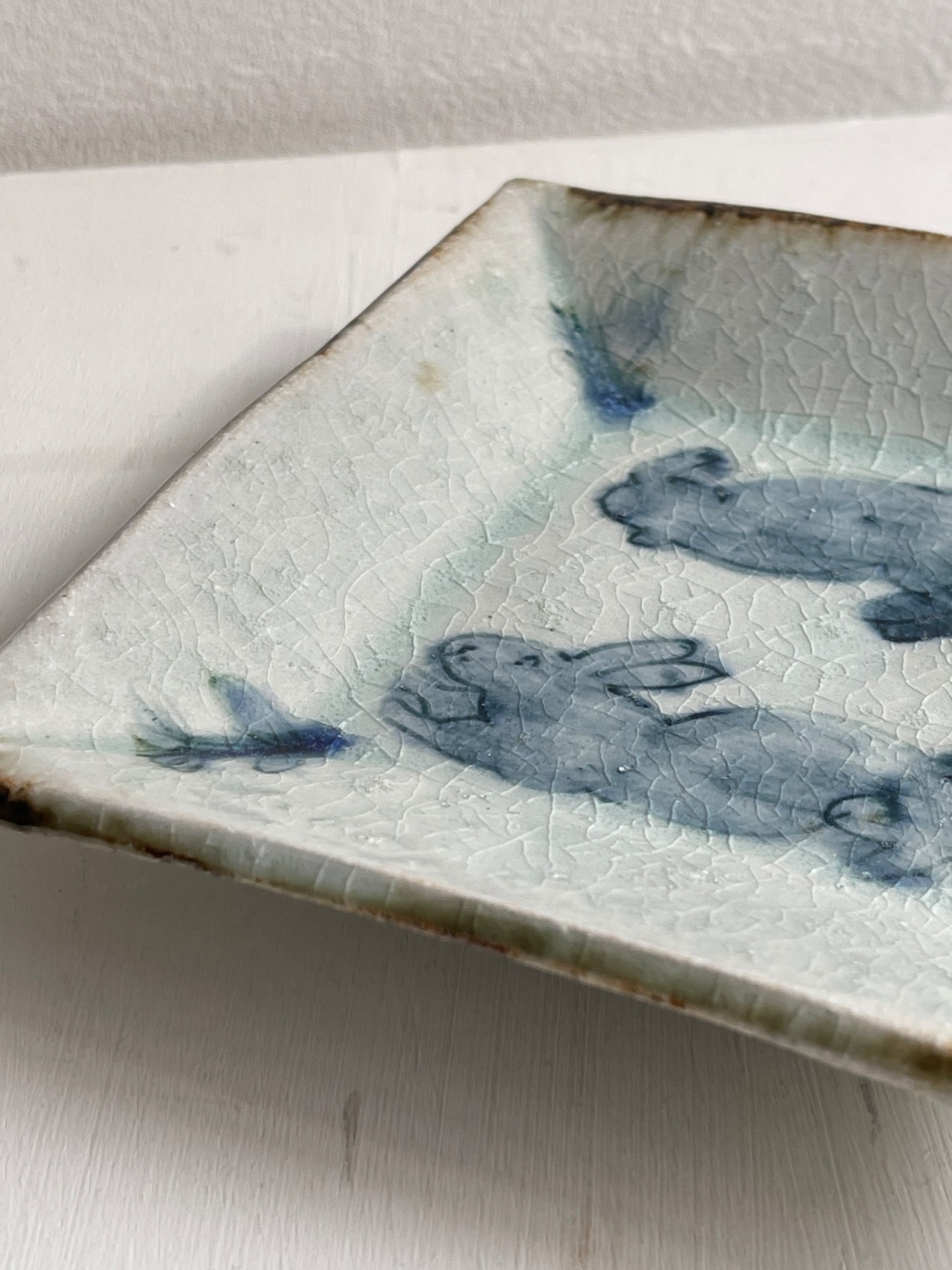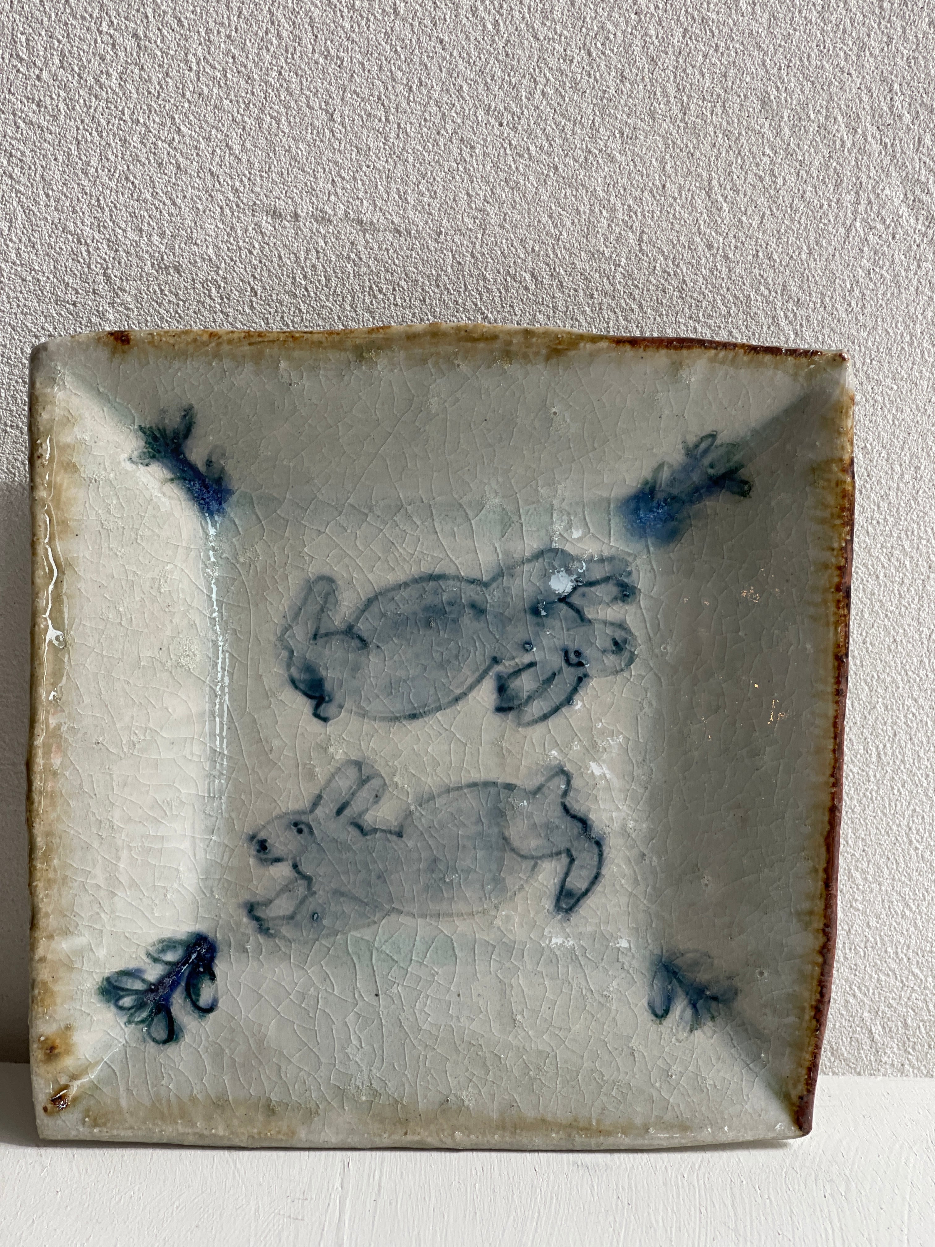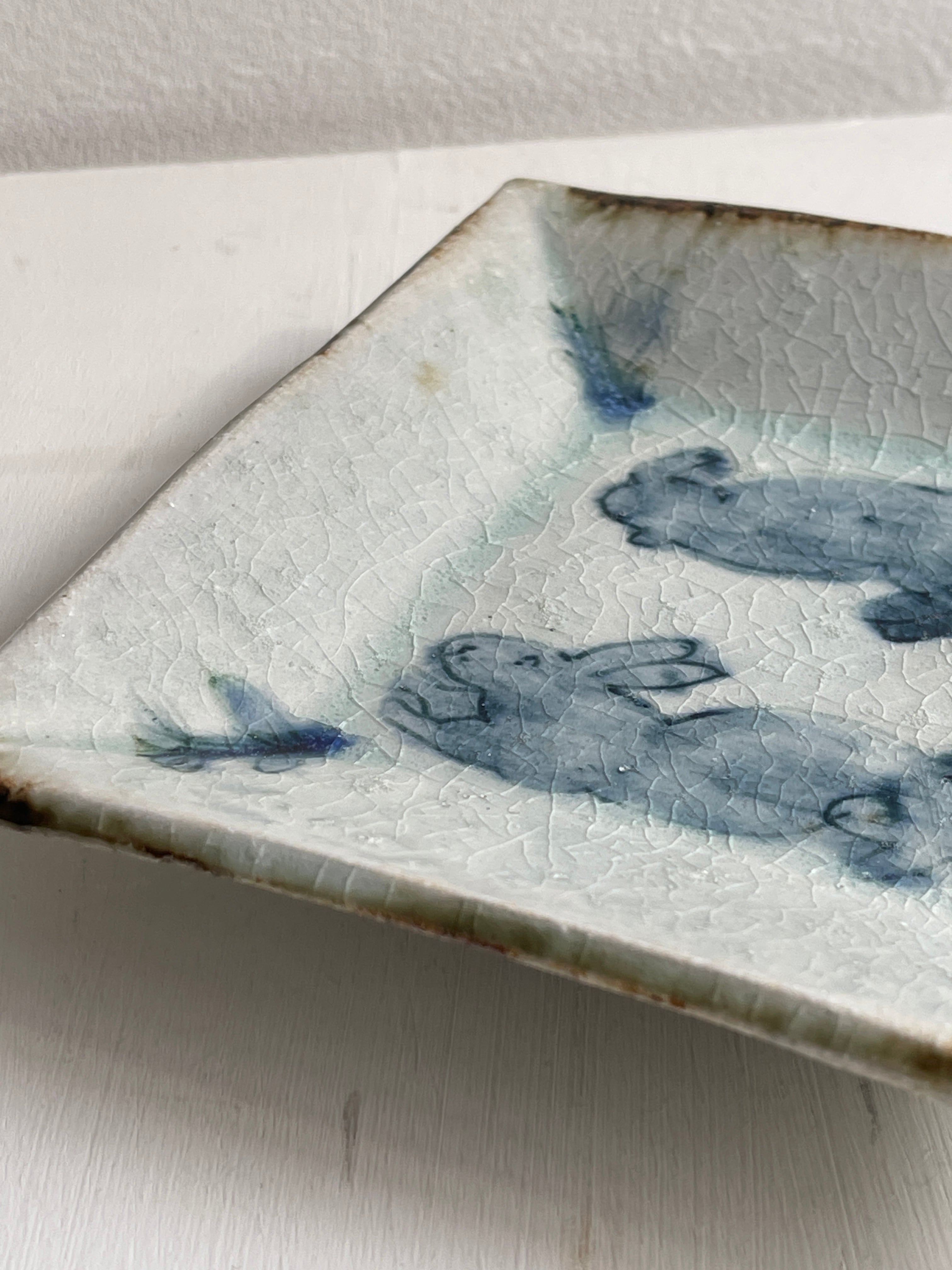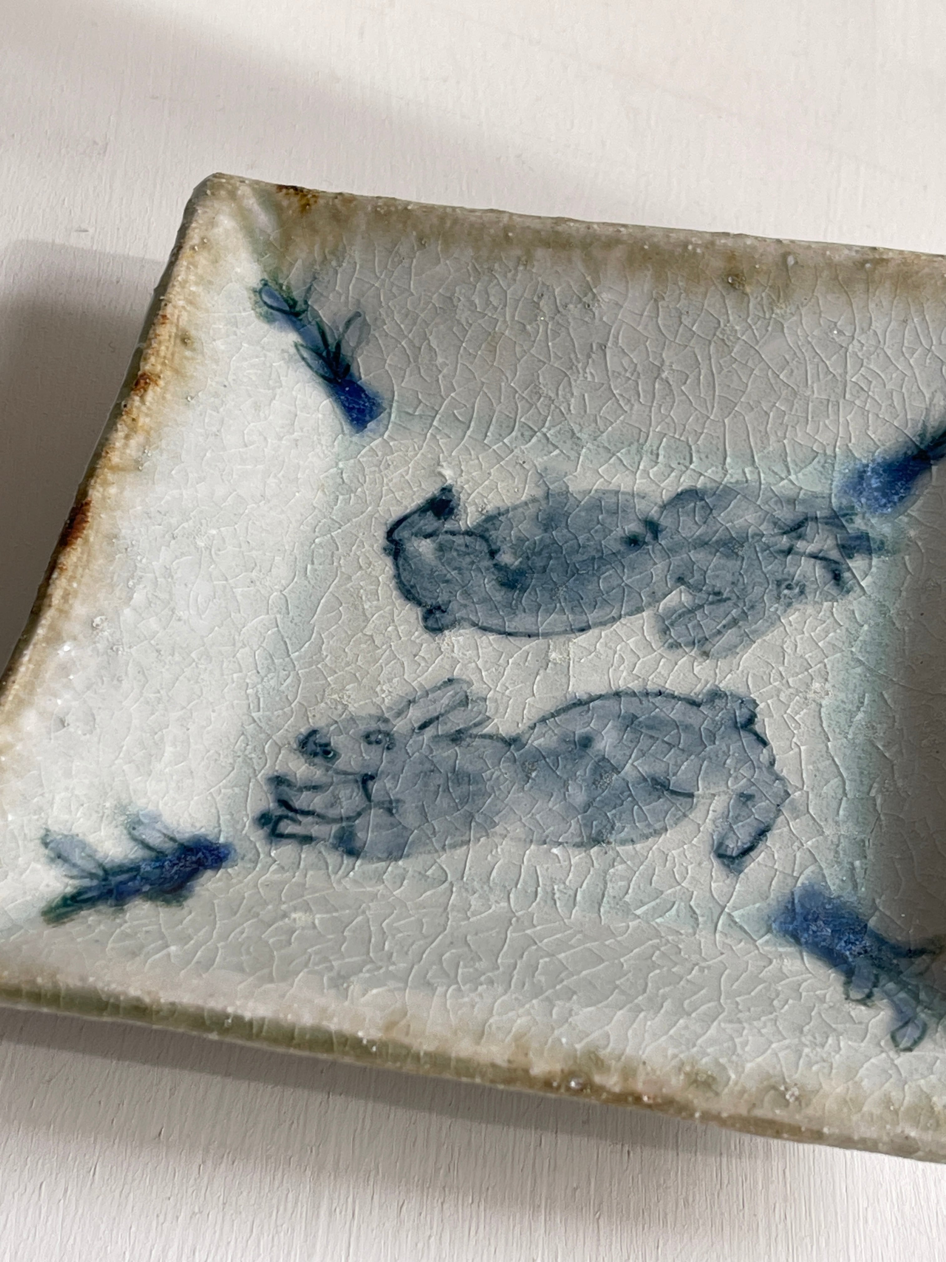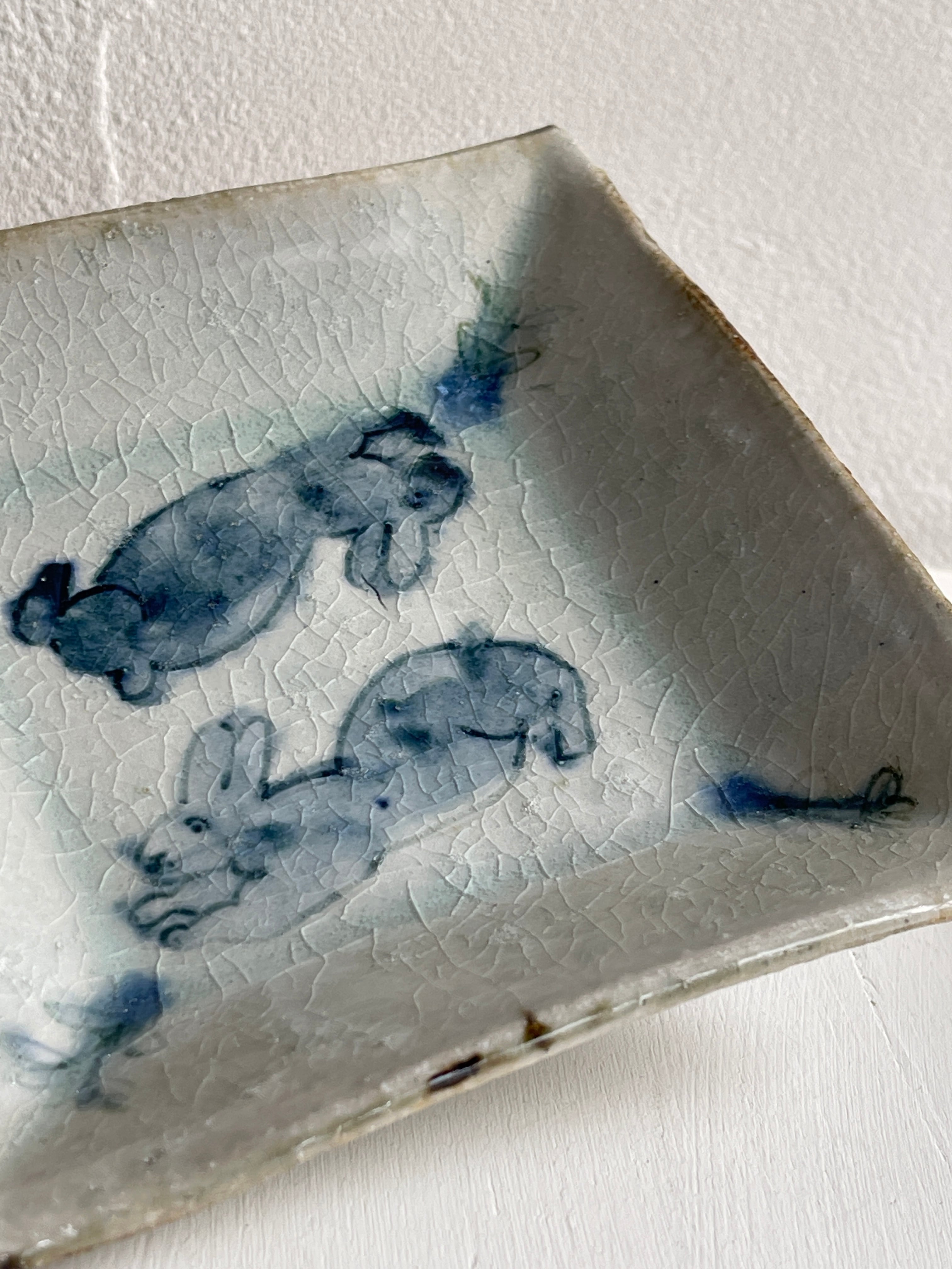 呉須でウサギが描かれた四角い鉢です。やや立ち上がりがある皿は、重ねやすく取りやすい形状で、小さすぎず大きすぎず万能に使えるサイズです。取り皿、小皿、デザート皿、おかず皿など。ぜひとも枚数をそろえておきたい作品です。