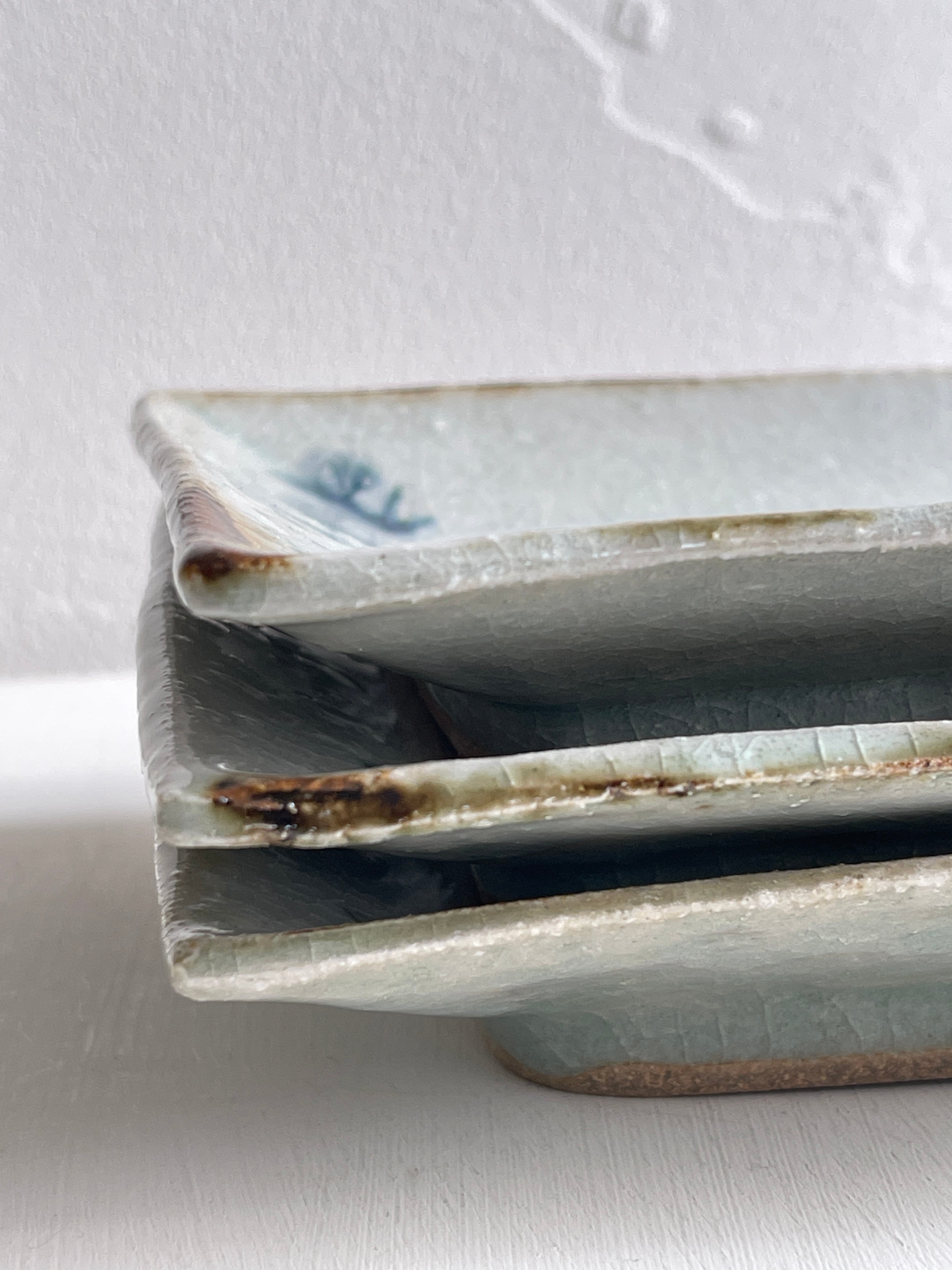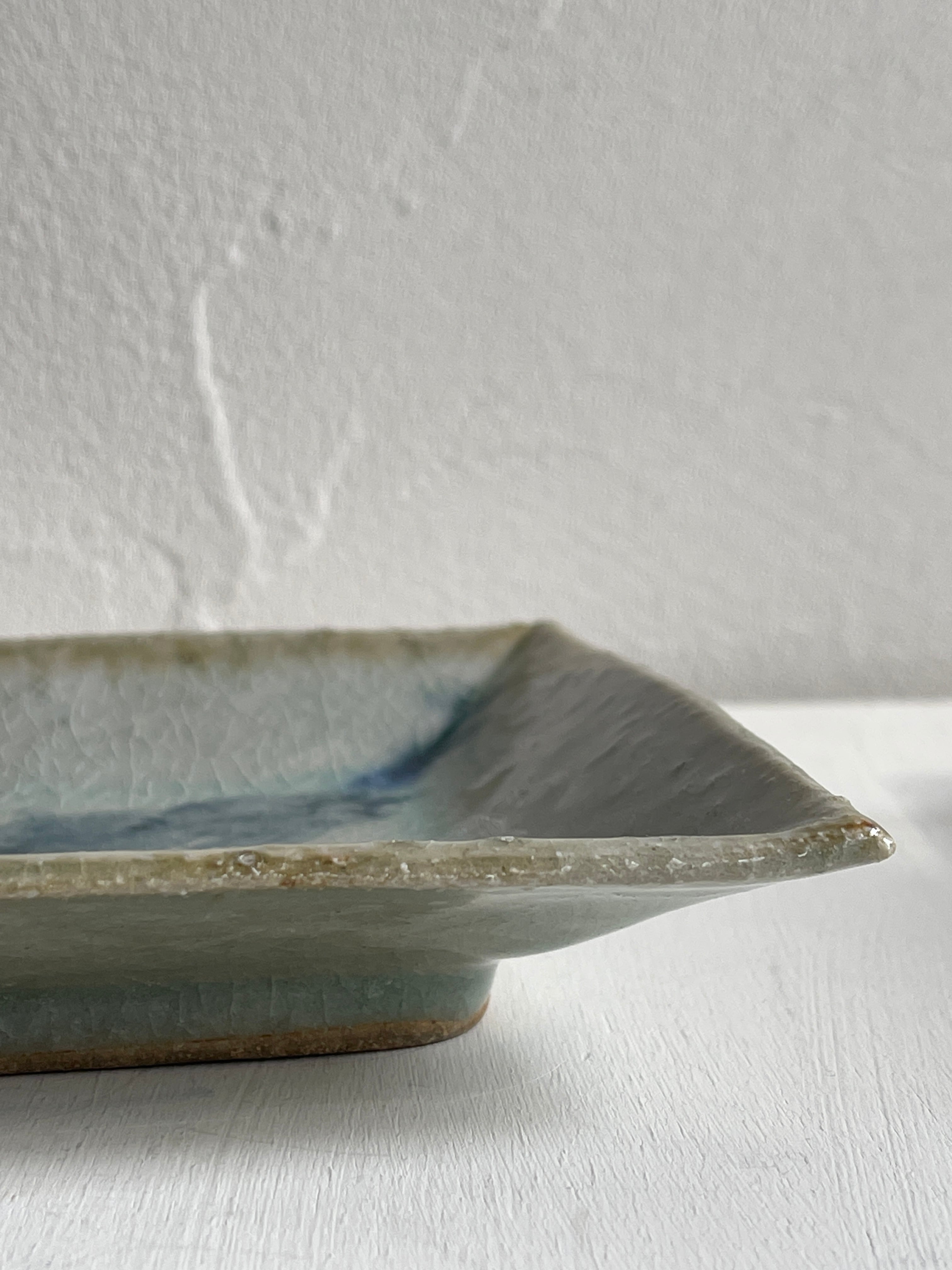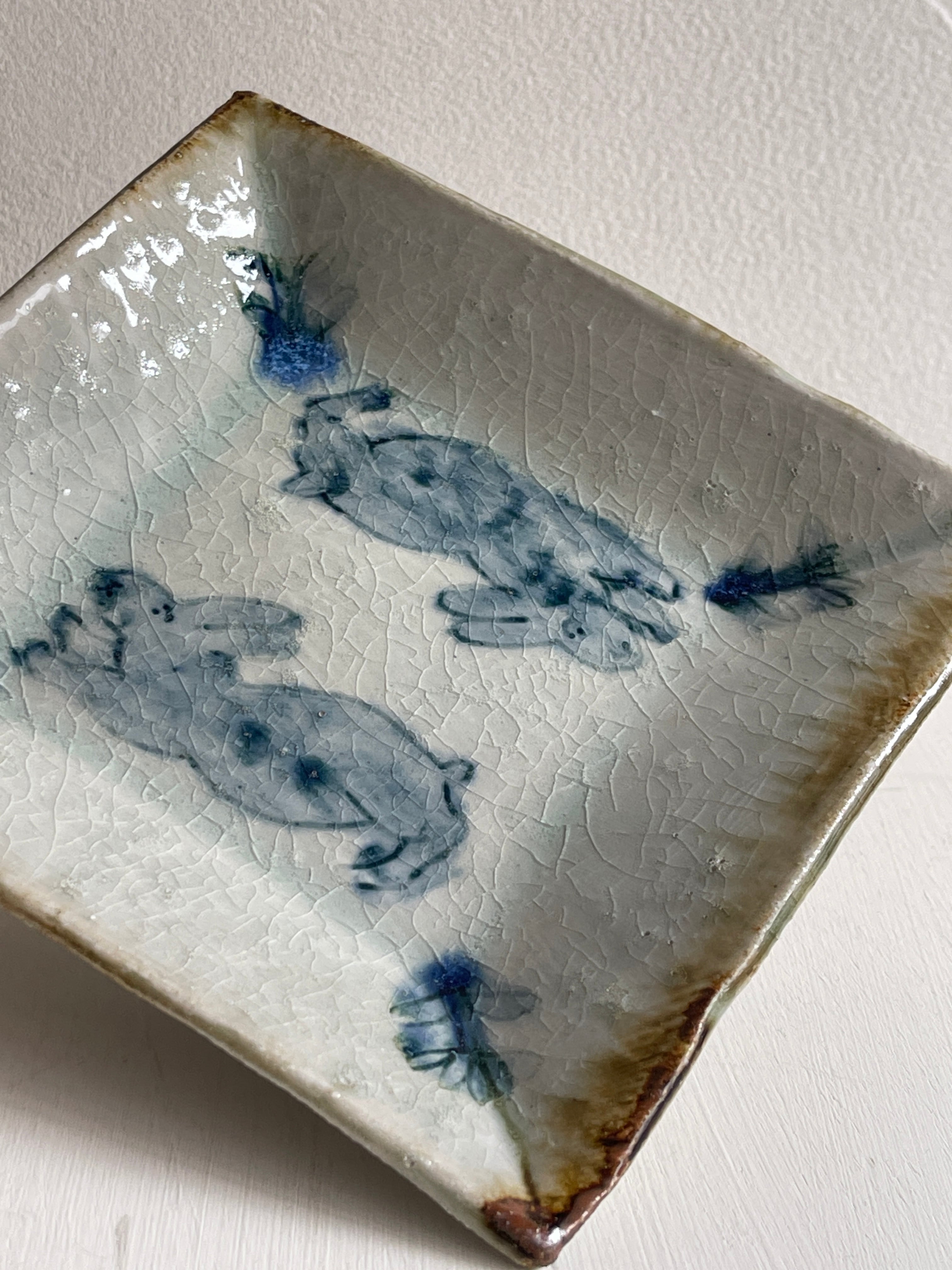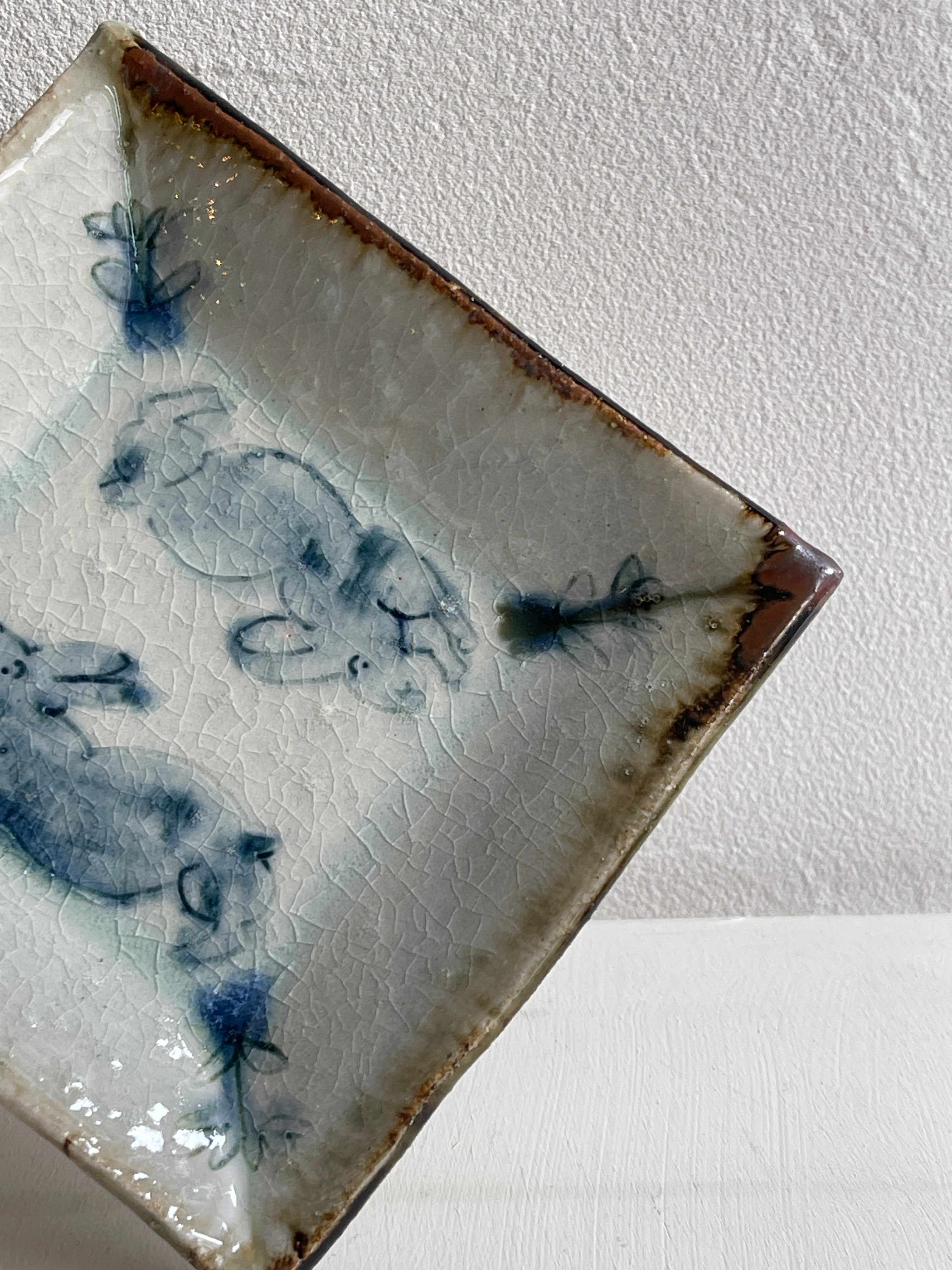 呉須でウサギが描かれた四角い鉢です。やや立ち上がりがある皿は、重ねやすく取りやすい形状で、小さすぎず大きすぎず万能に使えるサイズです。取り皿、小皿、デザート皿、おかず皿など。ぜひとも枚数をそろえておきたい作品です。