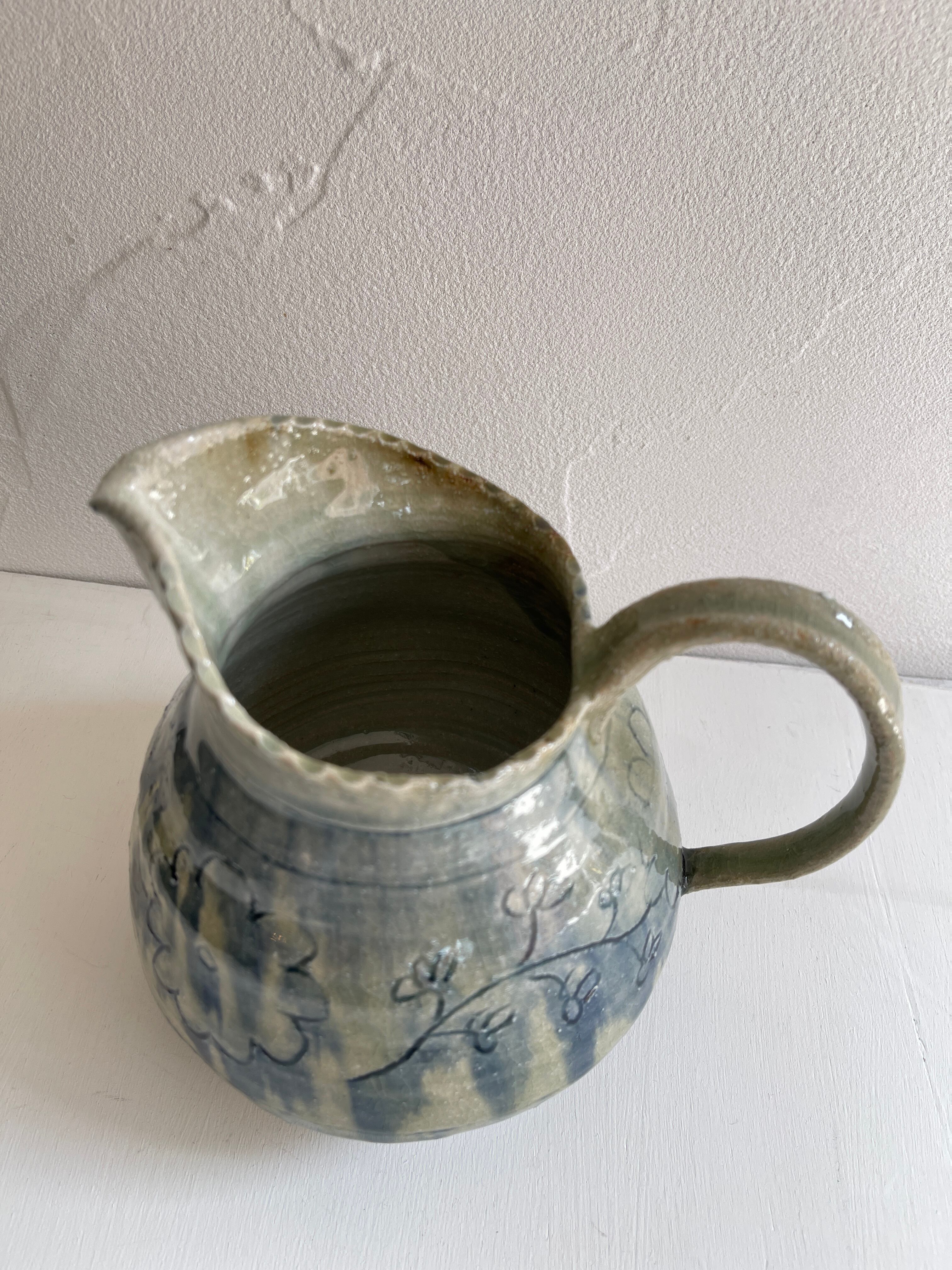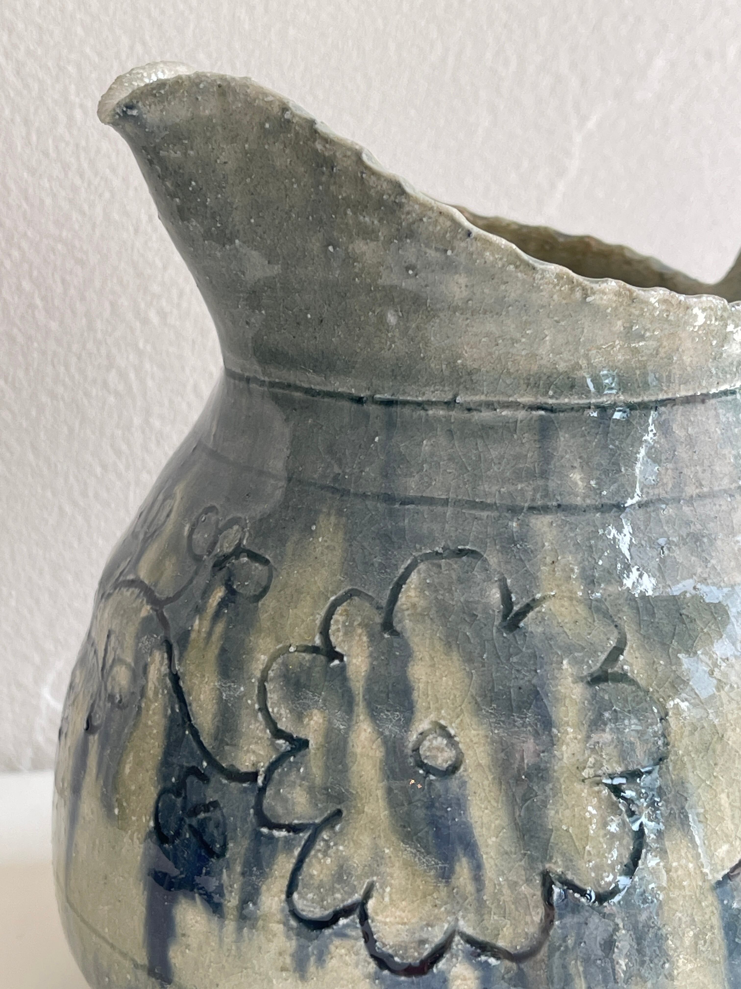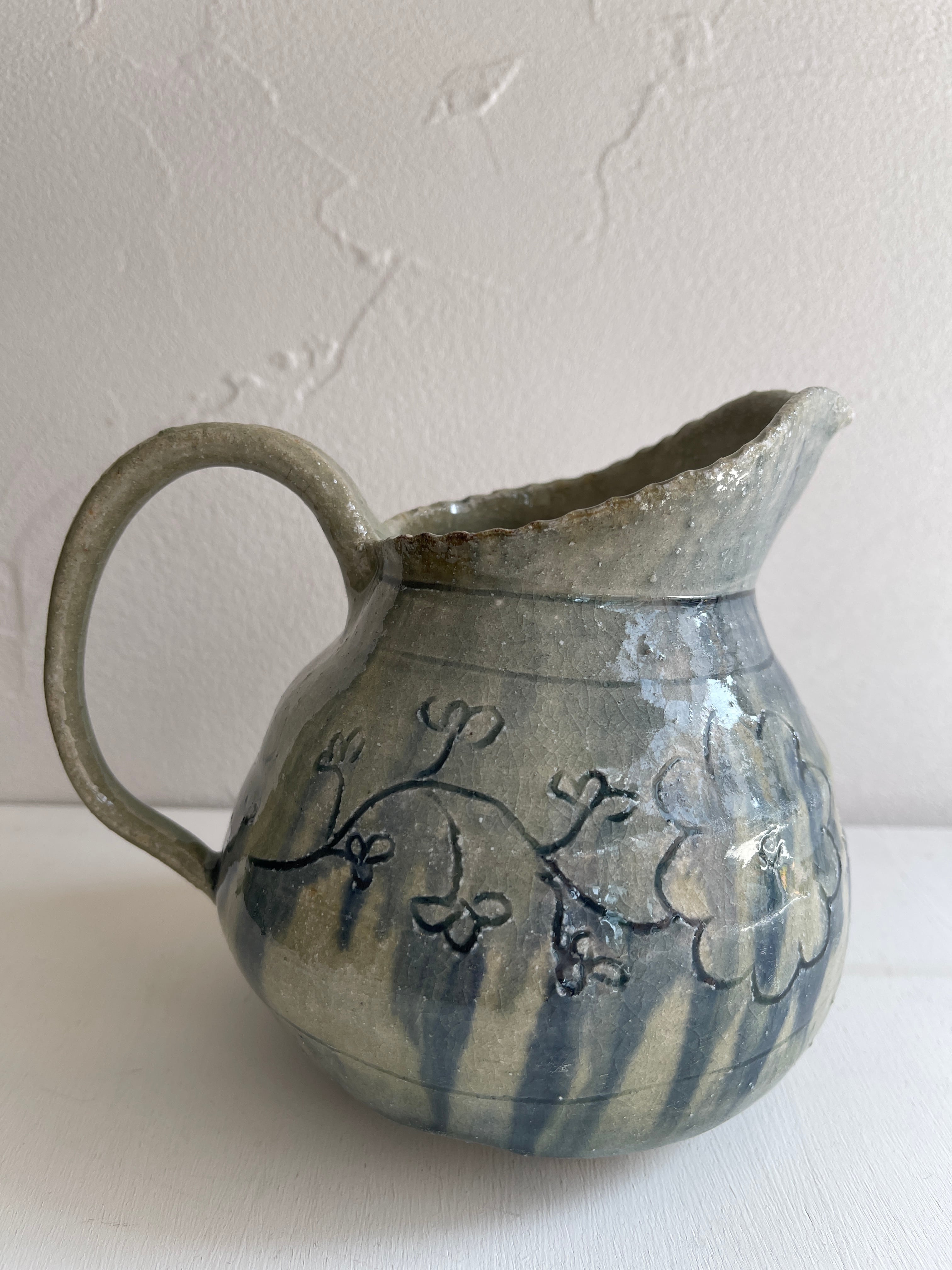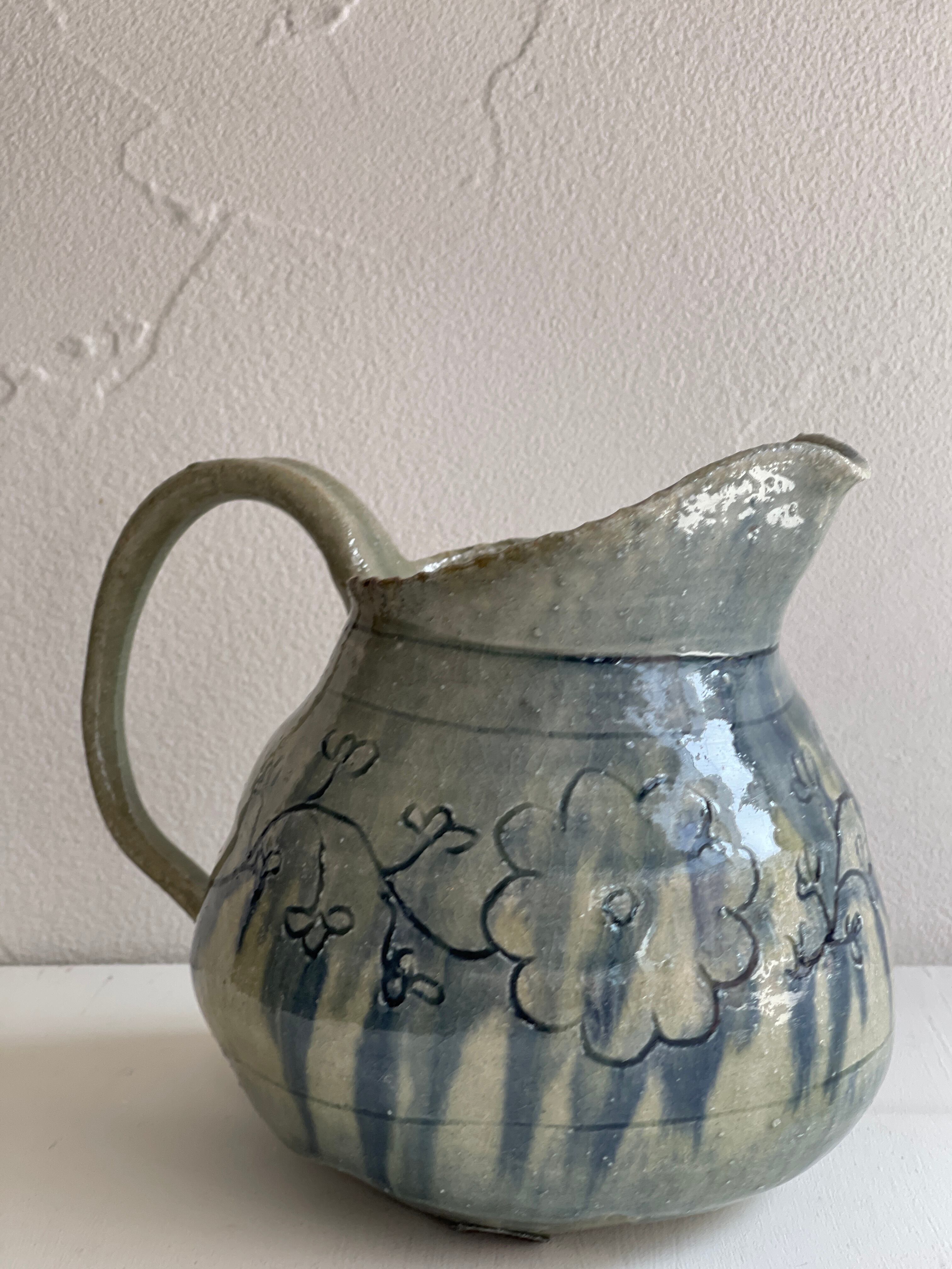 呉須で花の絵柄が描かれたピッチャーです。ぼってりとしたラインのピッチャーは持ちやすく安定感があります。花を生けたり、水入れとして、オブジェとして柔らかな存在感に。