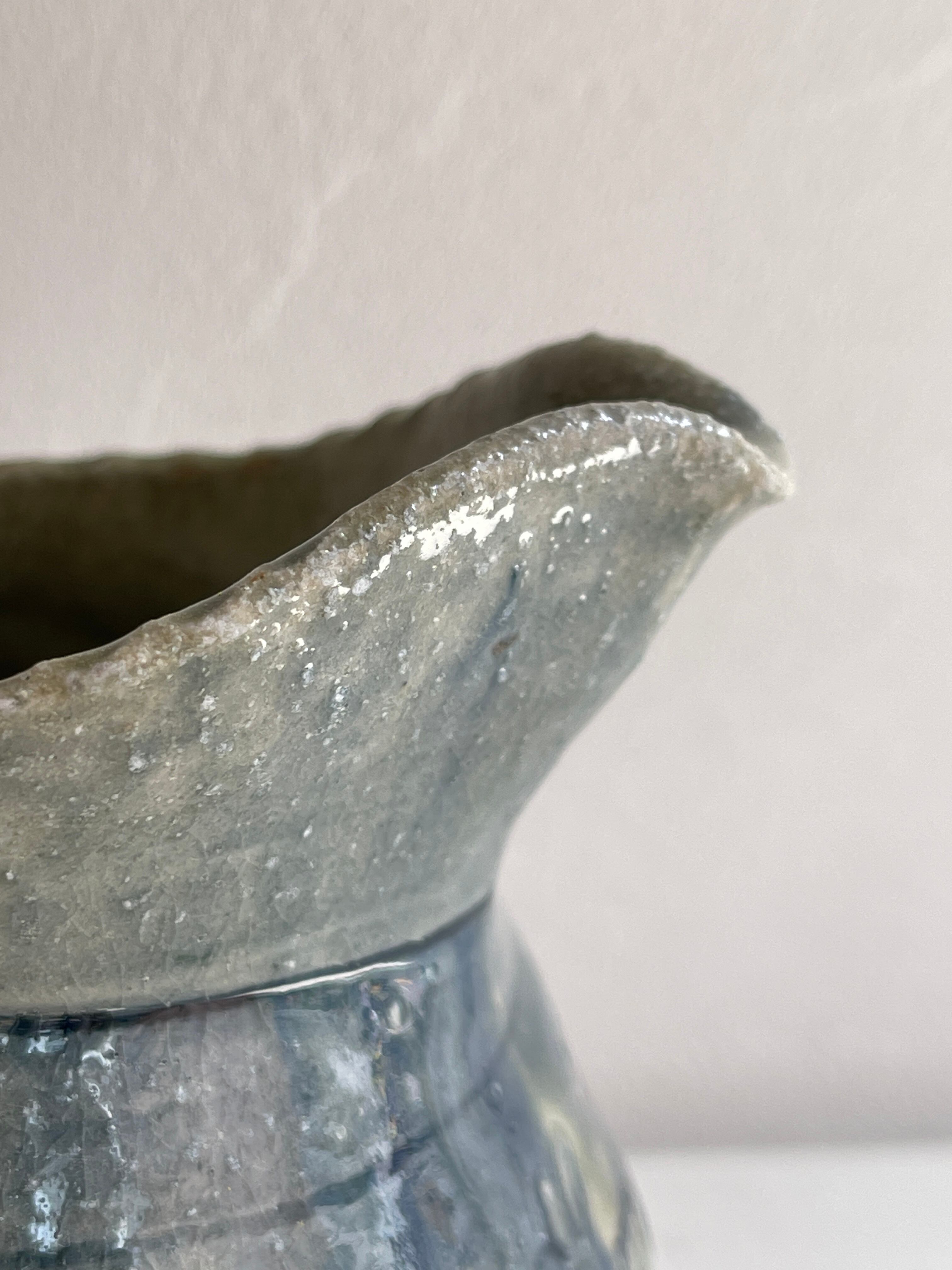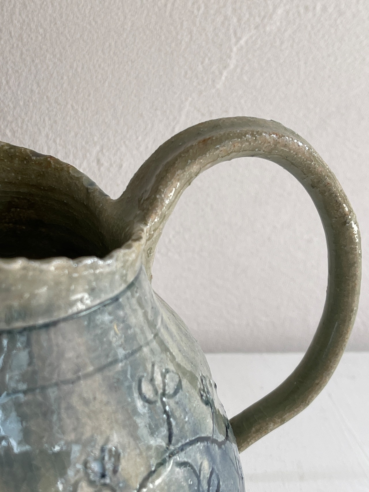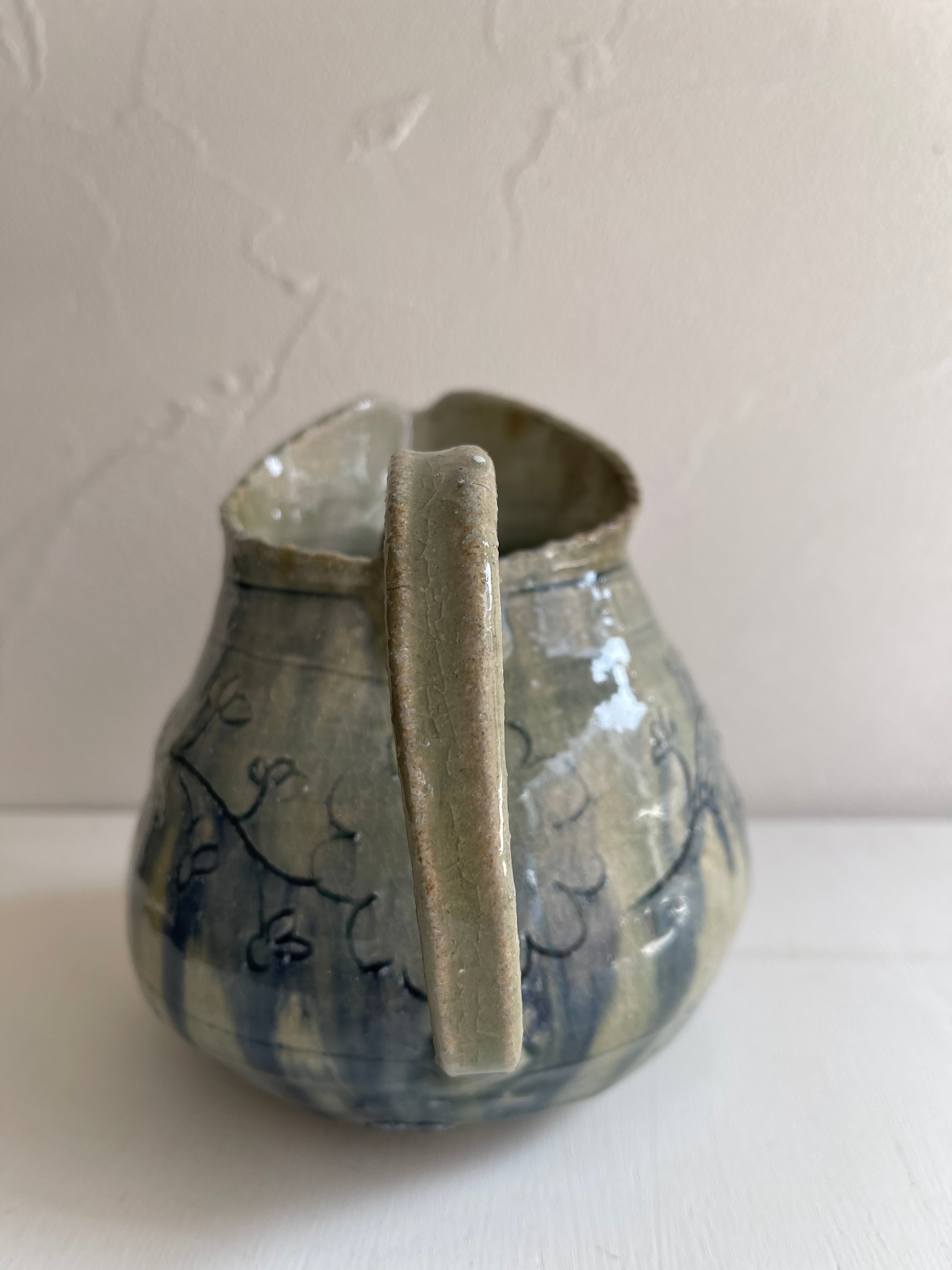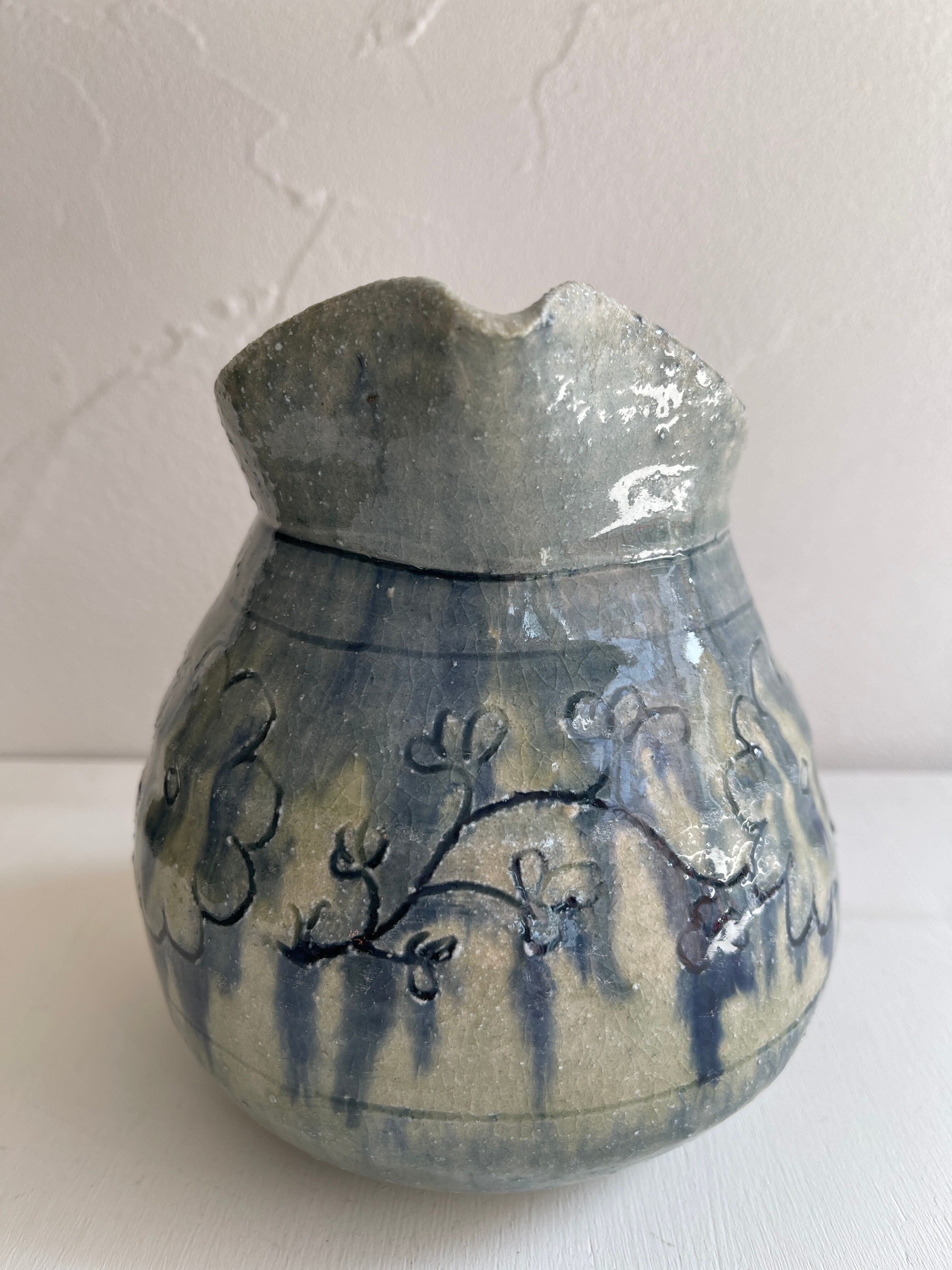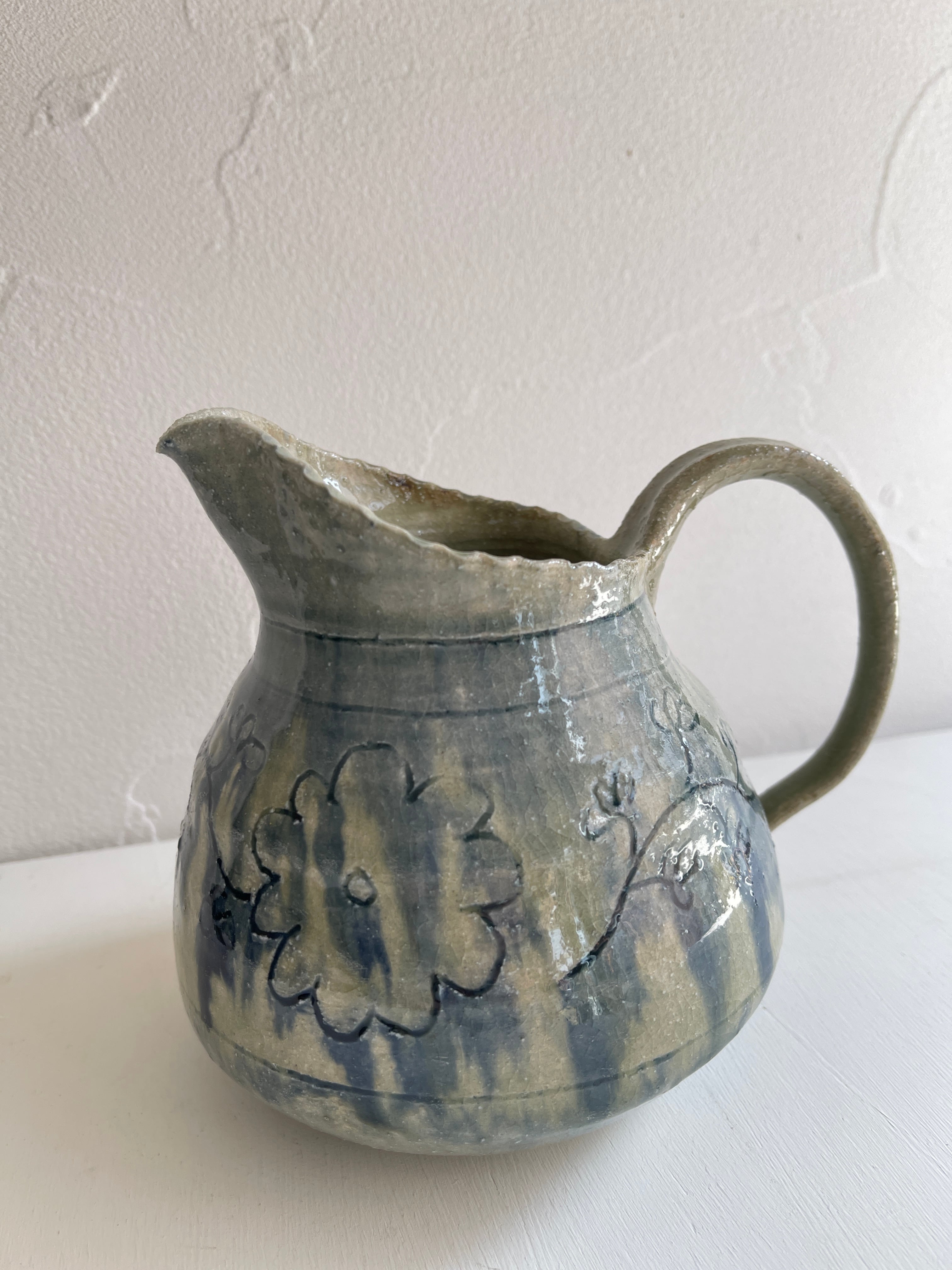 呉須で花の絵柄が描かれたピッチャーです。ぼってりとしたラインのピッチャーは持ちやすく安定感があります。花を生けたり、水入れとして、オブジェとして柔らかな存在感に。