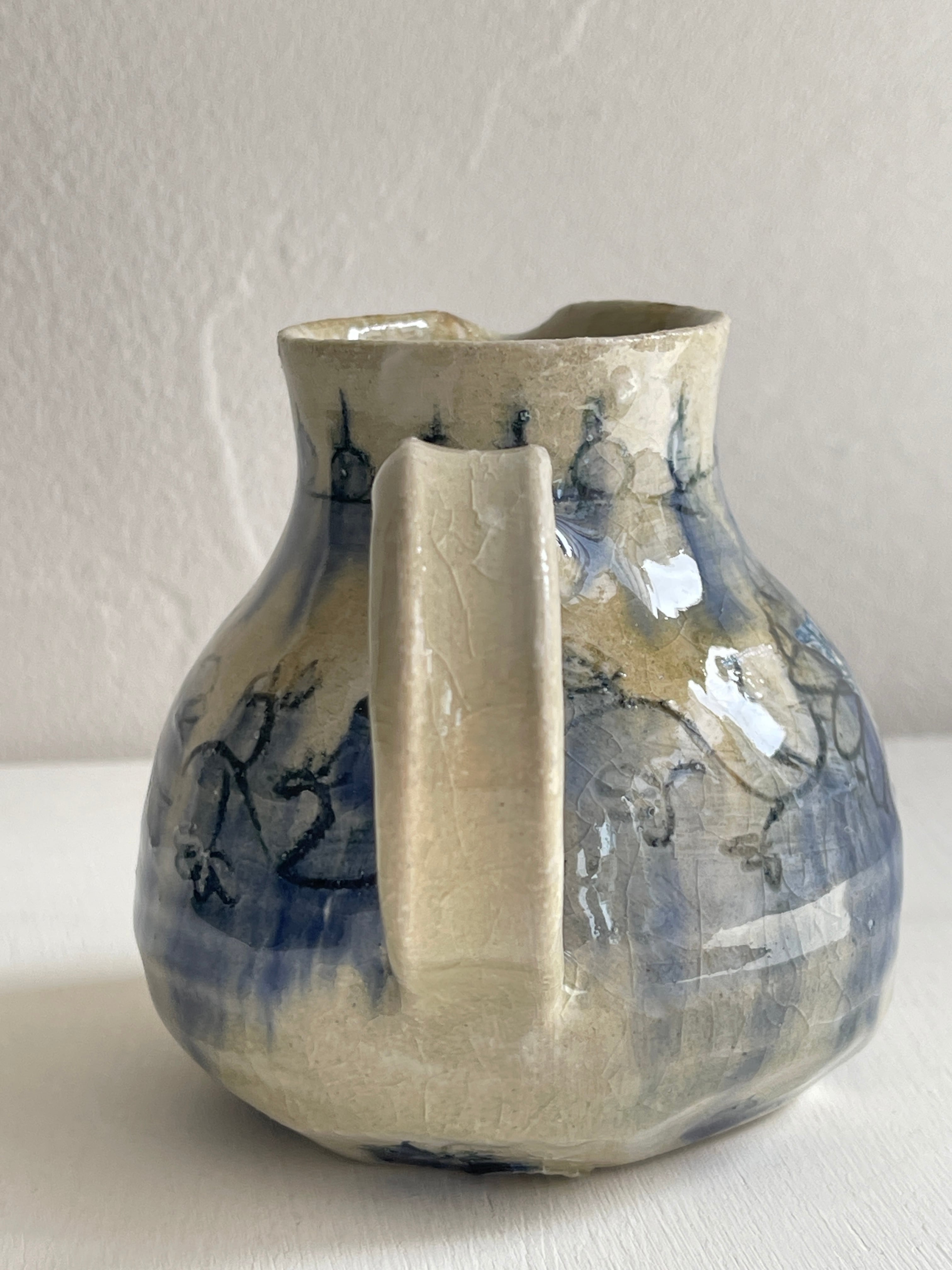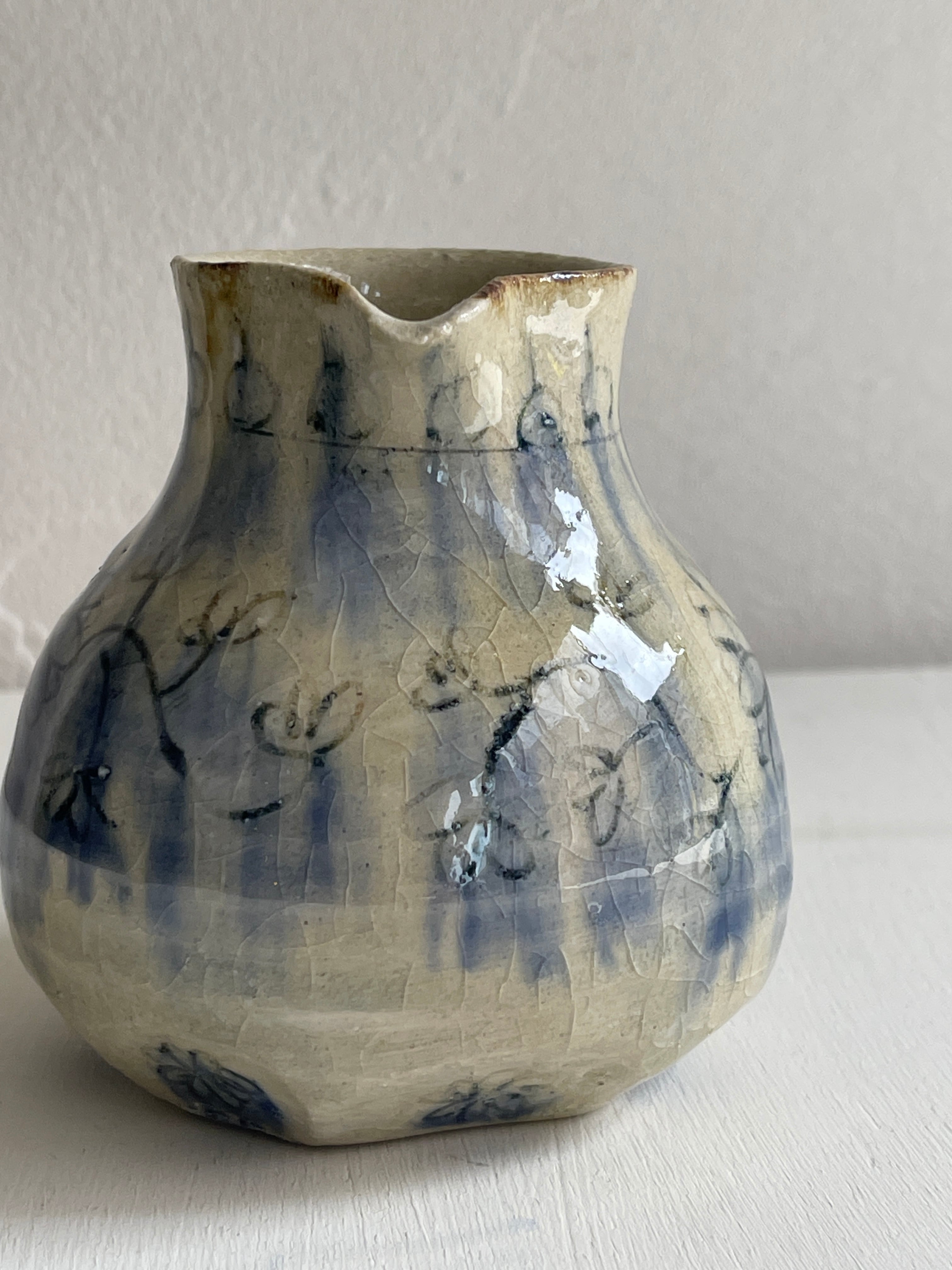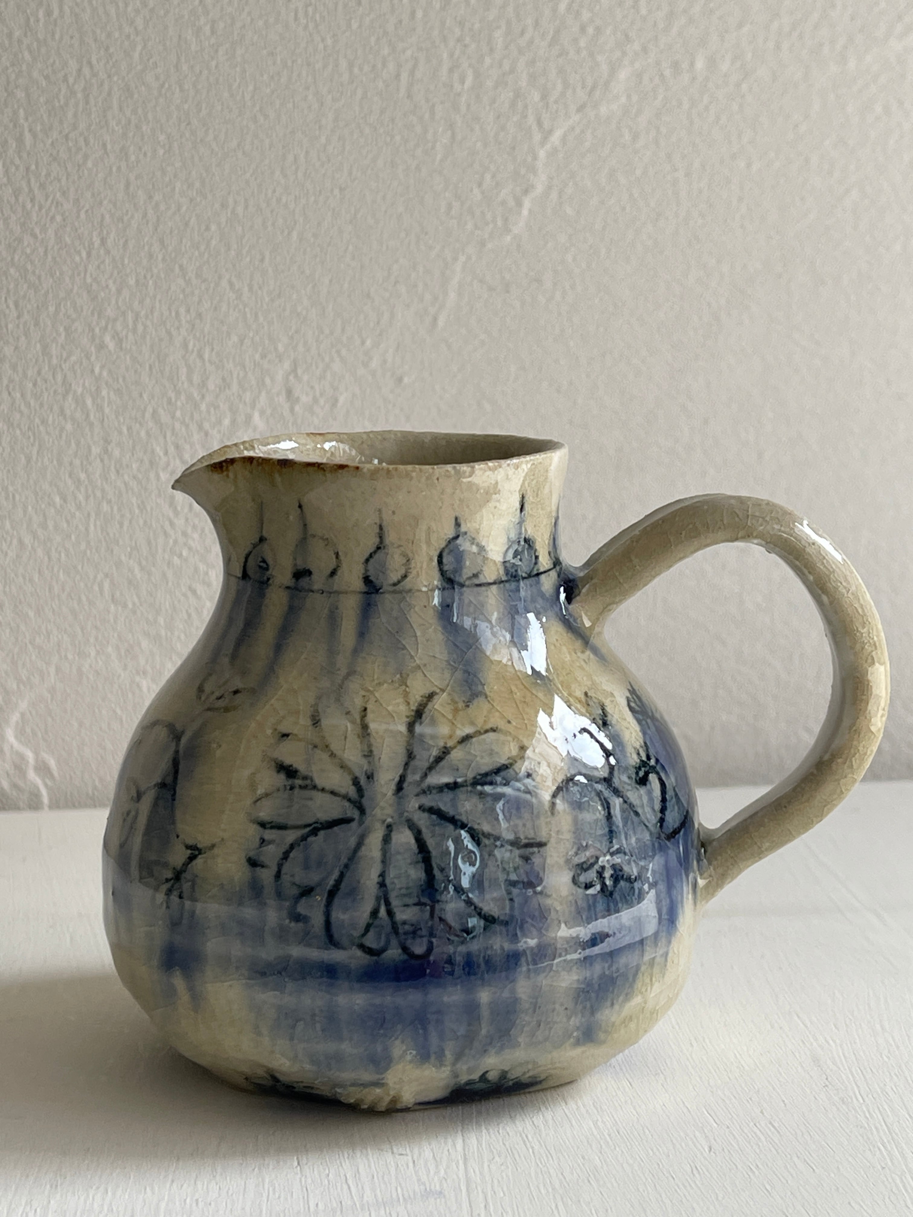 花や植物が描かれた少し小ぶりのピッチャーです。花器を飾ったり、ドレッシングや麵つゆ、お水などを入れるのにもお使い頂けます。ぜひとも普段から飾りながら使いたい作品です。