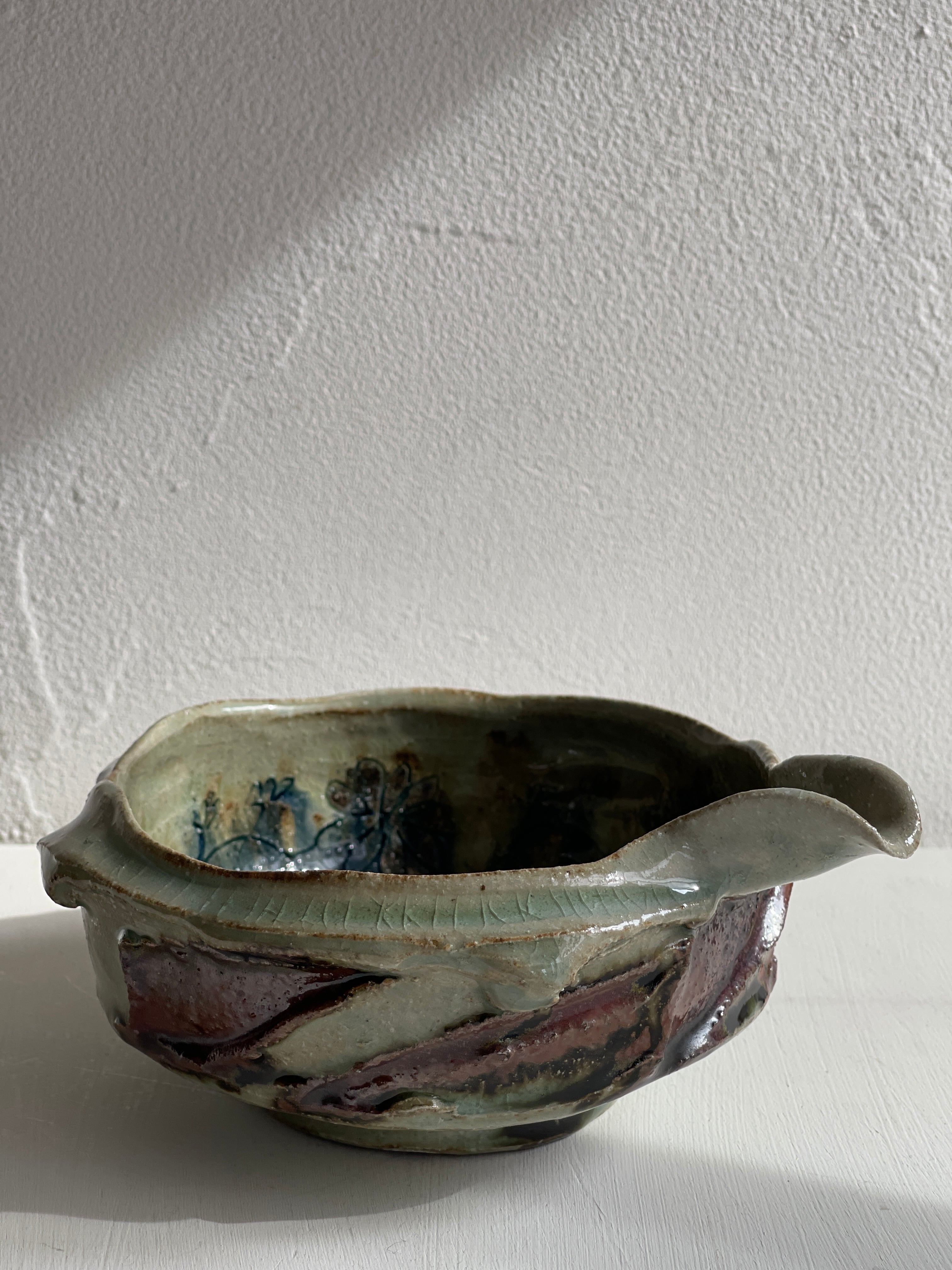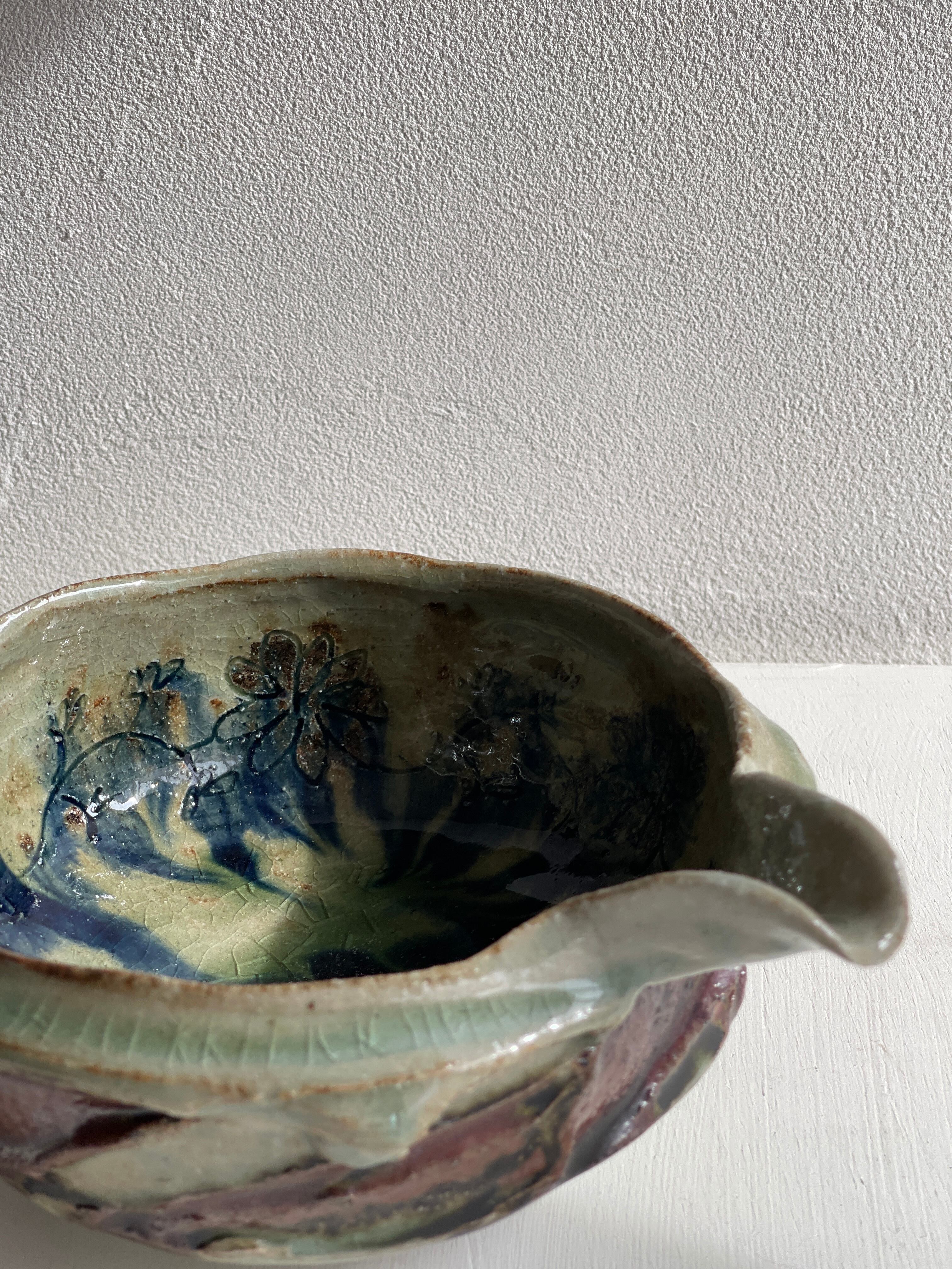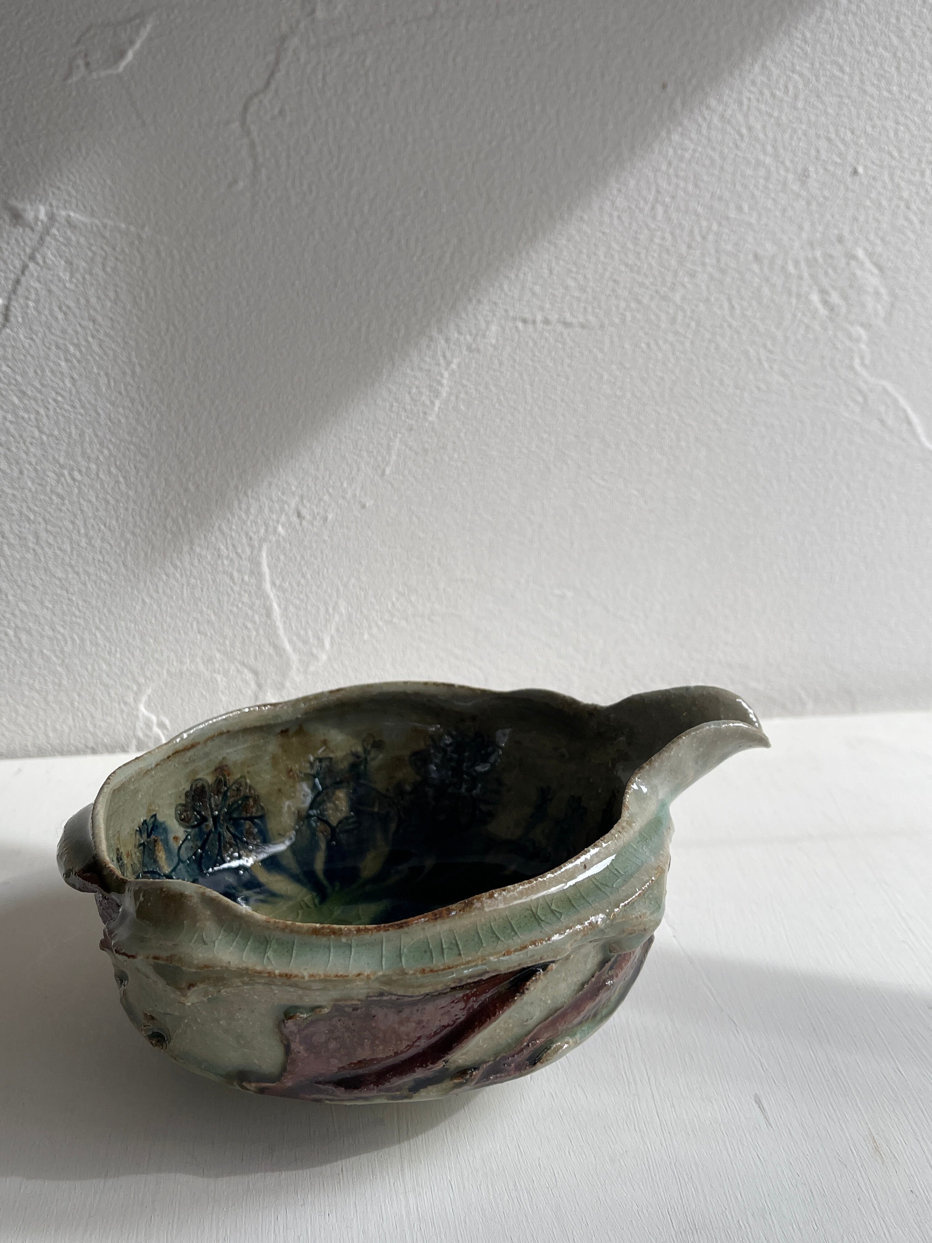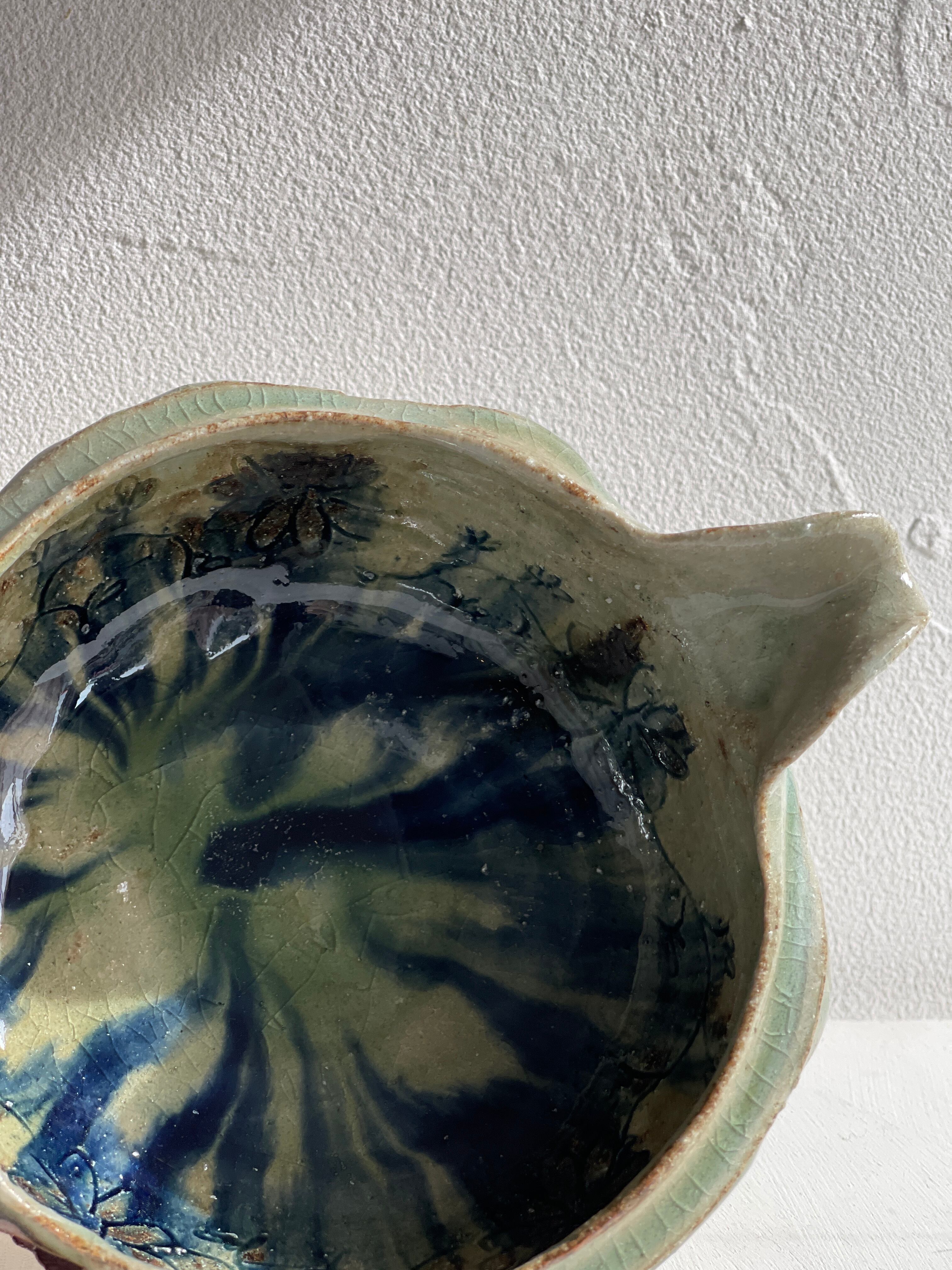 外側は淡い緑と茶色の釉薬で、内側は青いお花の絵。うねりのような力強さがある片口鉢です。お惣菜をもったり、お酒を入れたり、水割り用の氷をいれても。お花を生けると道端の小さな草花でも、かっこよく様になる器。