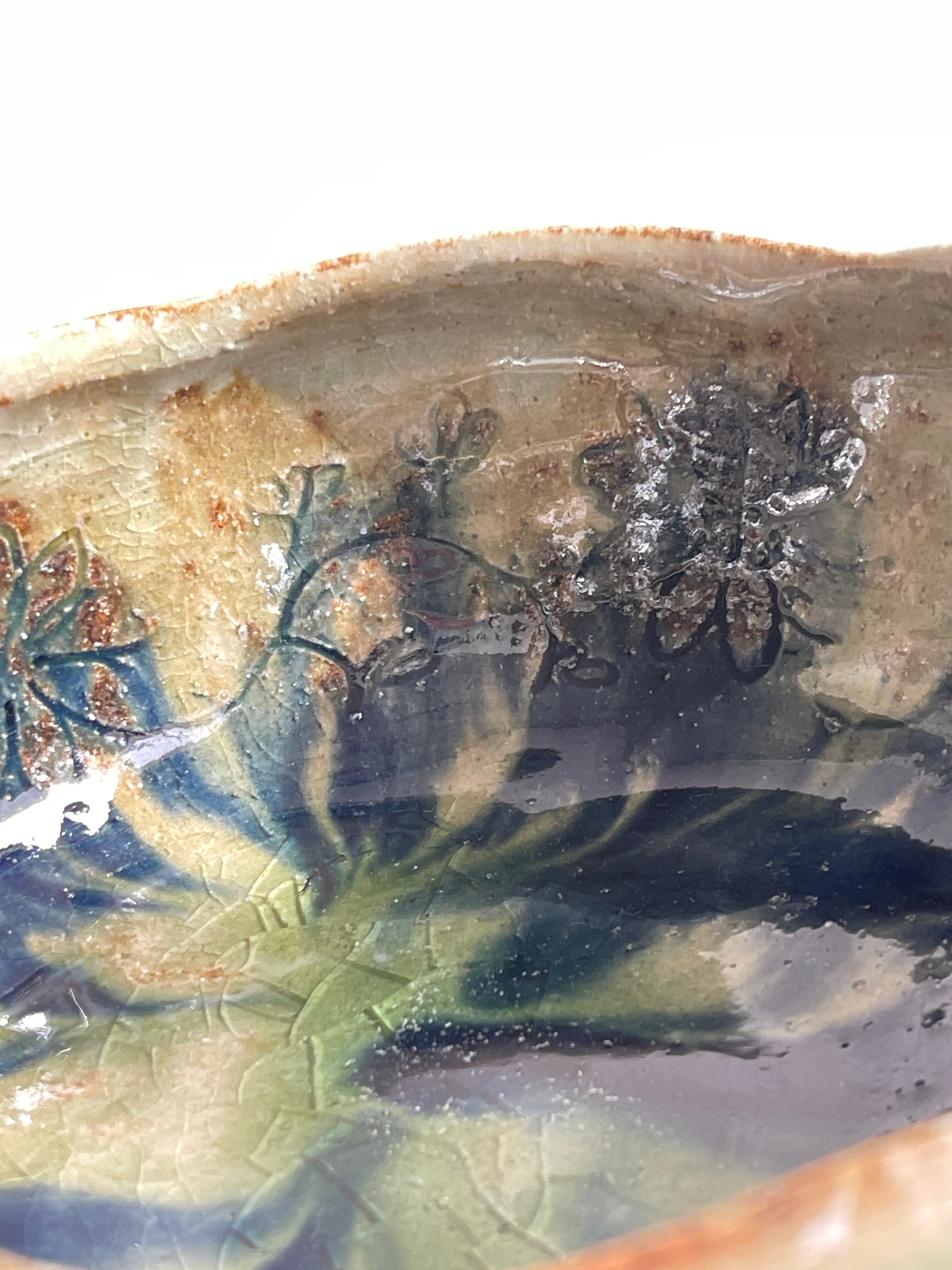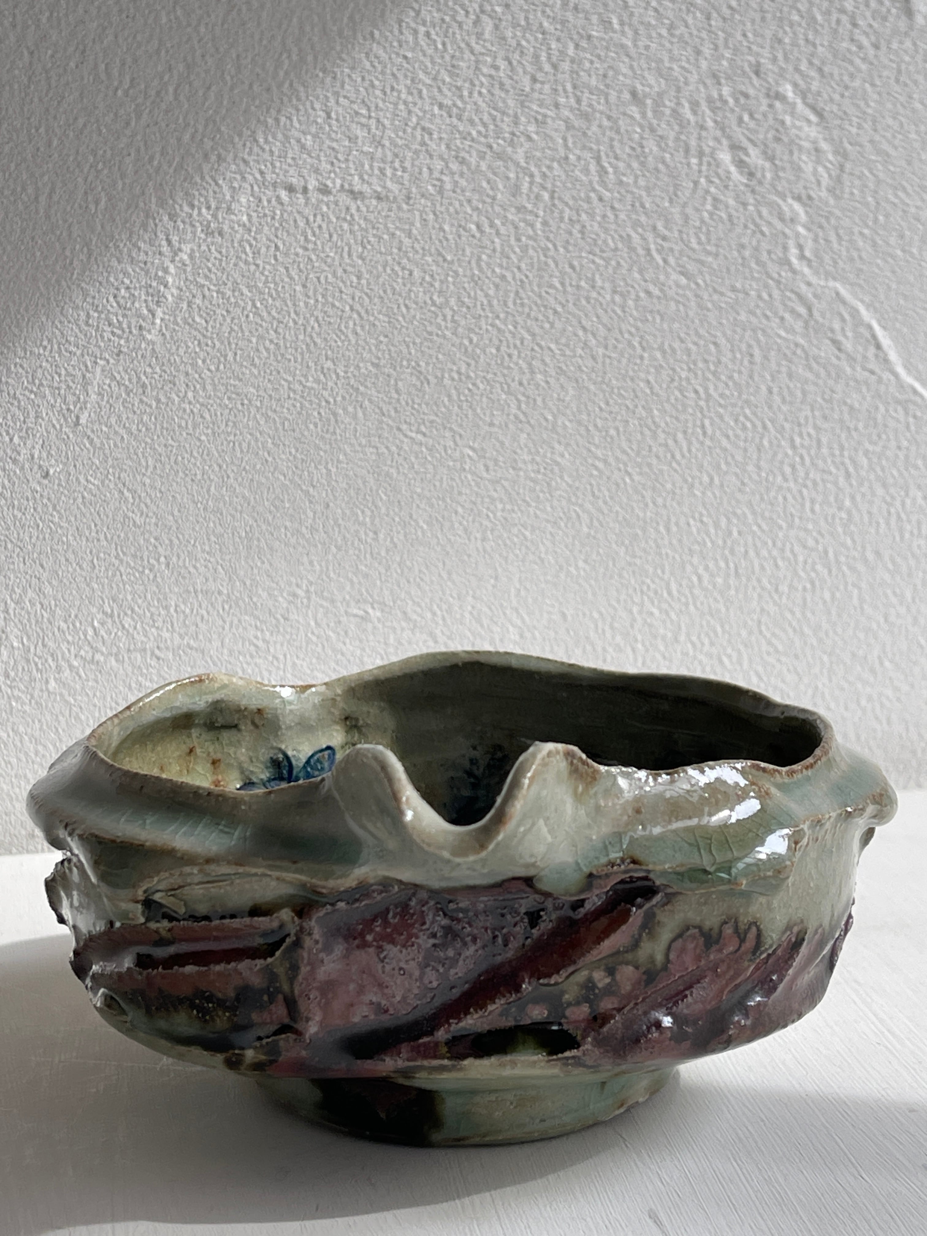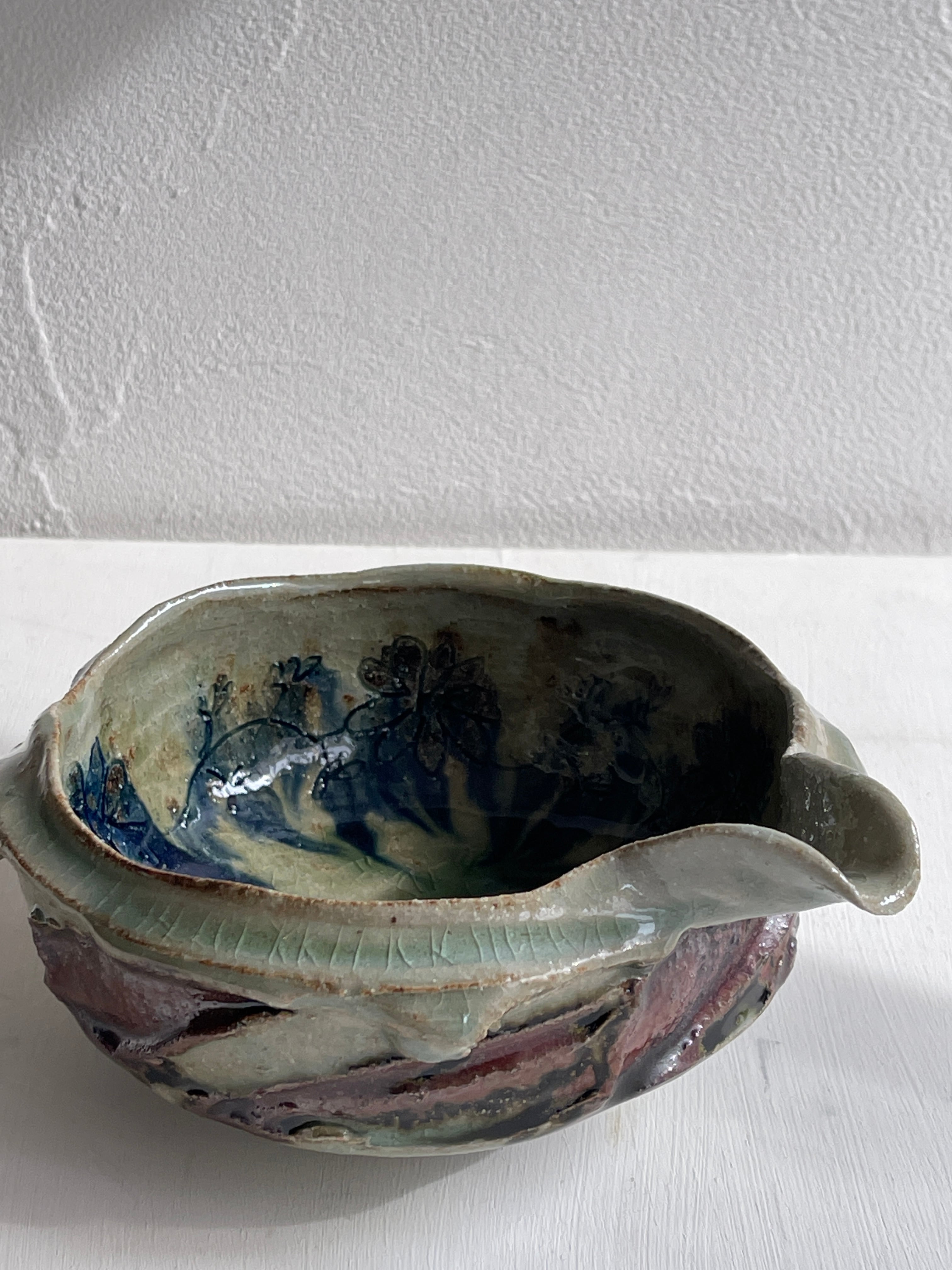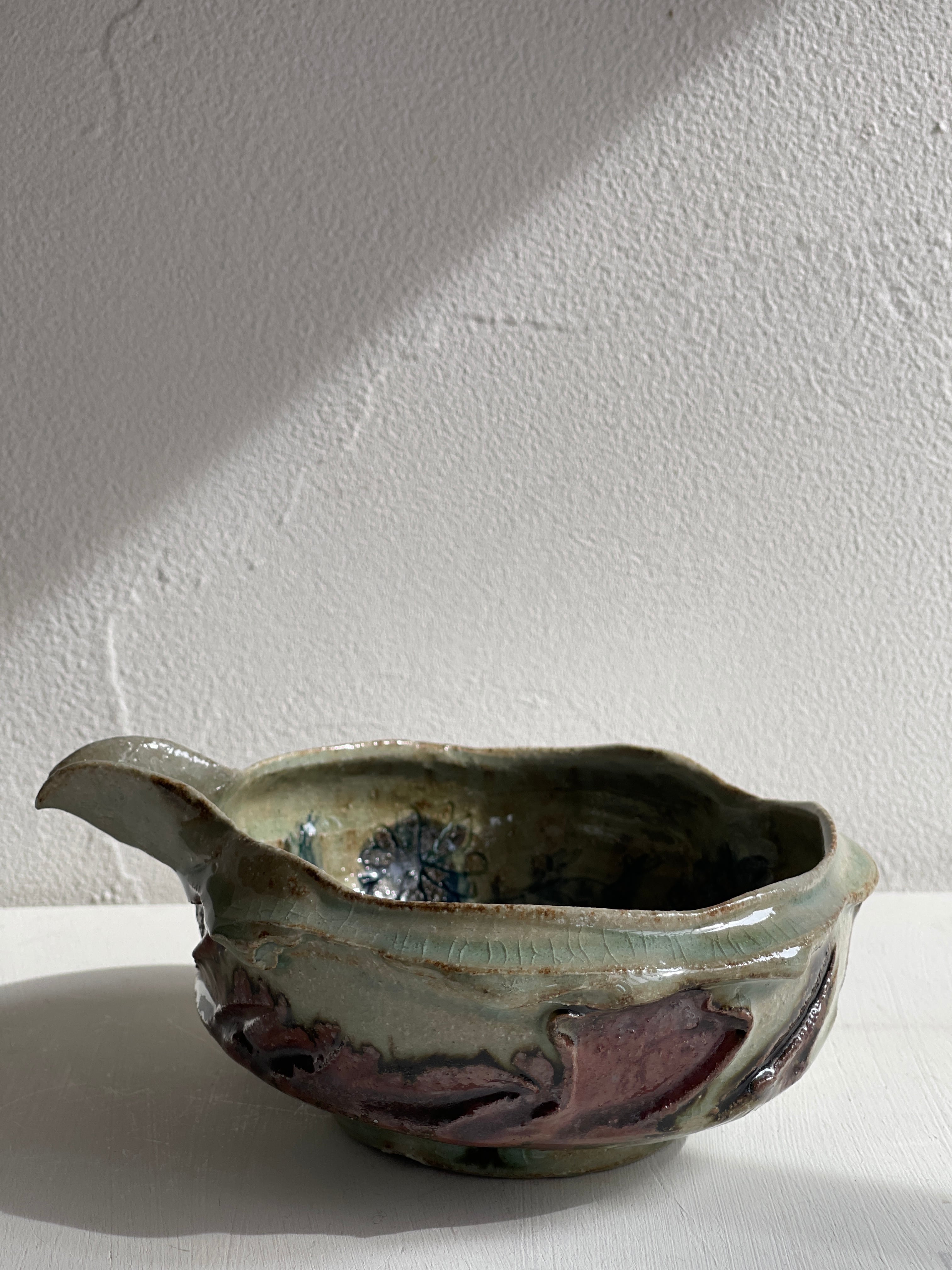 外側は淡い緑と茶色の釉薬で、内側は青いお花の絵。うねりのような力強さがある片口鉢です。お惣菜をもったり、お酒を入れたり、水割り用の氷をいれても。お花を生けると道端の小さな草花でも、かっこよく様になる器。