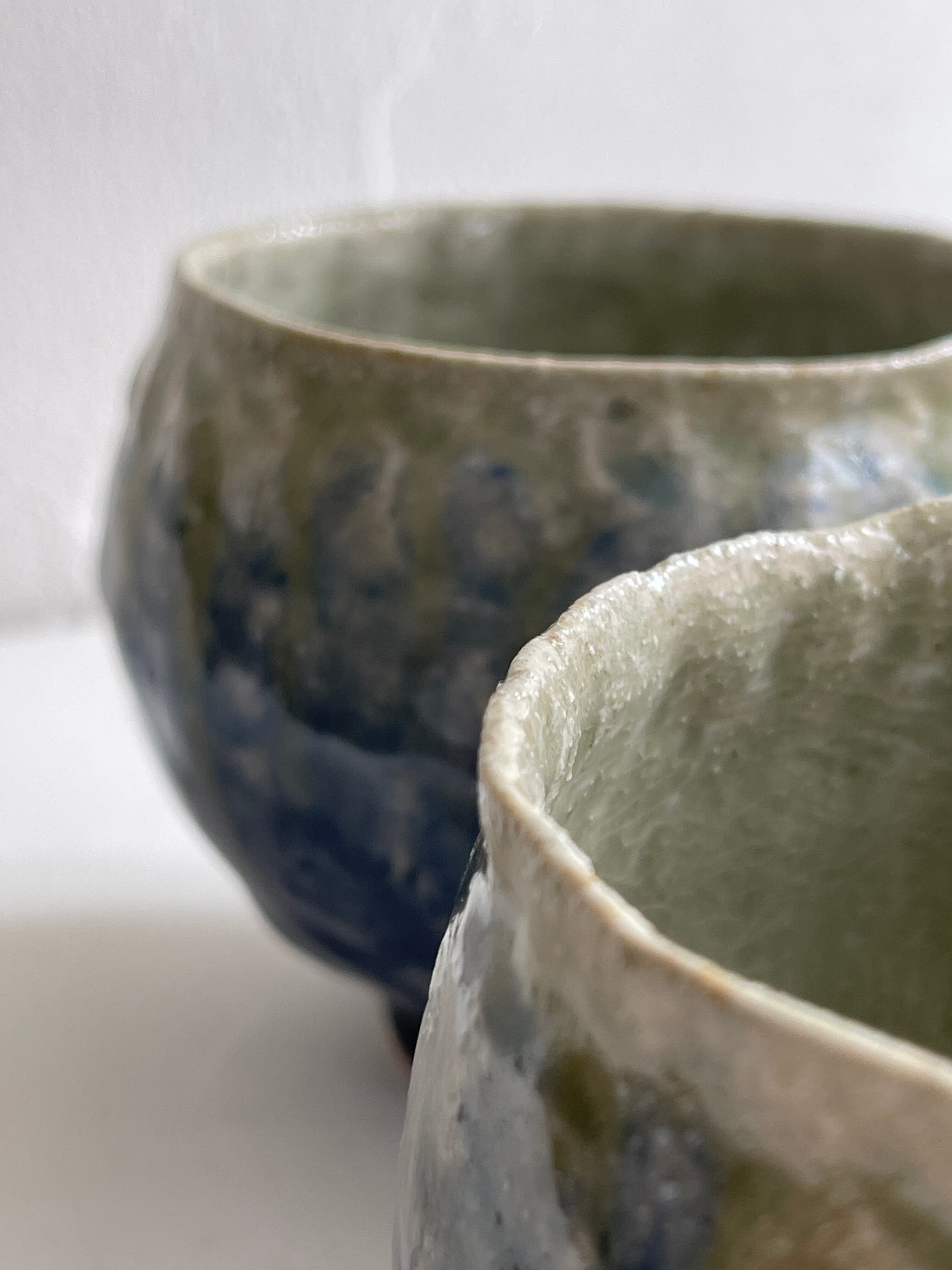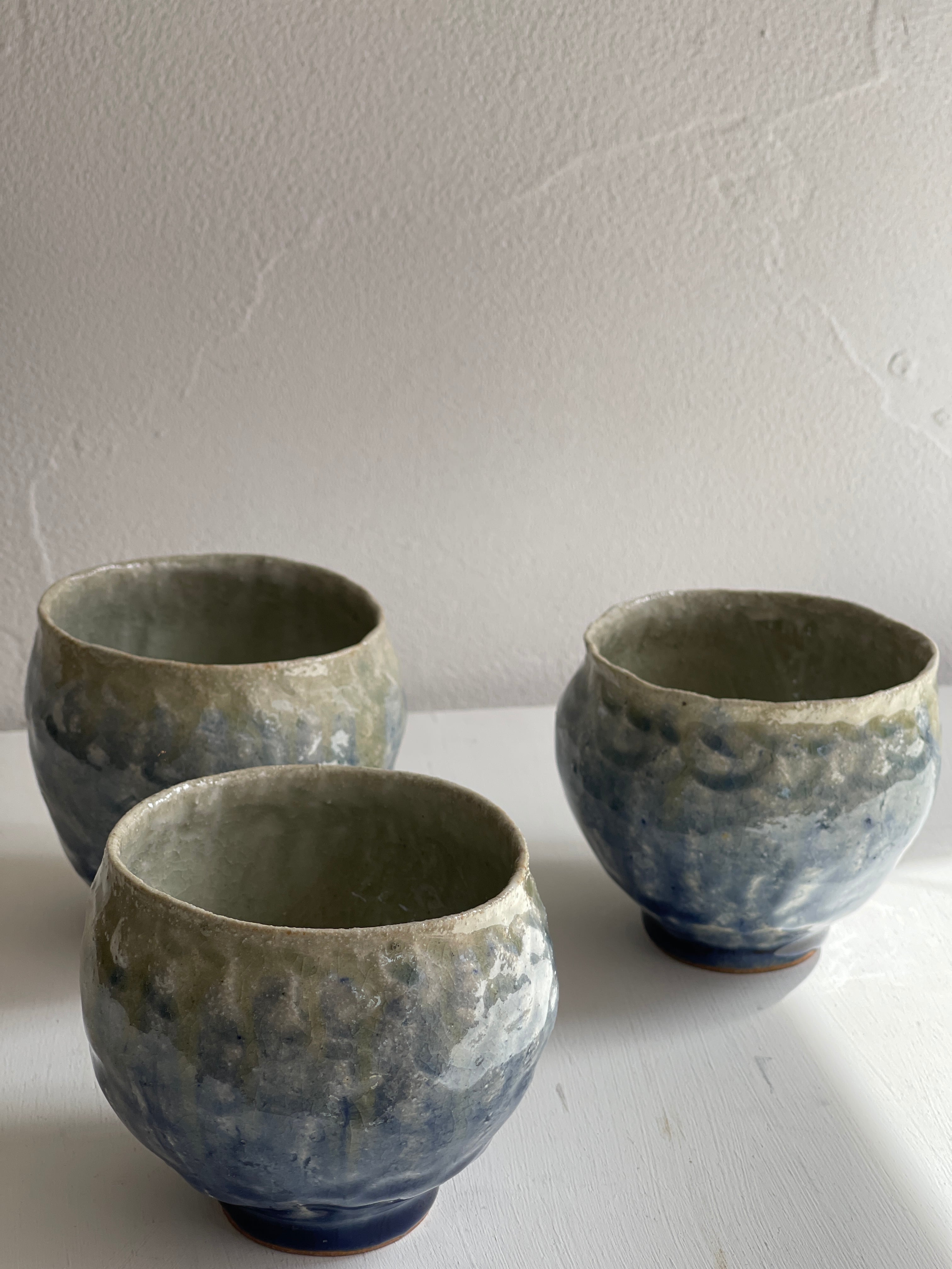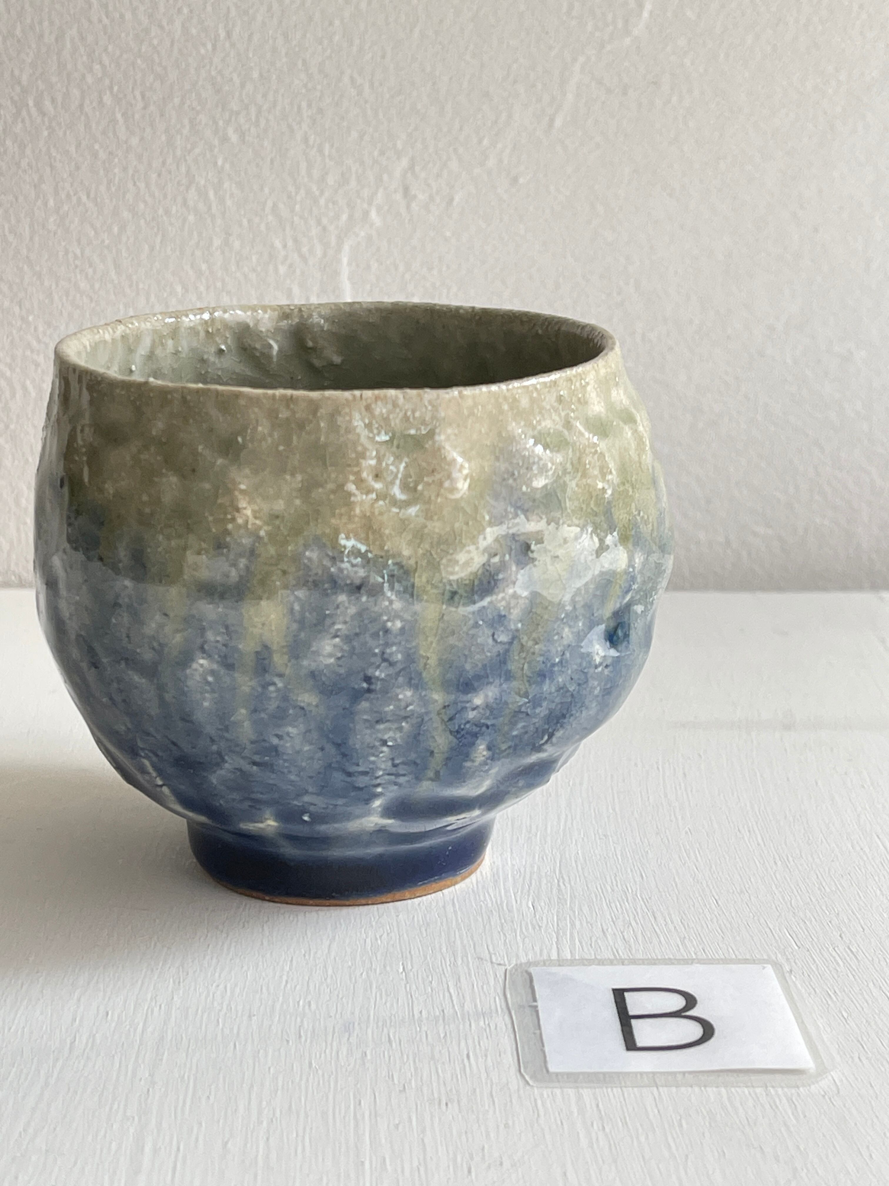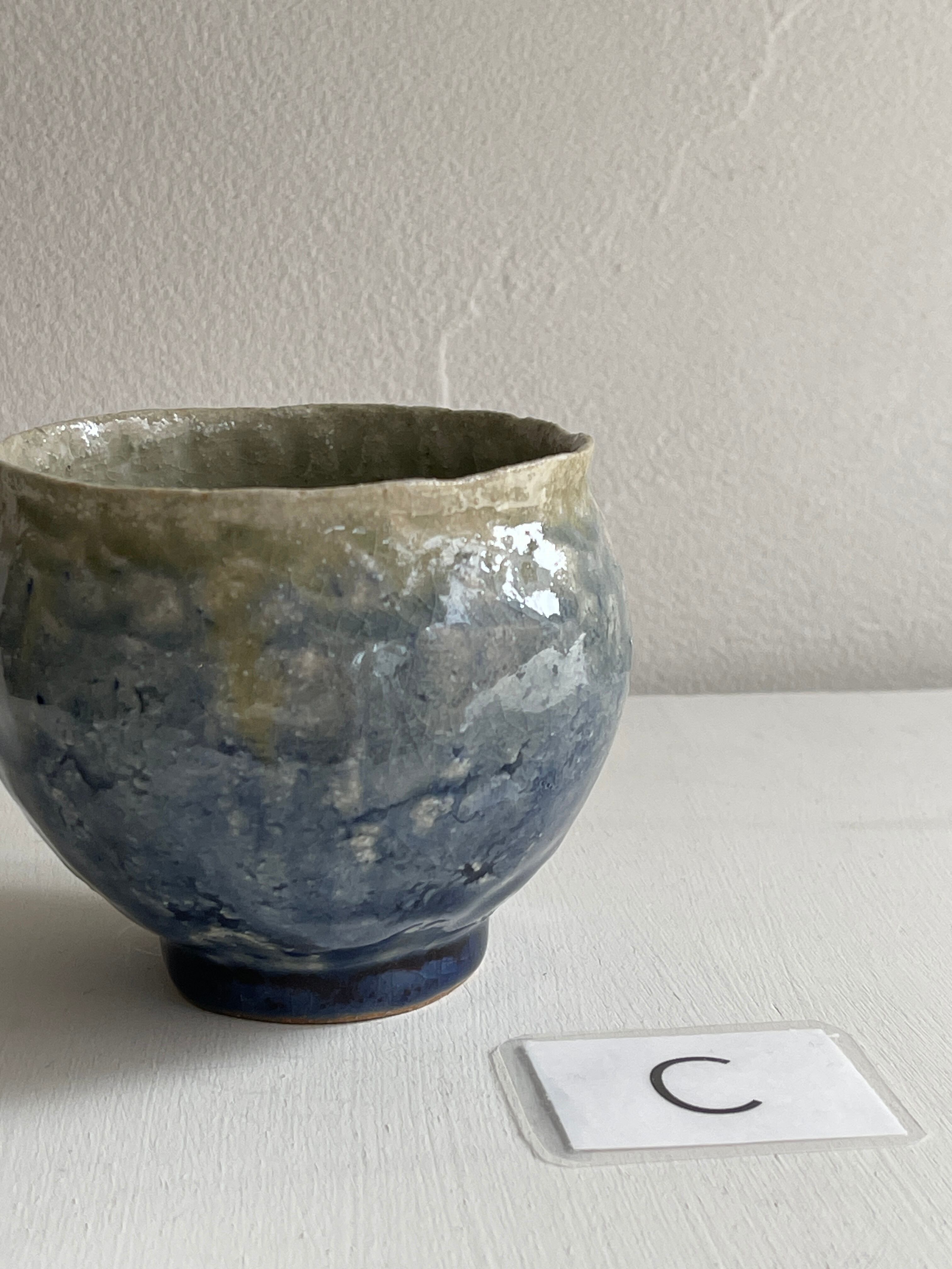 紺色釉薬の濃淡が美しいコロンと丸みを帯びた湯呑です。手びねりらしい陶器の肌が、絵を描かないシンプルな釉薬だけの世界に表情をつけてくれています。手のひらにほっこりと包み込む安心感がり、湯呑以外にもフリーカップとしてお使い頂けます。