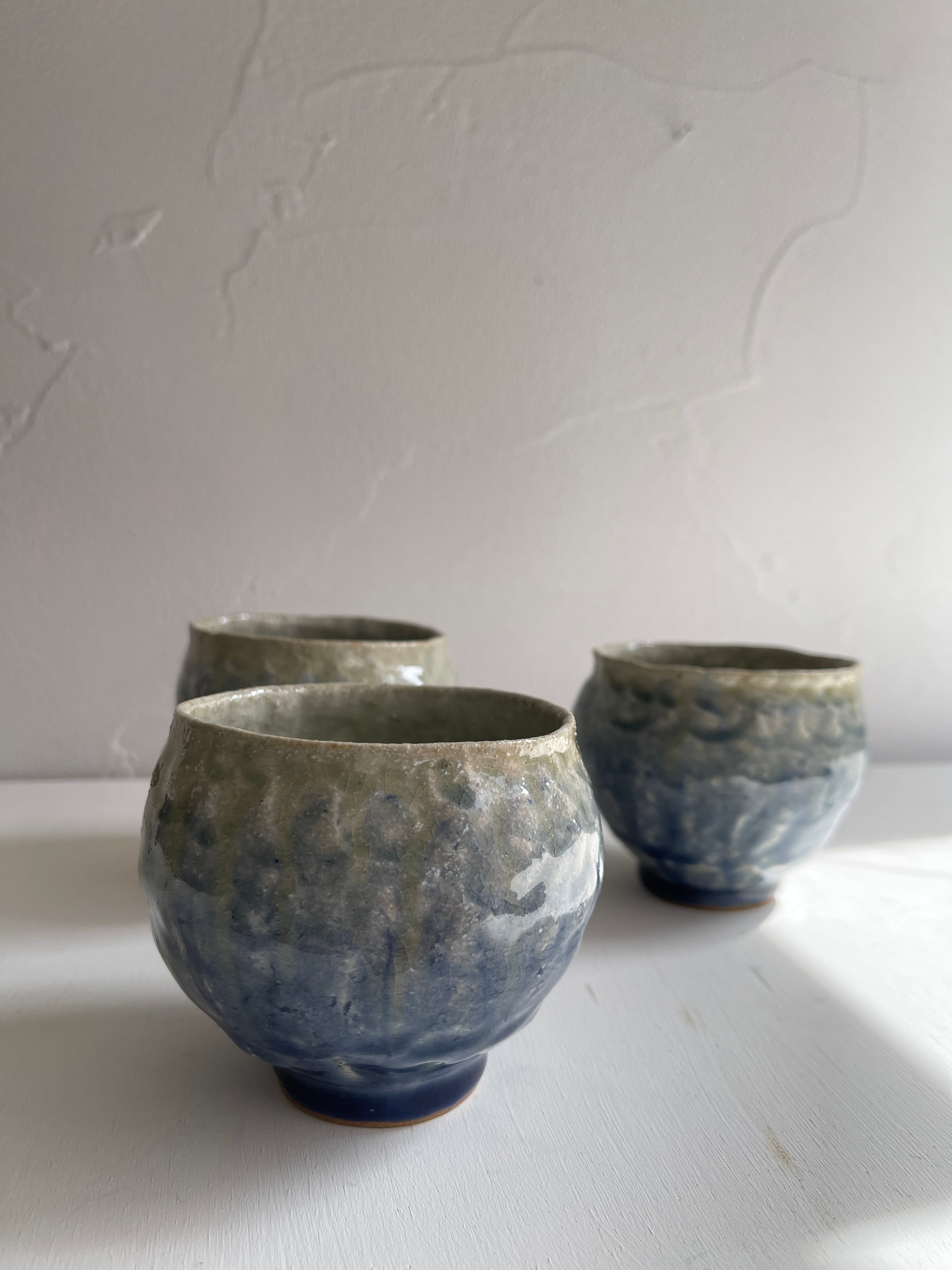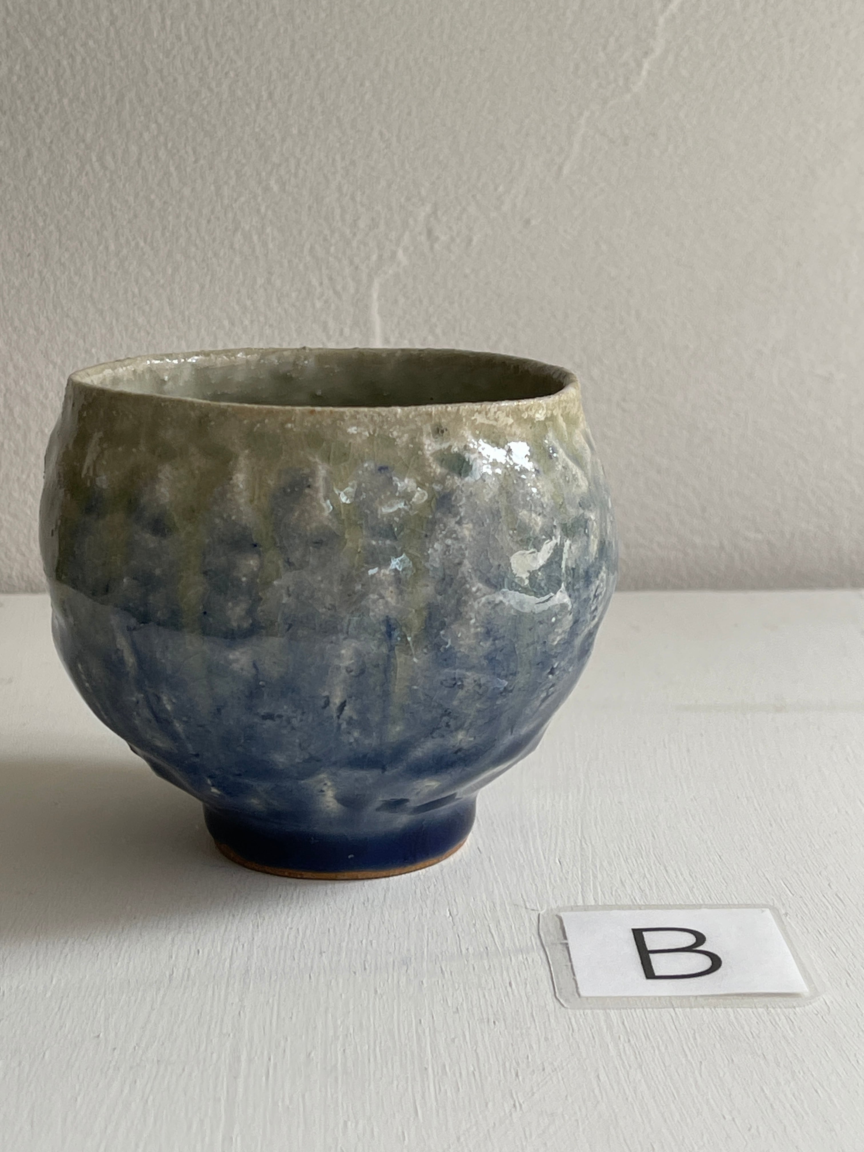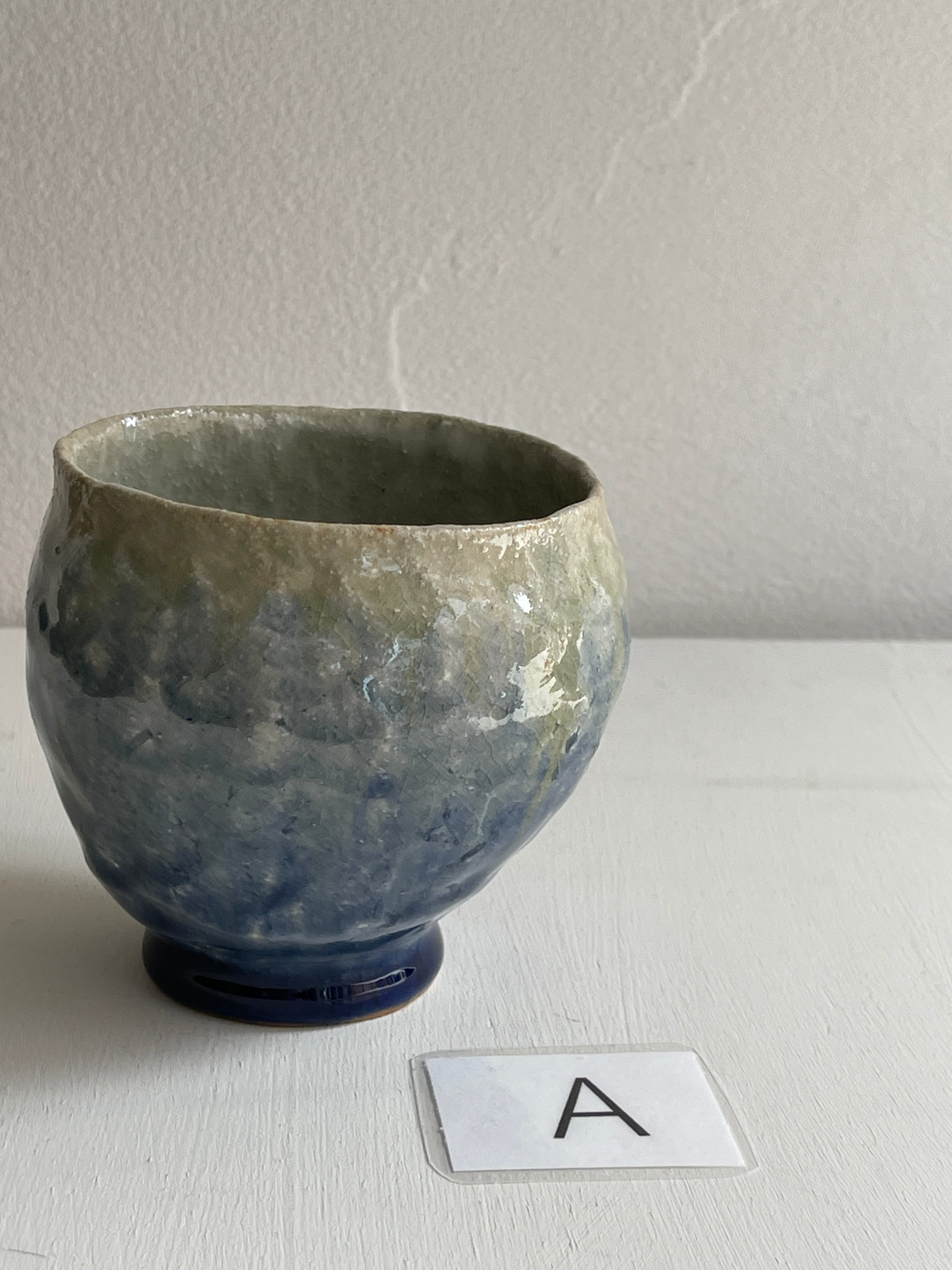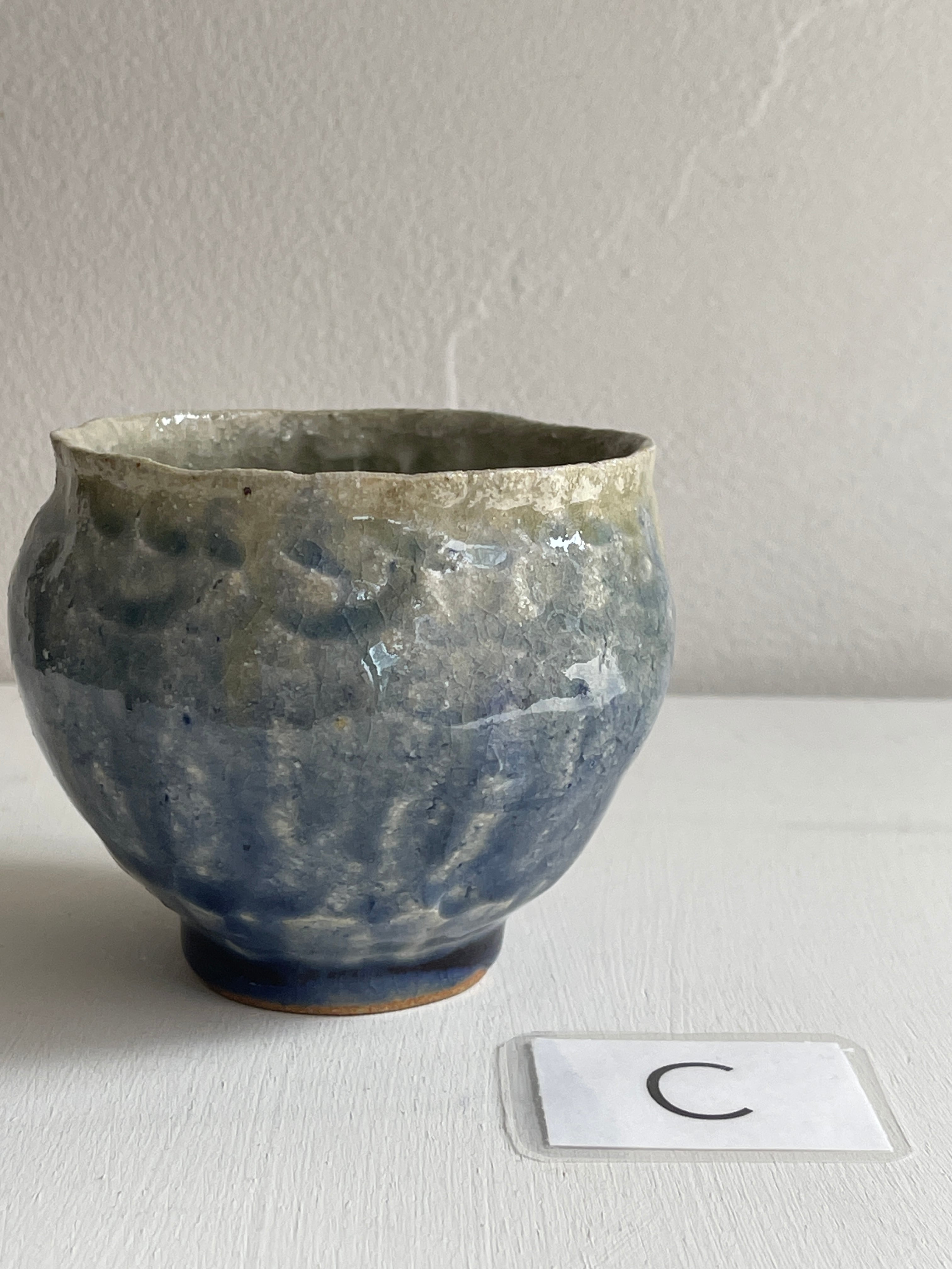 紺色釉薬の濃淡が美しいコロンと丸みを帯びた湯呑です。手びねりらしい陶器の肌が、絵を描かないシンプルな釉薬だけの世界に表情をつけてくれています。手のひらにほっこりと包み込む安心感がり、湯呑以外にもフリーカップとしてお使い頂けます。