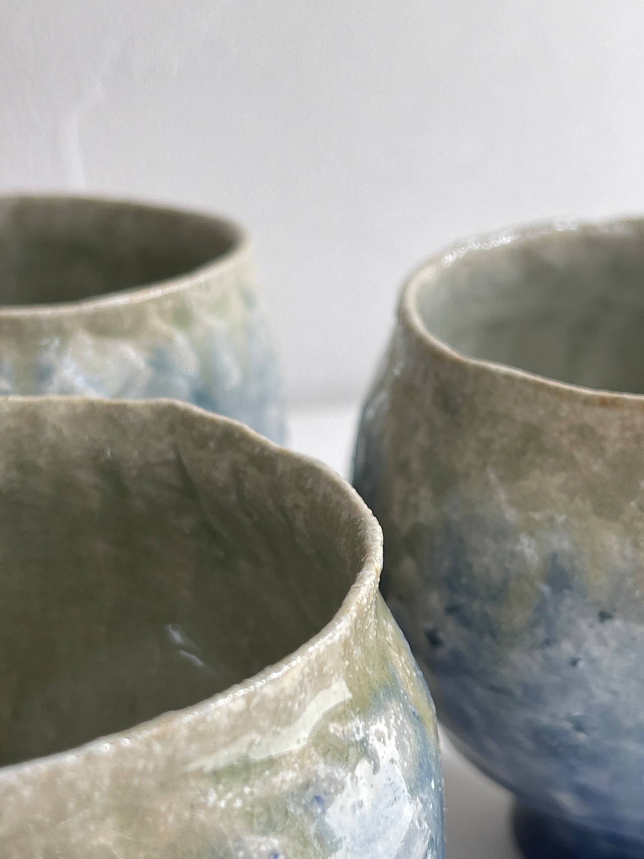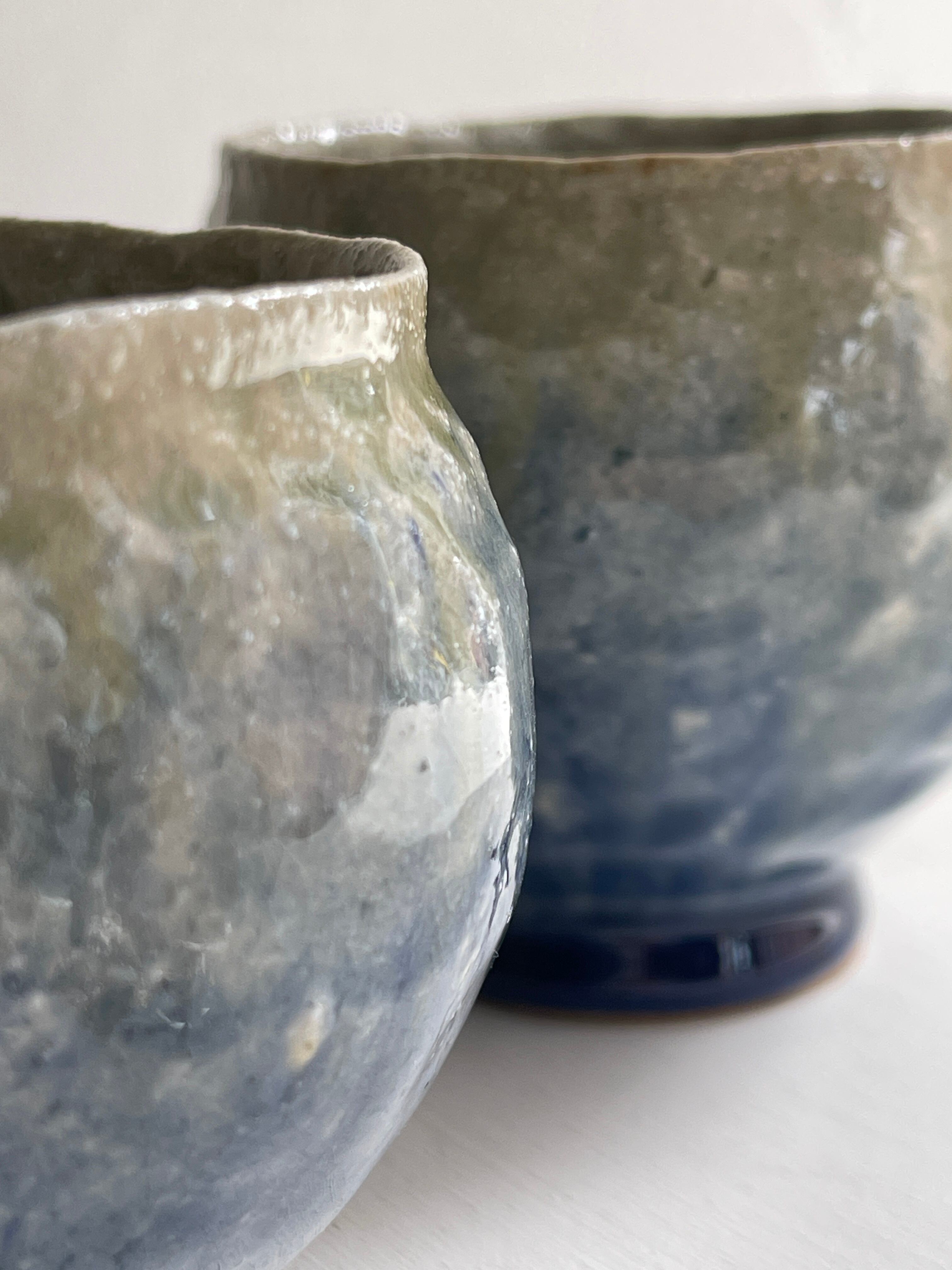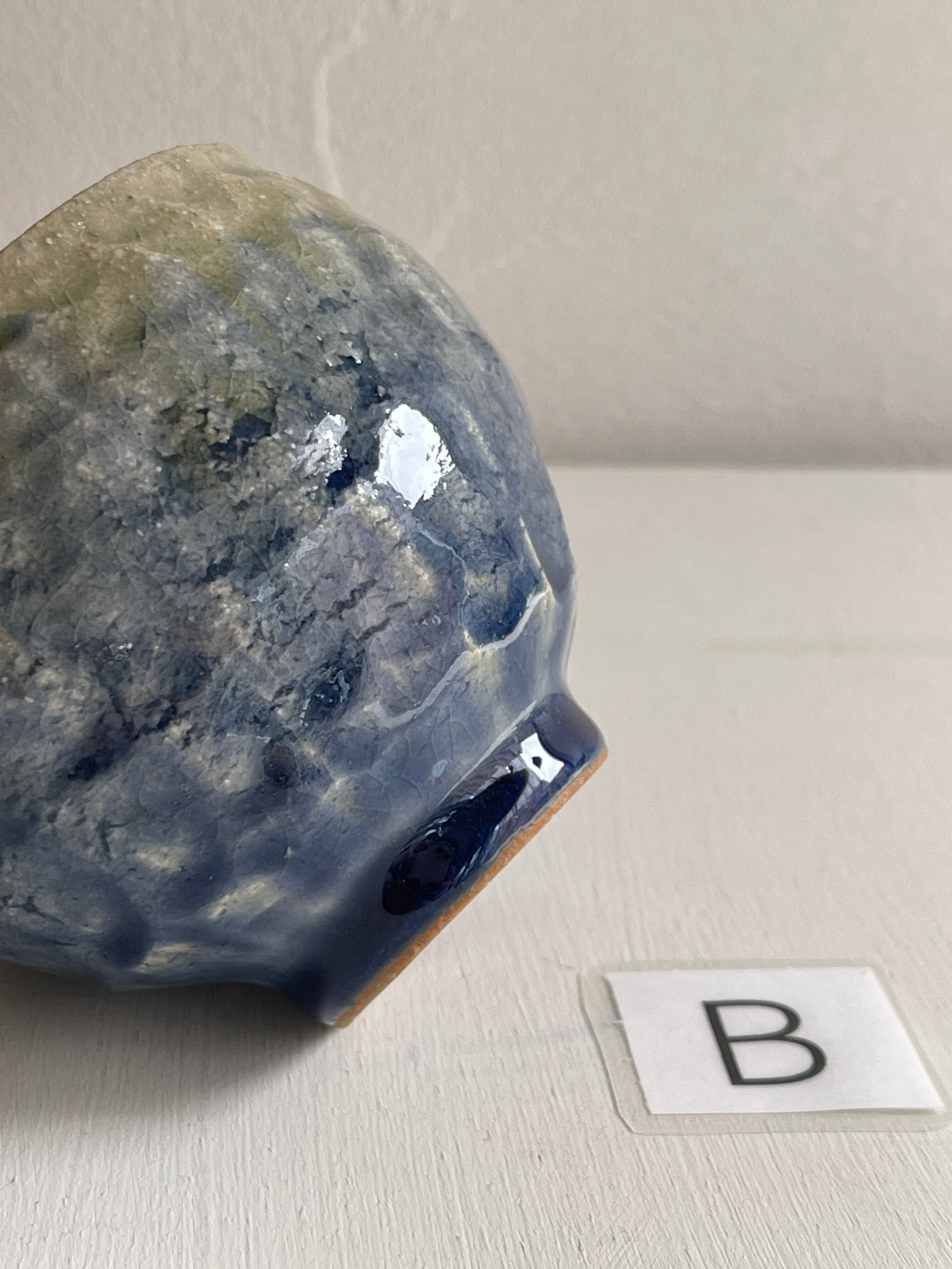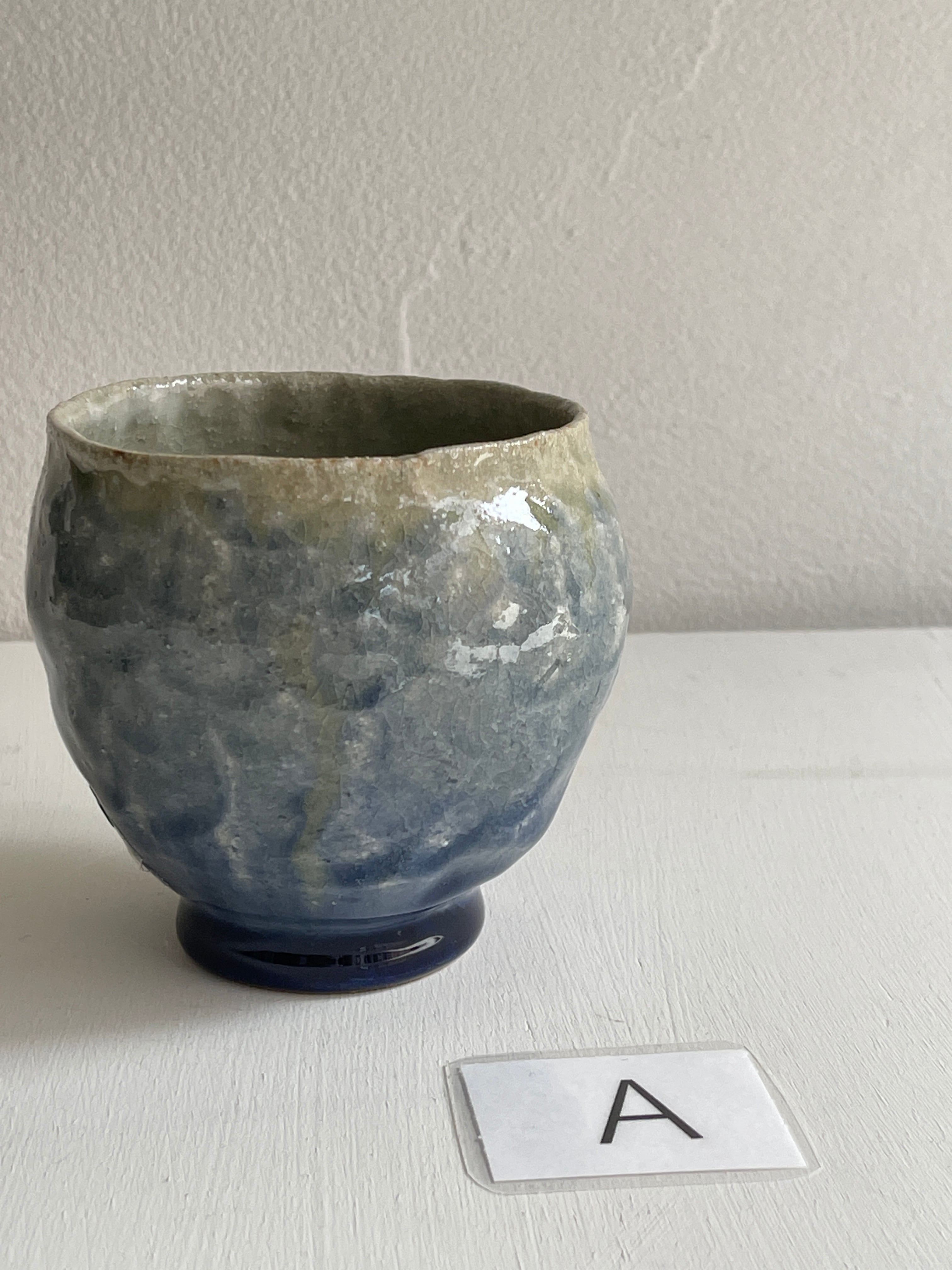 紺色釉薬の濃淡が美しいコロンと丸みを帯びた湯呑です。手びねりらしい陶器の肌が、絵を描かないシンプルな釉薬だけの世界に表情をつけてくれています。手のひらにほっこりと包み込む安心感がり、湯呑以外にもフリーカップとしてお使い頂けます。