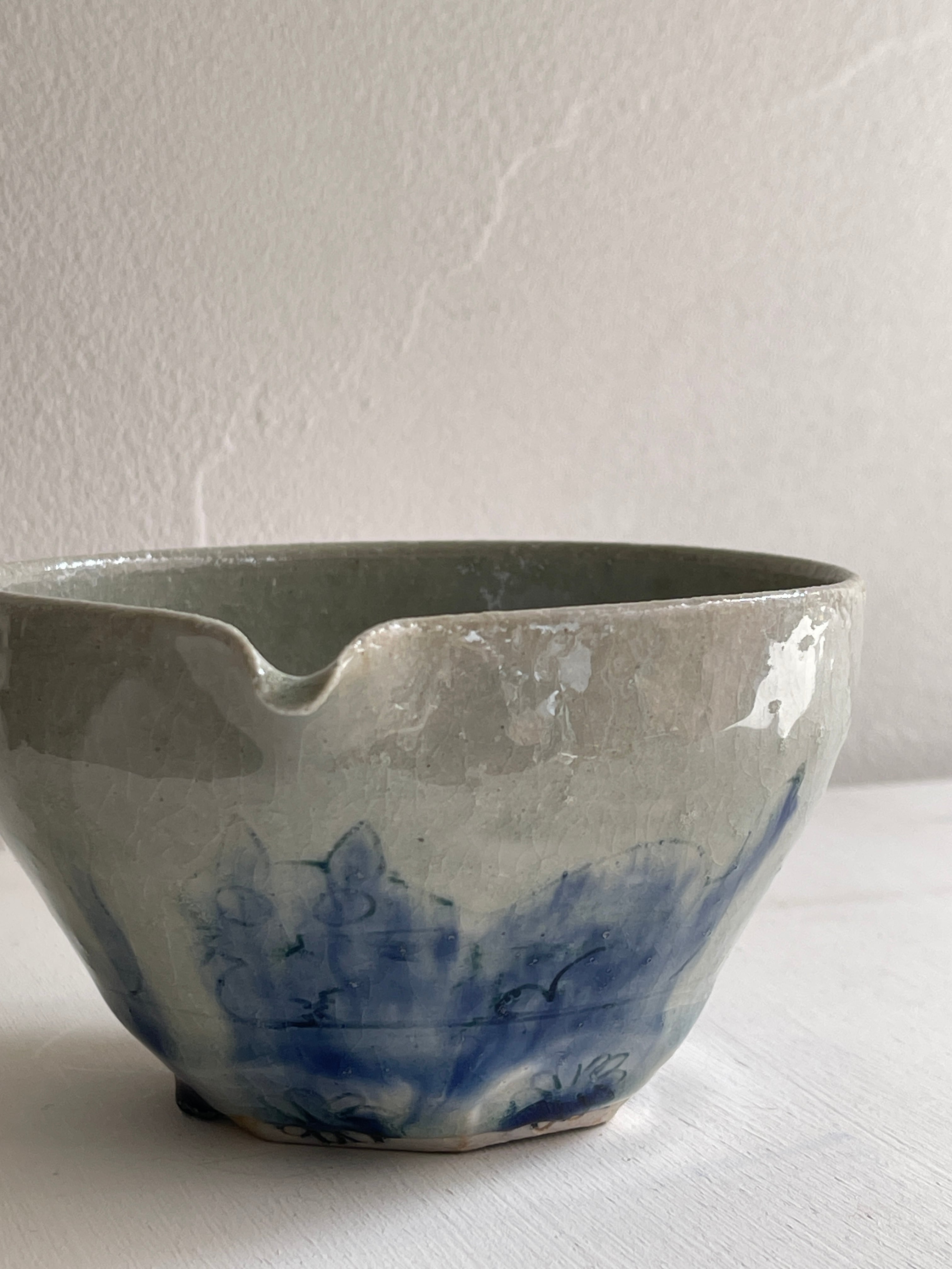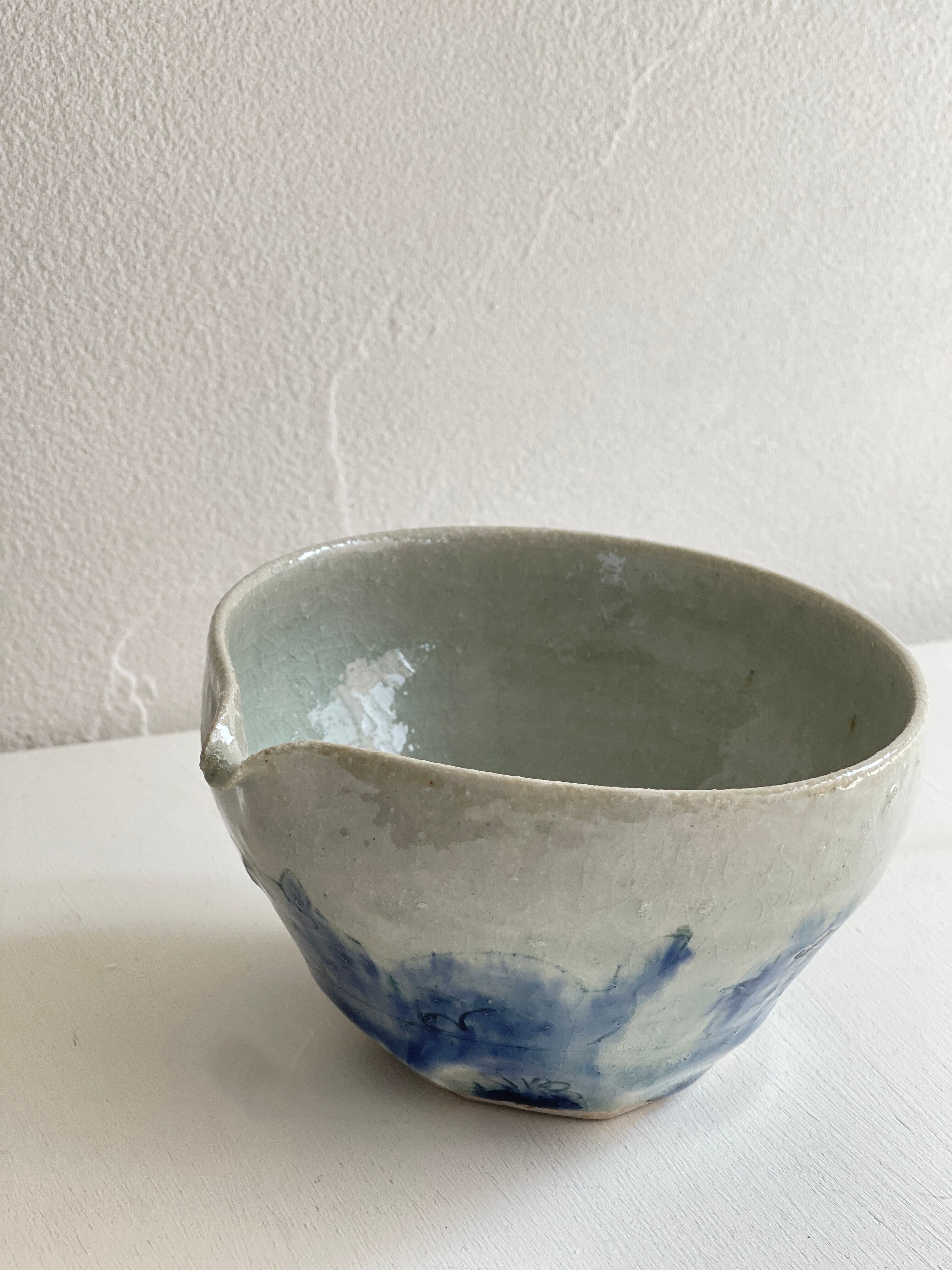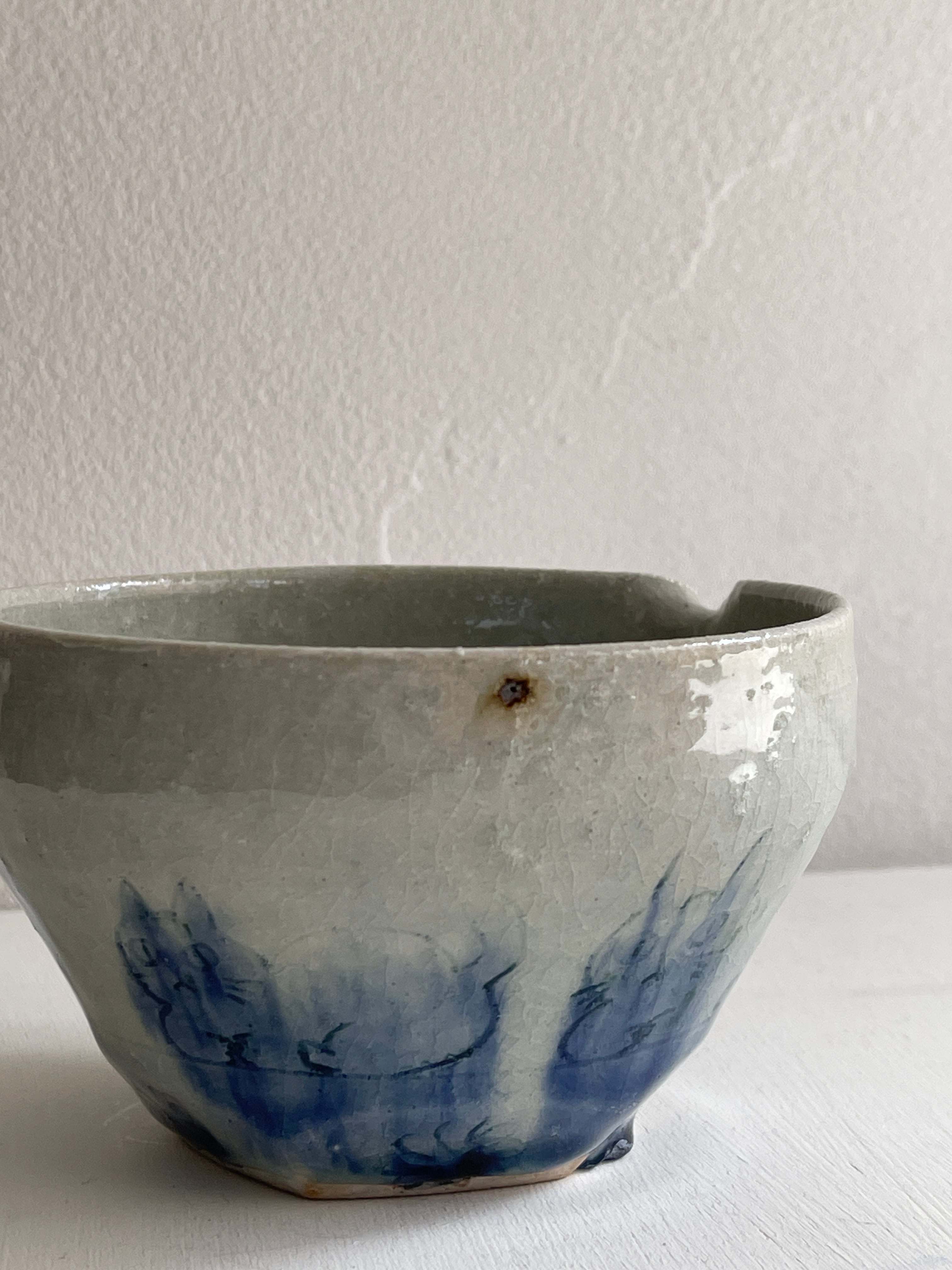 淡い呉須で猫の絵が描かれた片口鉢です。ほどよい大きさなので液体を入れても、お惣菜などを入れても。