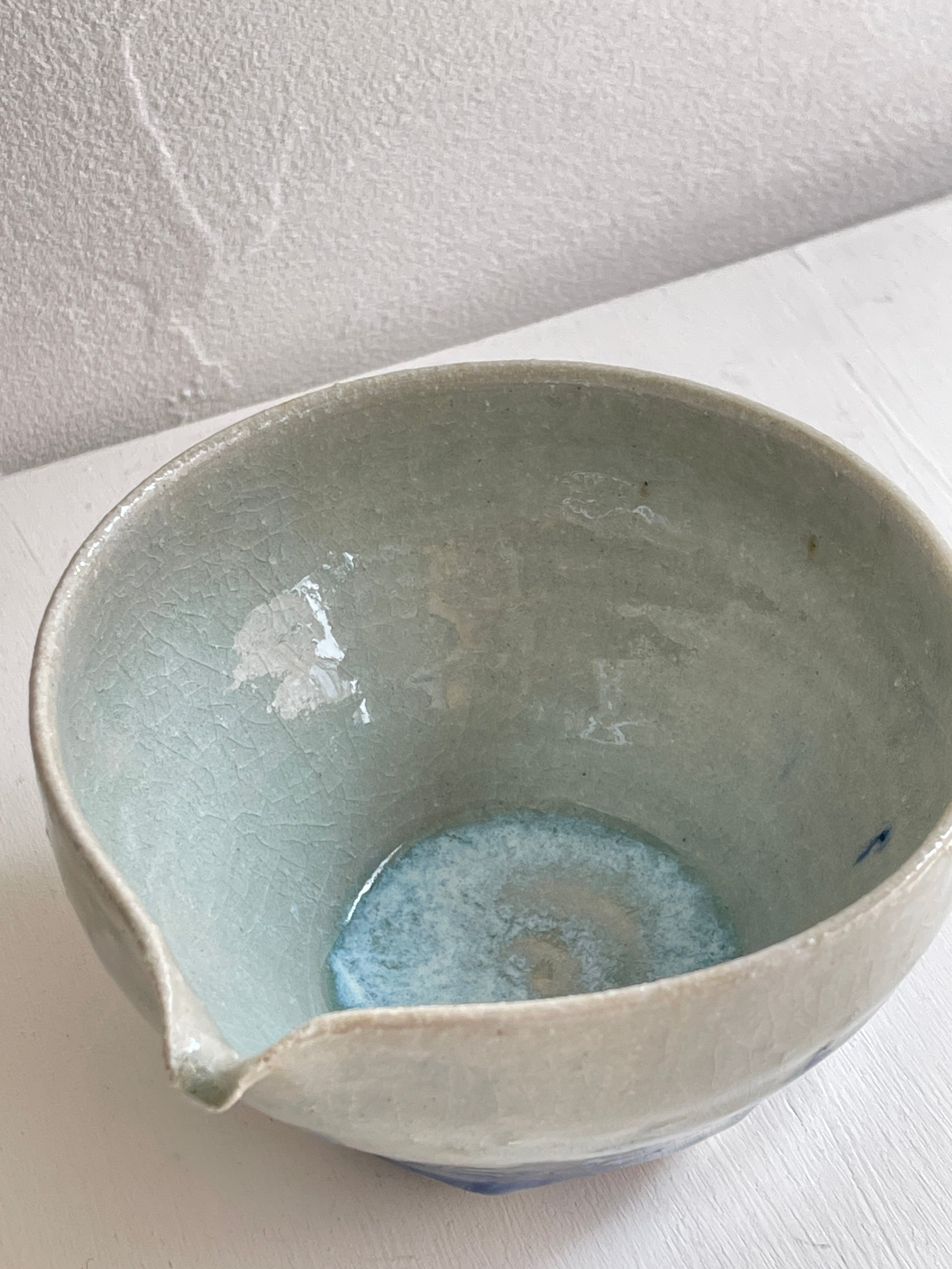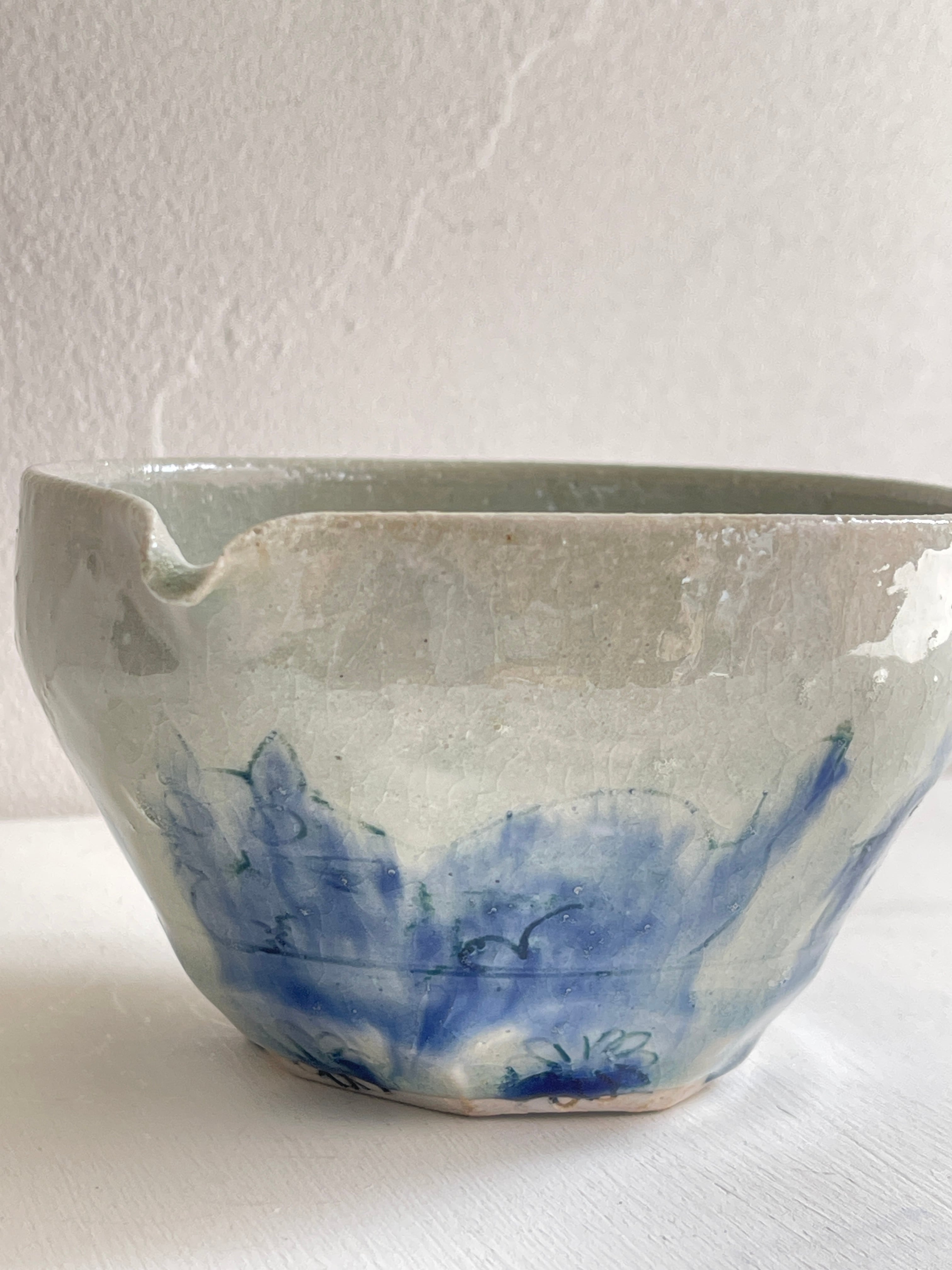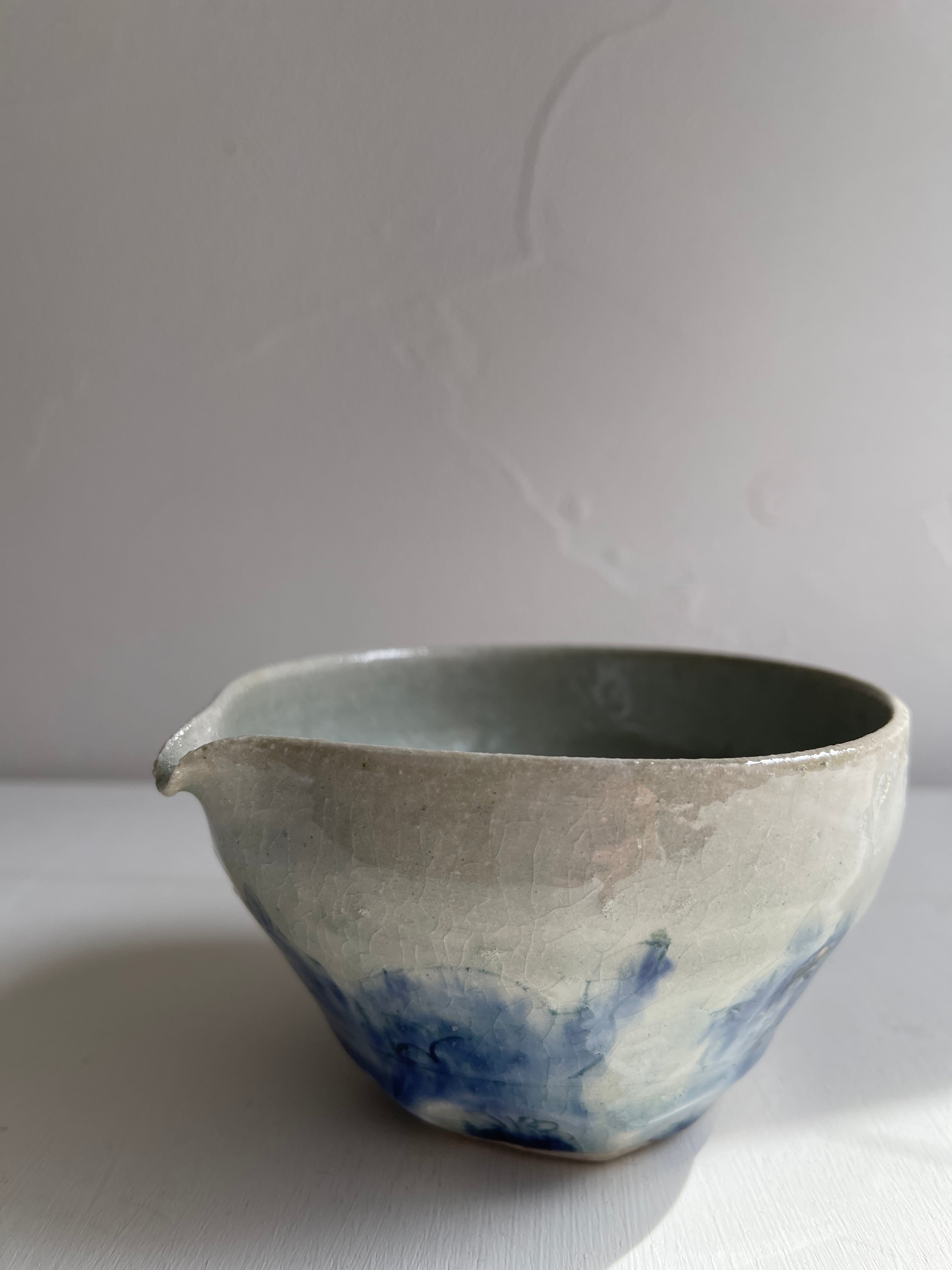 淡い呉須で猫の絵が描かれた片口鉢です。ほどよい大きさなので液体を入れても、お惣菜などを入れても。