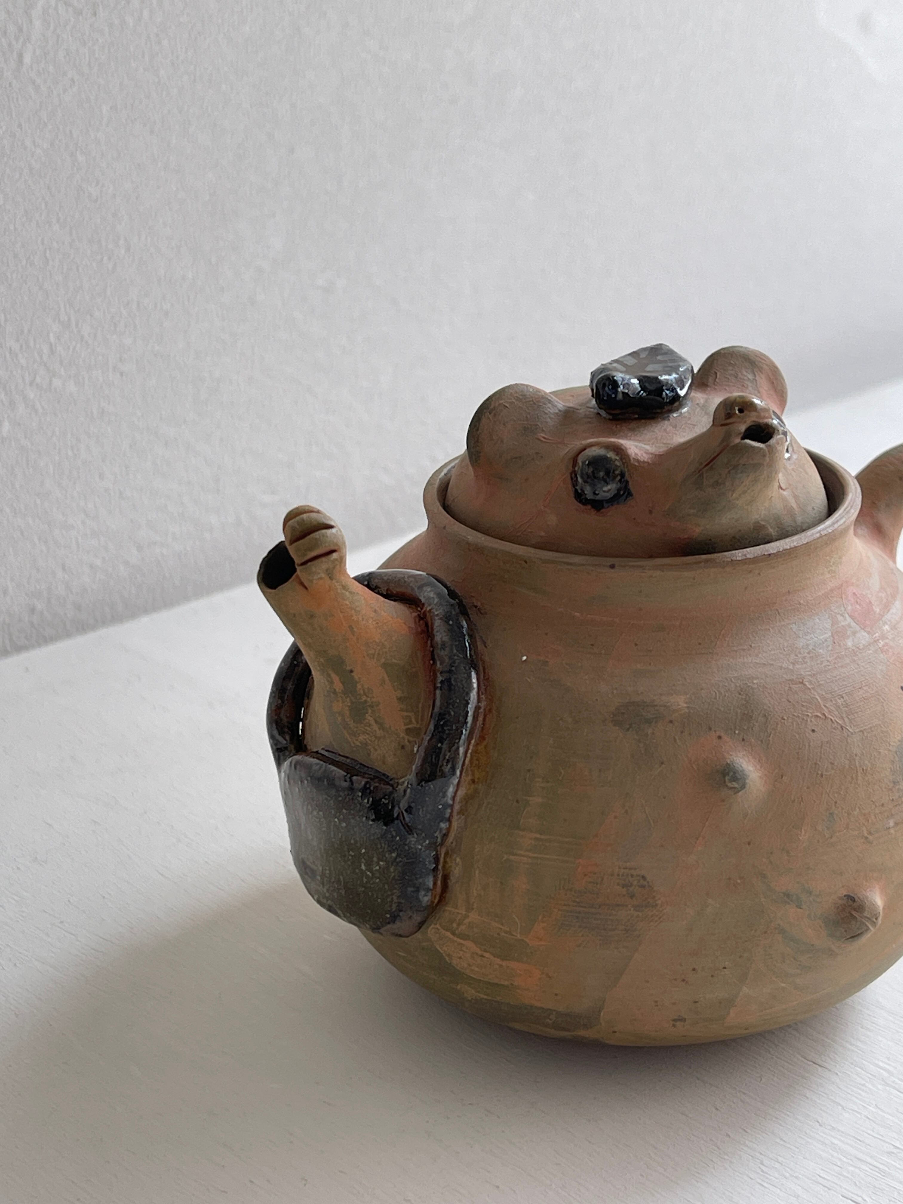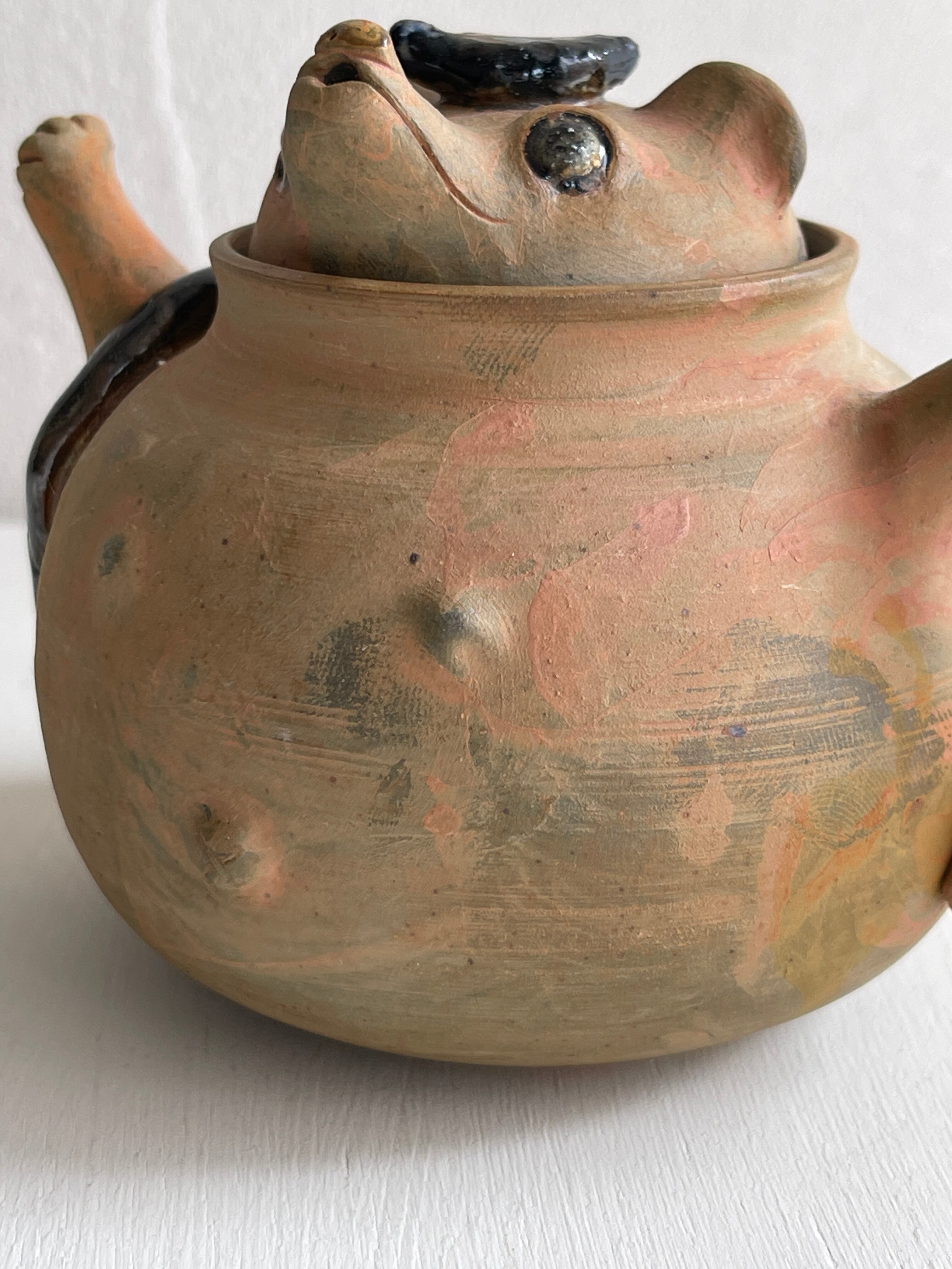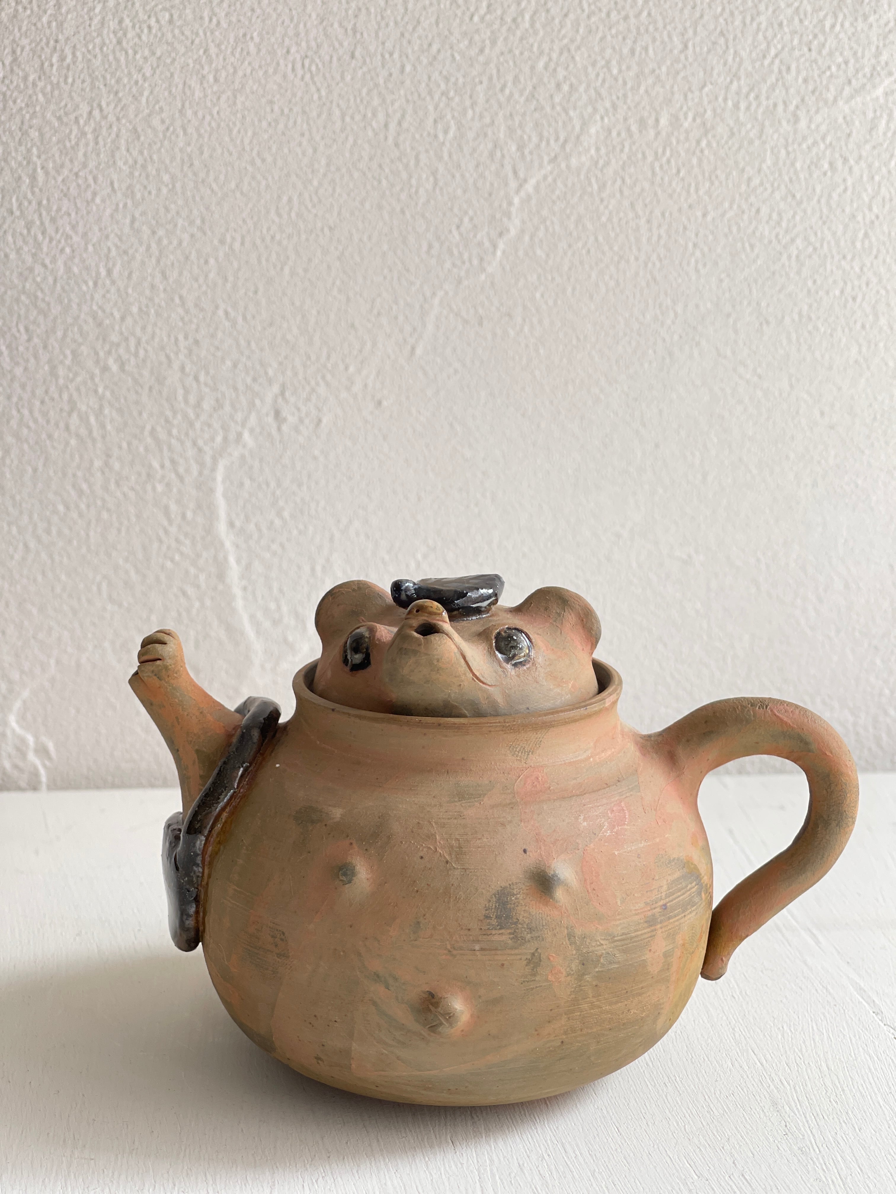 ぽんぽこ狸の急須です。一人用の茶器として、中国茶などにお薦めのサイズ。狸の表情やバッグを持っている腕、注ぎ口の手など…繊細に作られています。