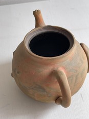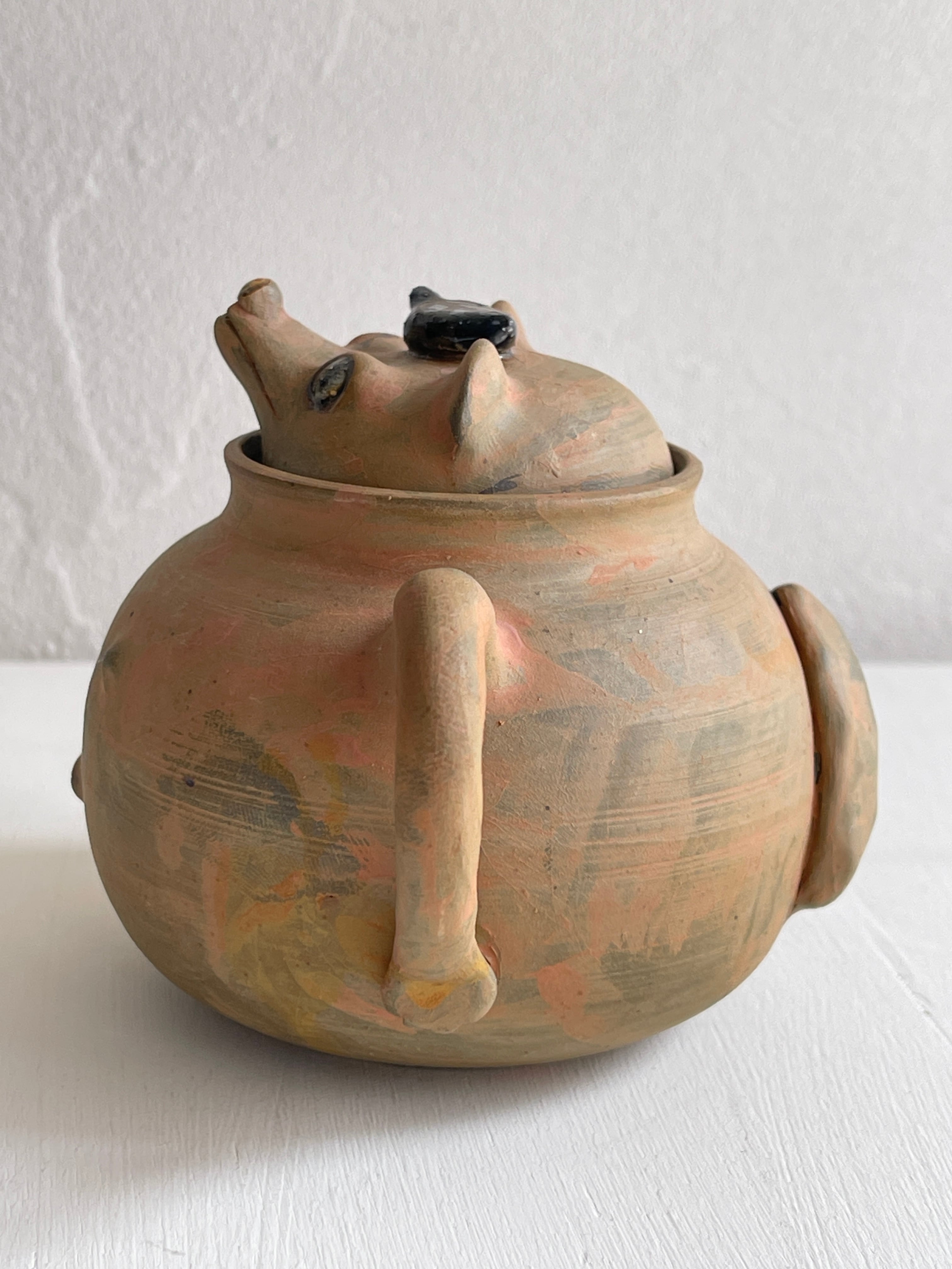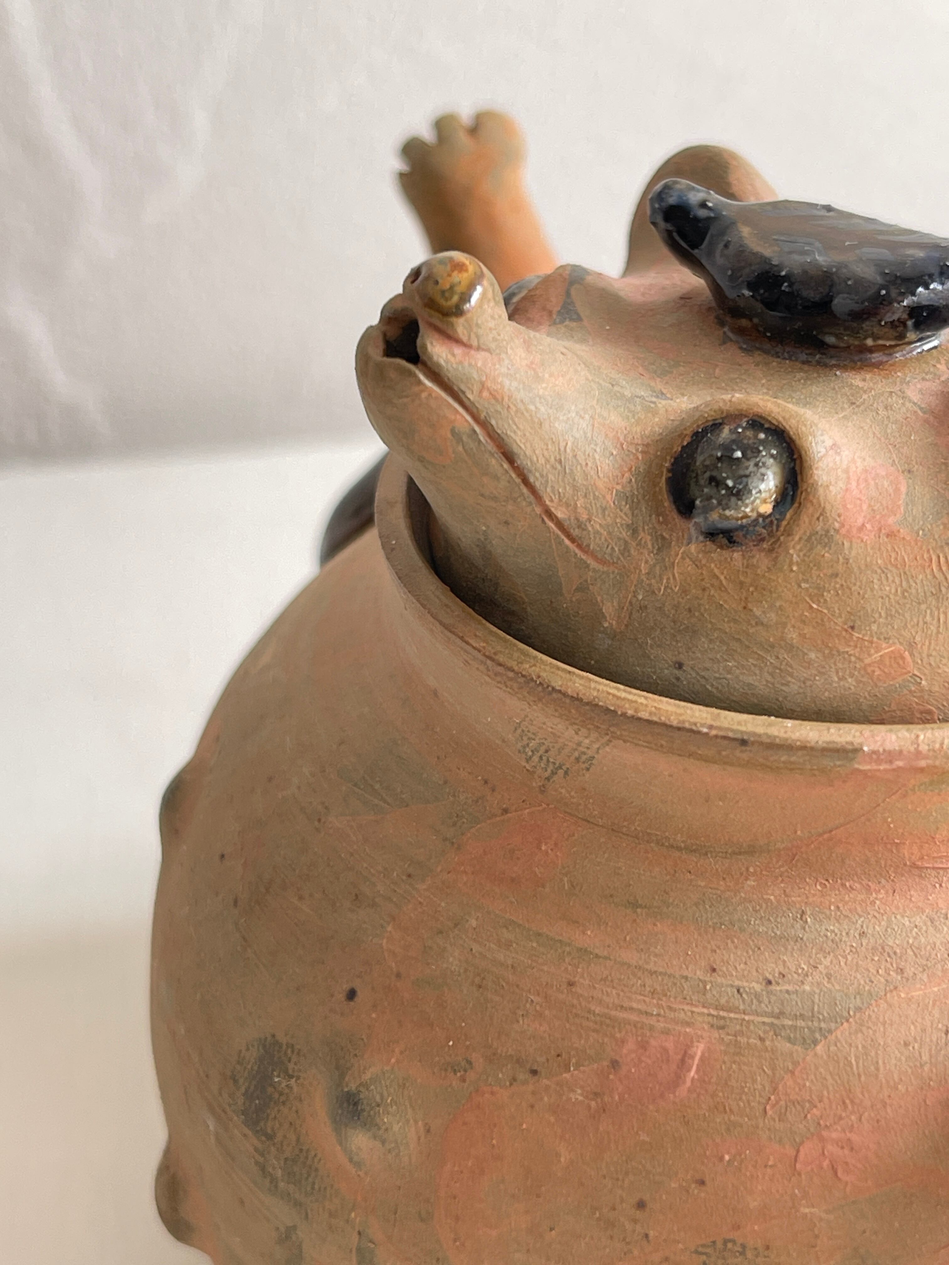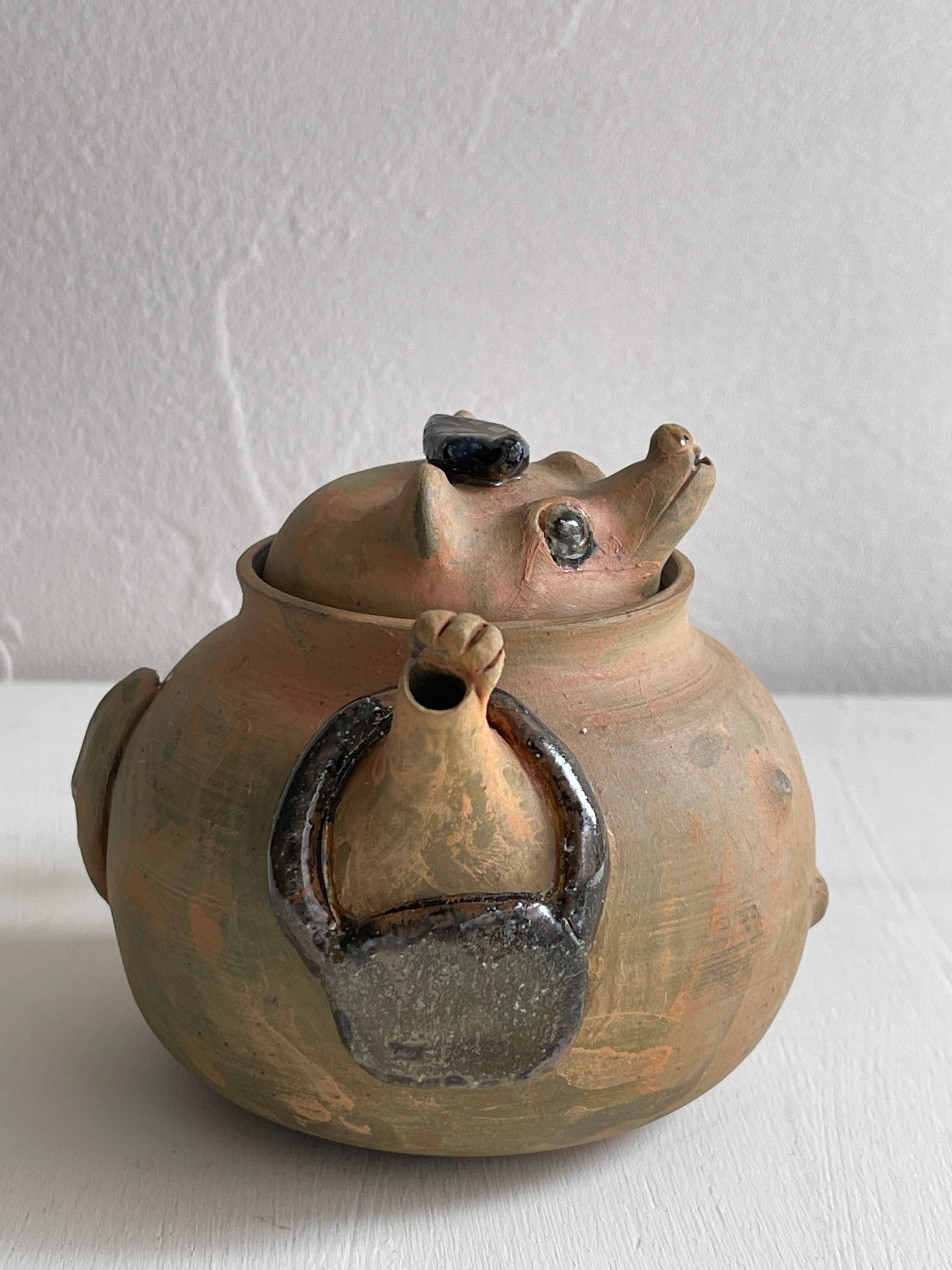 ぽんぽこ狸の急須です。一人用の茶器として、中国茶などにお薦めのサイズ。狸の表情やバッグを持っている腕、注ぎ口の手など…繊細に作られています。
