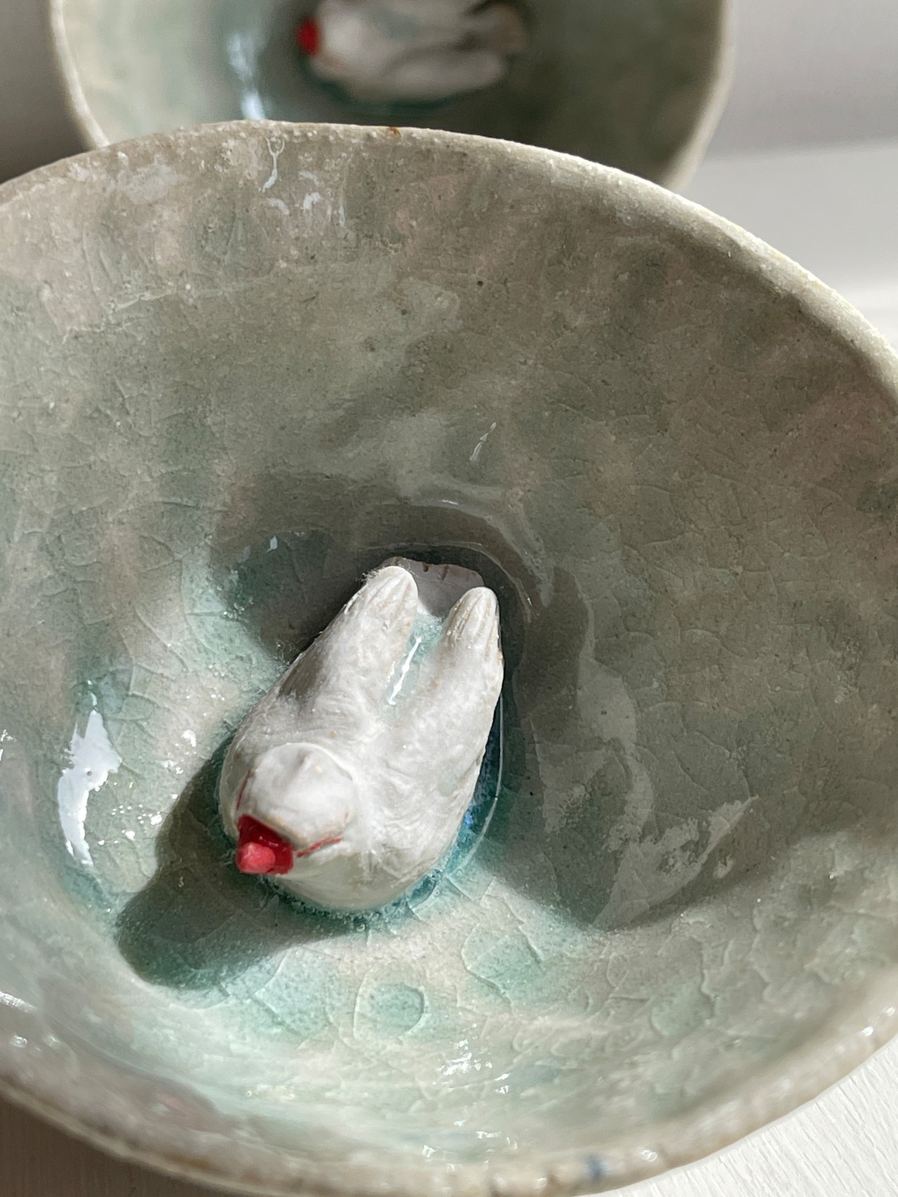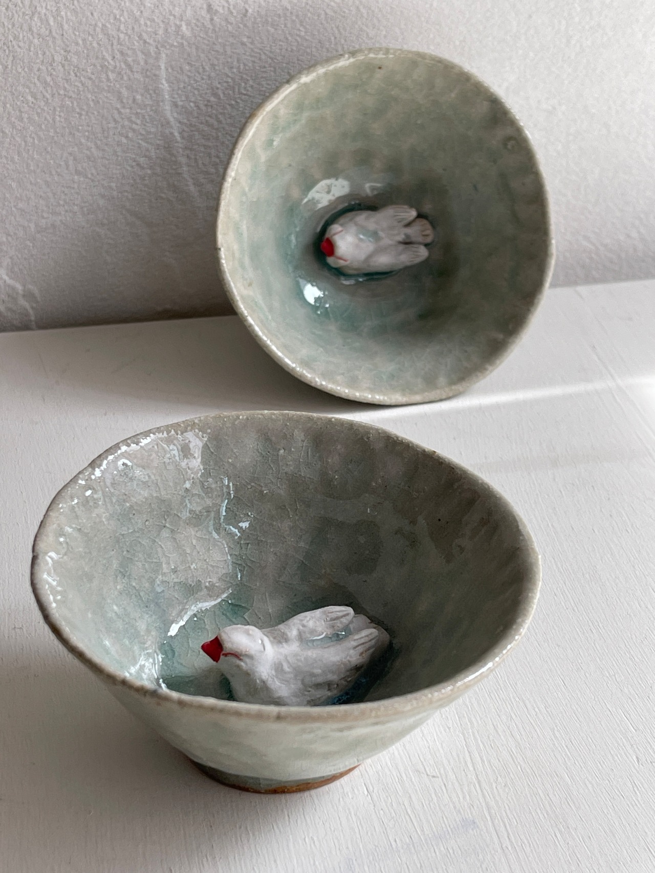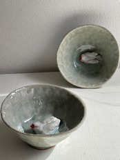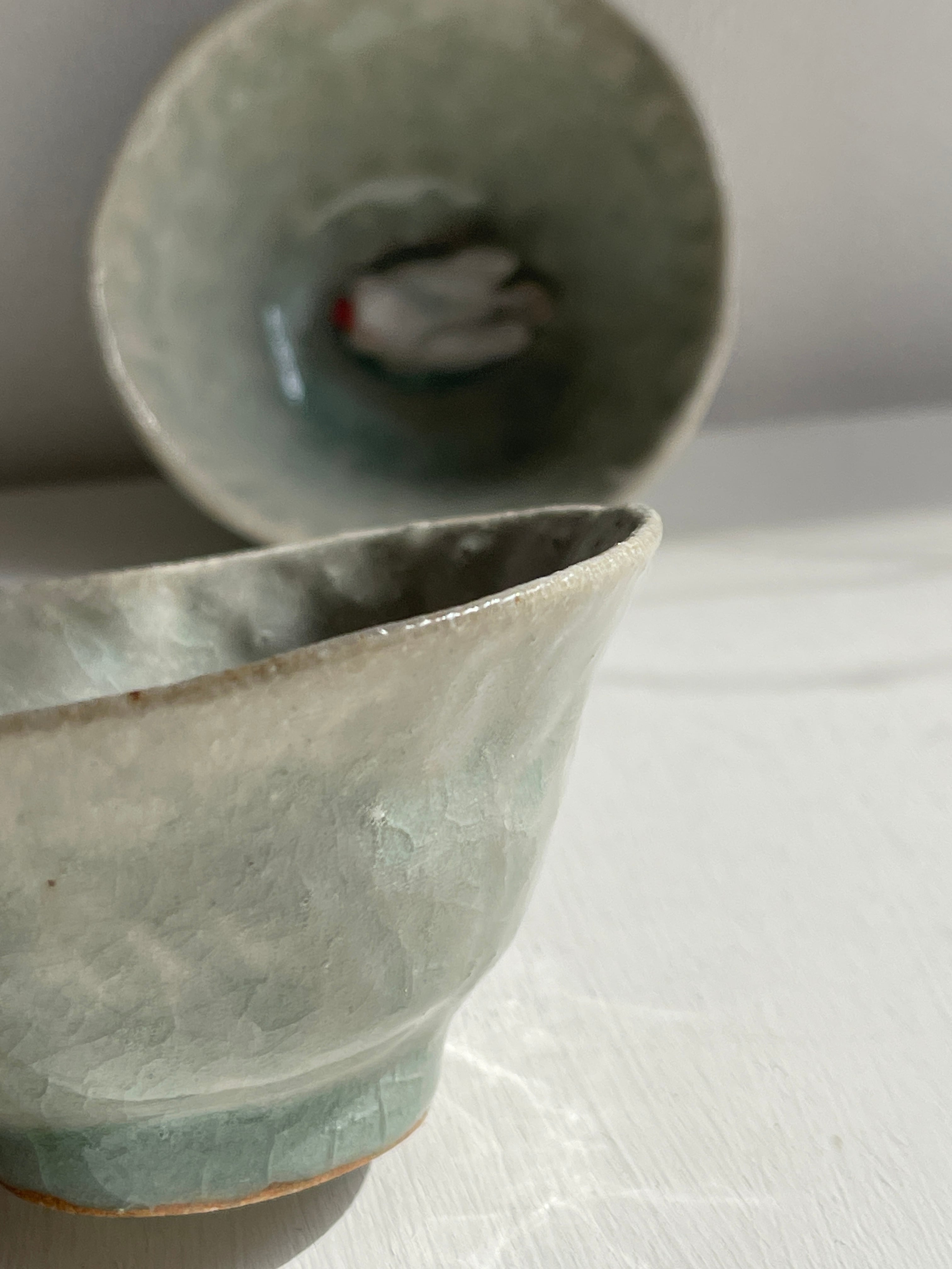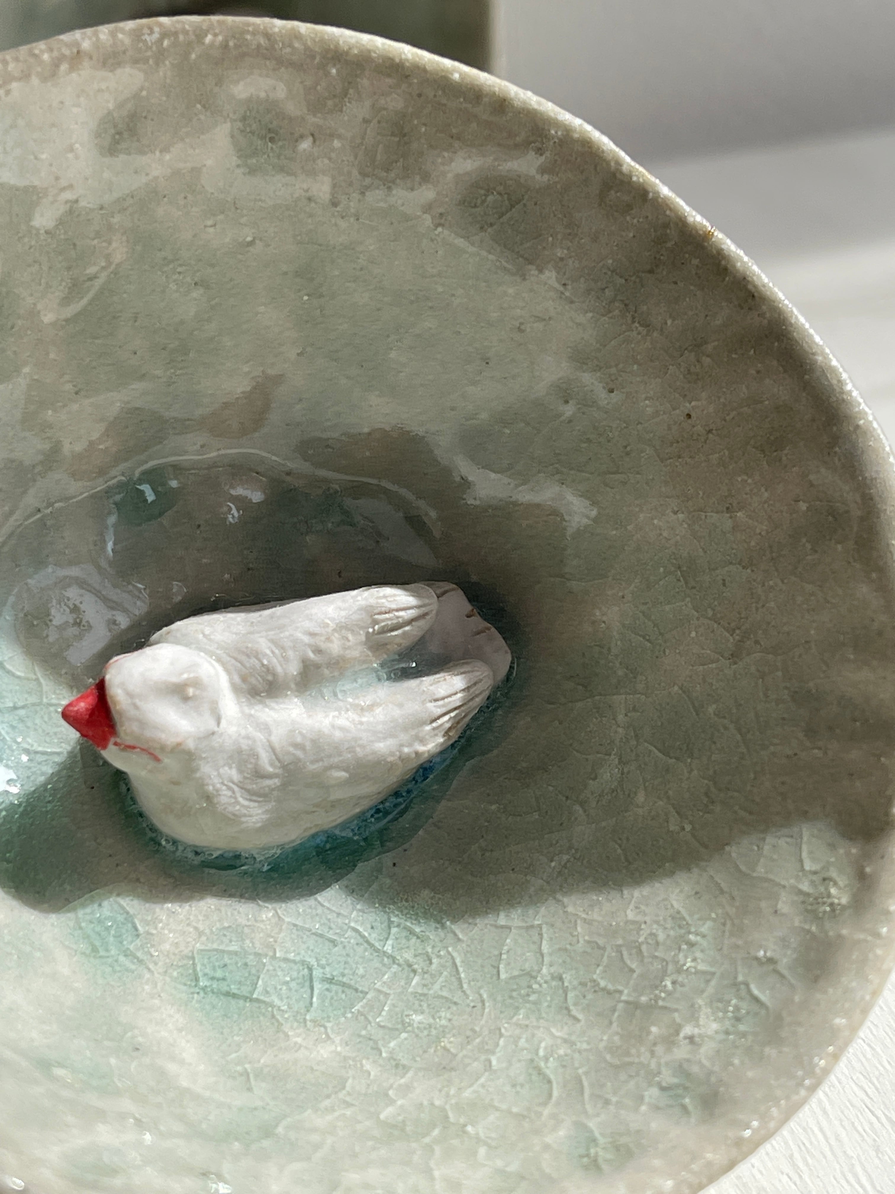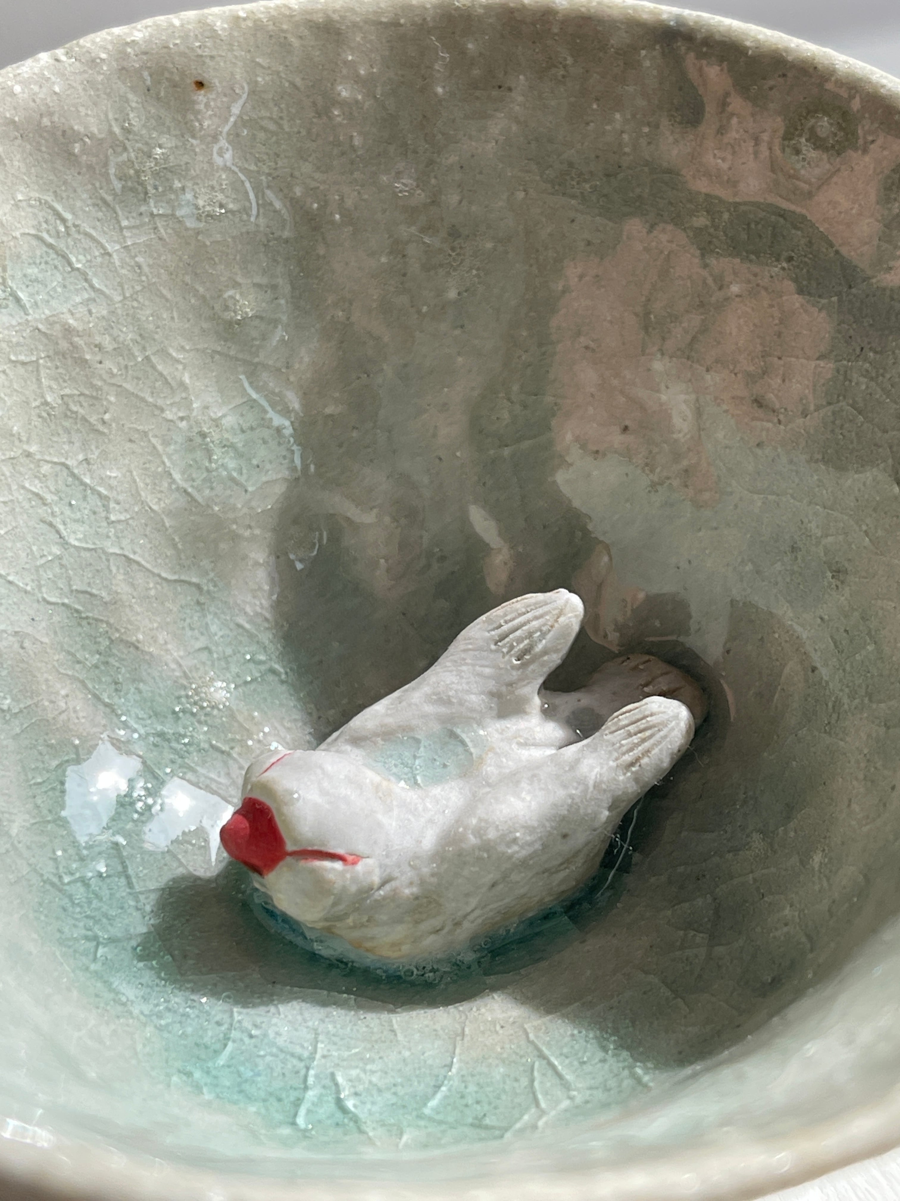 淡い涼し気な色合いの小さな器の中に、立体的な文鳥がいる酒杯です。お酒を入れたら文鳥が水浴び?酒浴び?している姿に。酒杯以外にもインテリアとして飾りたい作品。