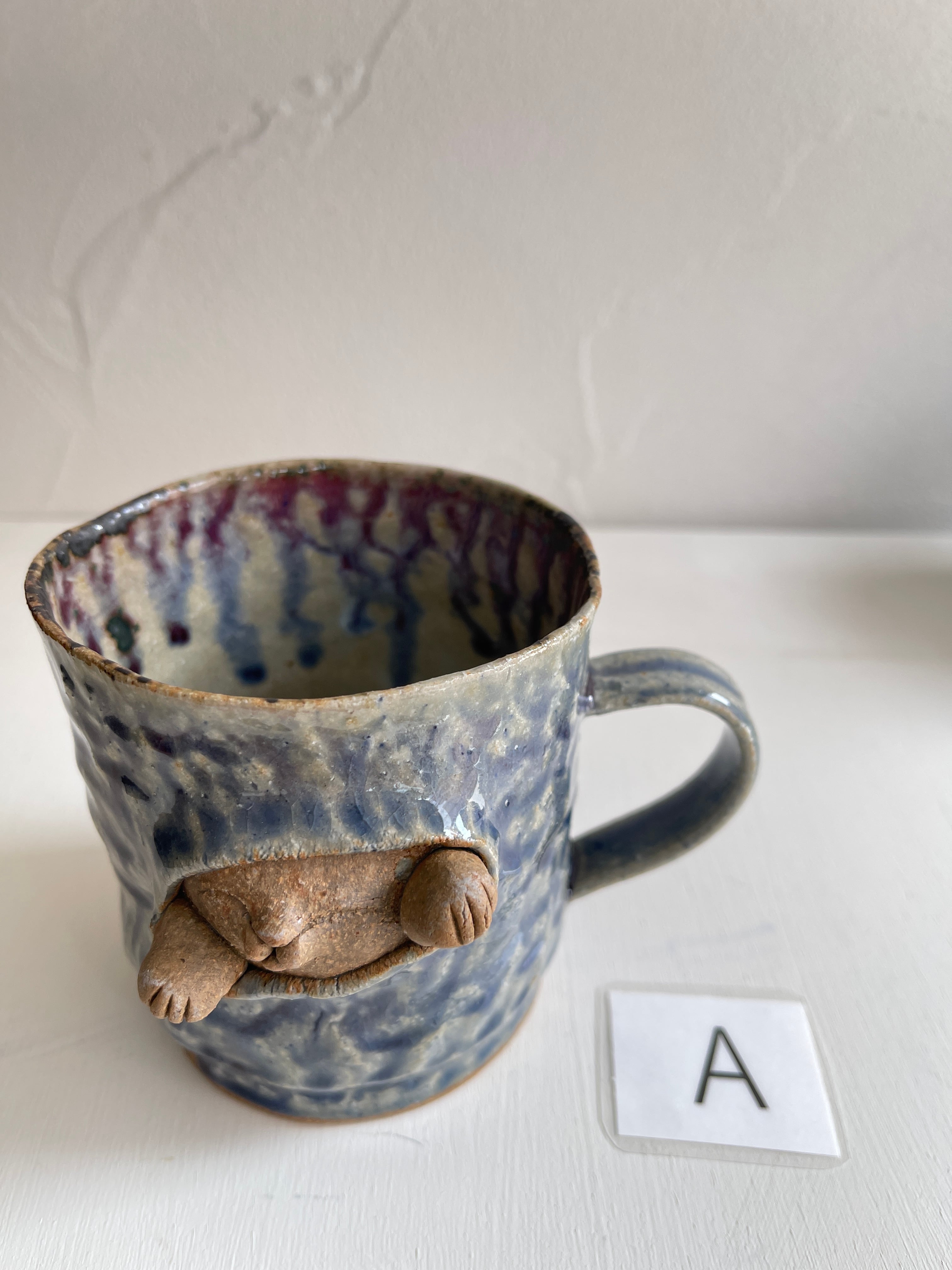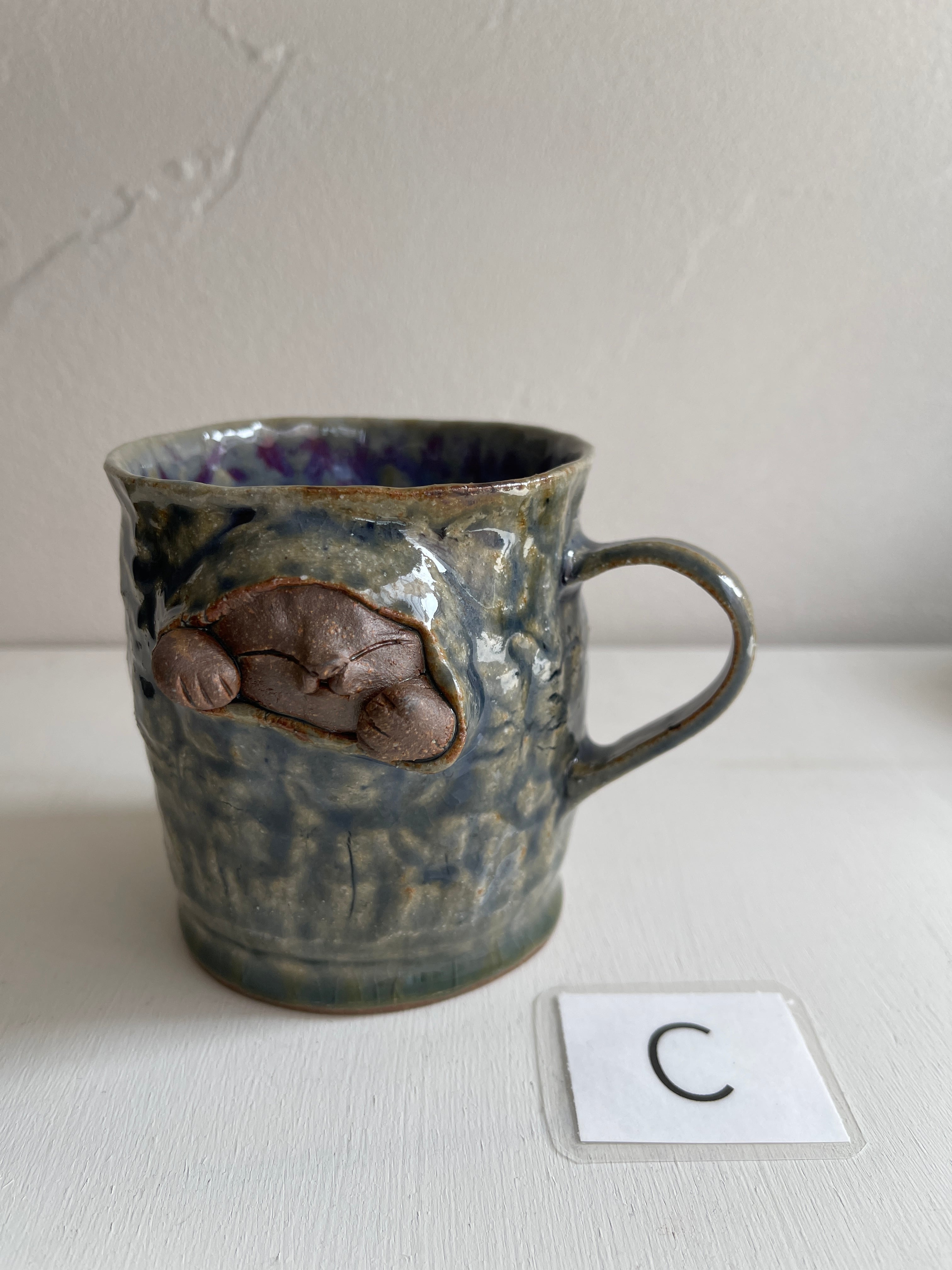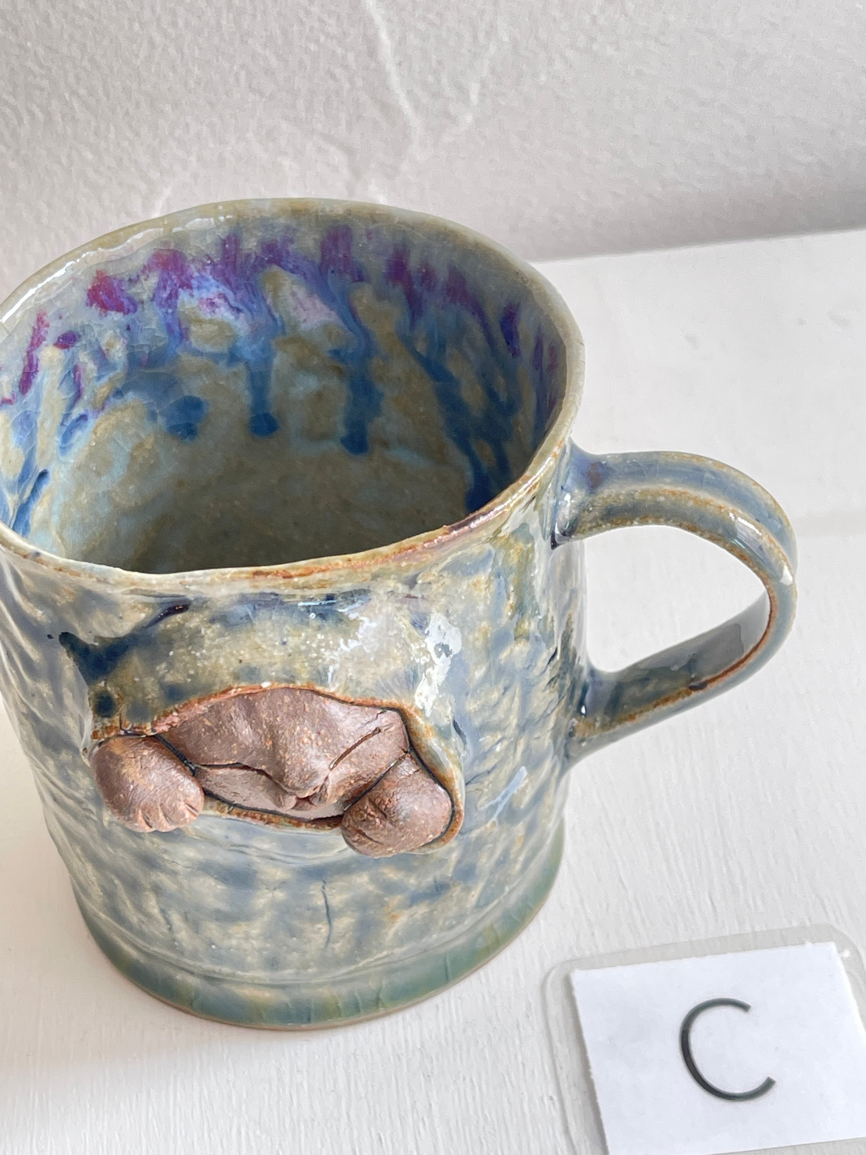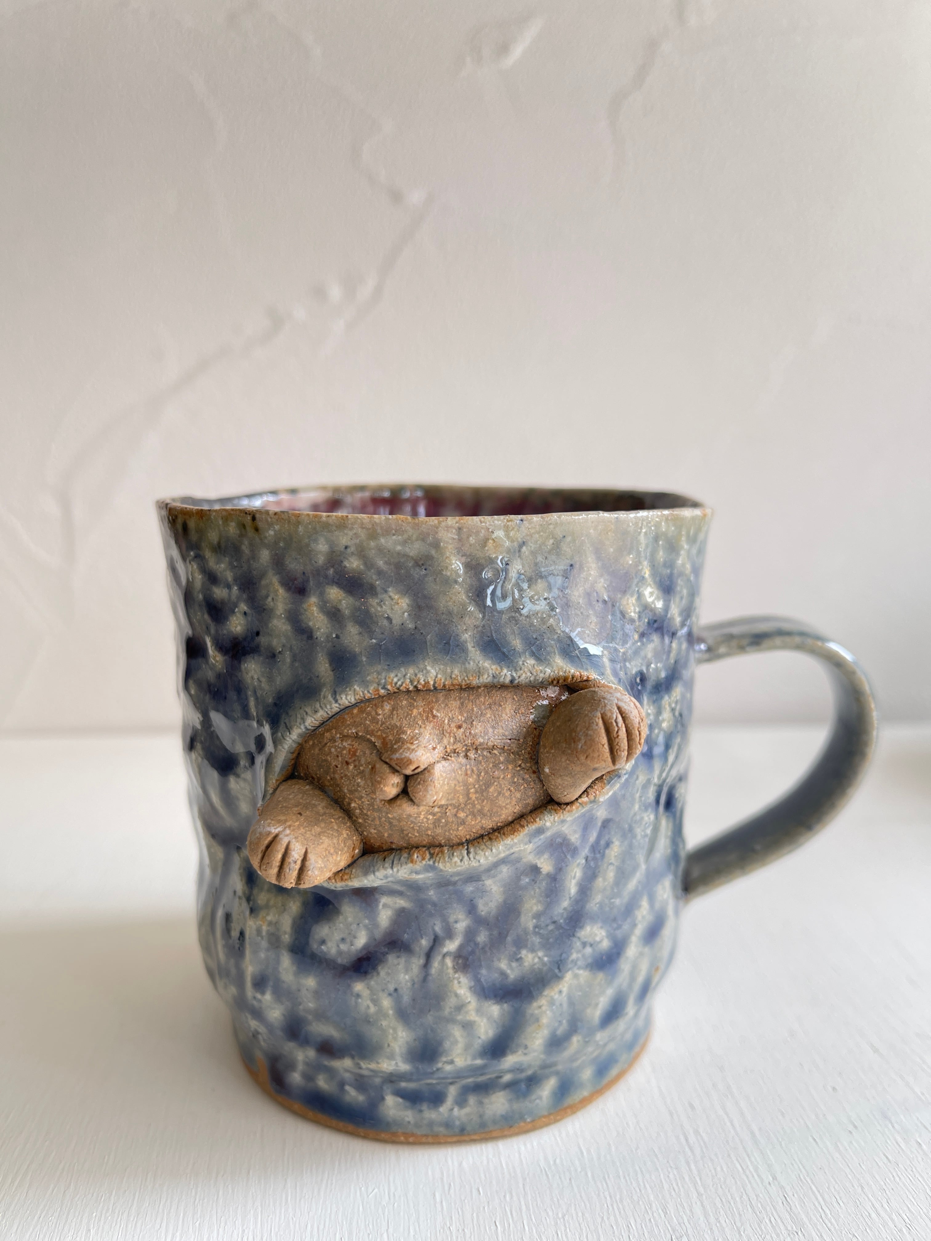 紺碧の青のような色合いの大きなマグカップ。側面から猫が立体的に飛び出しています。