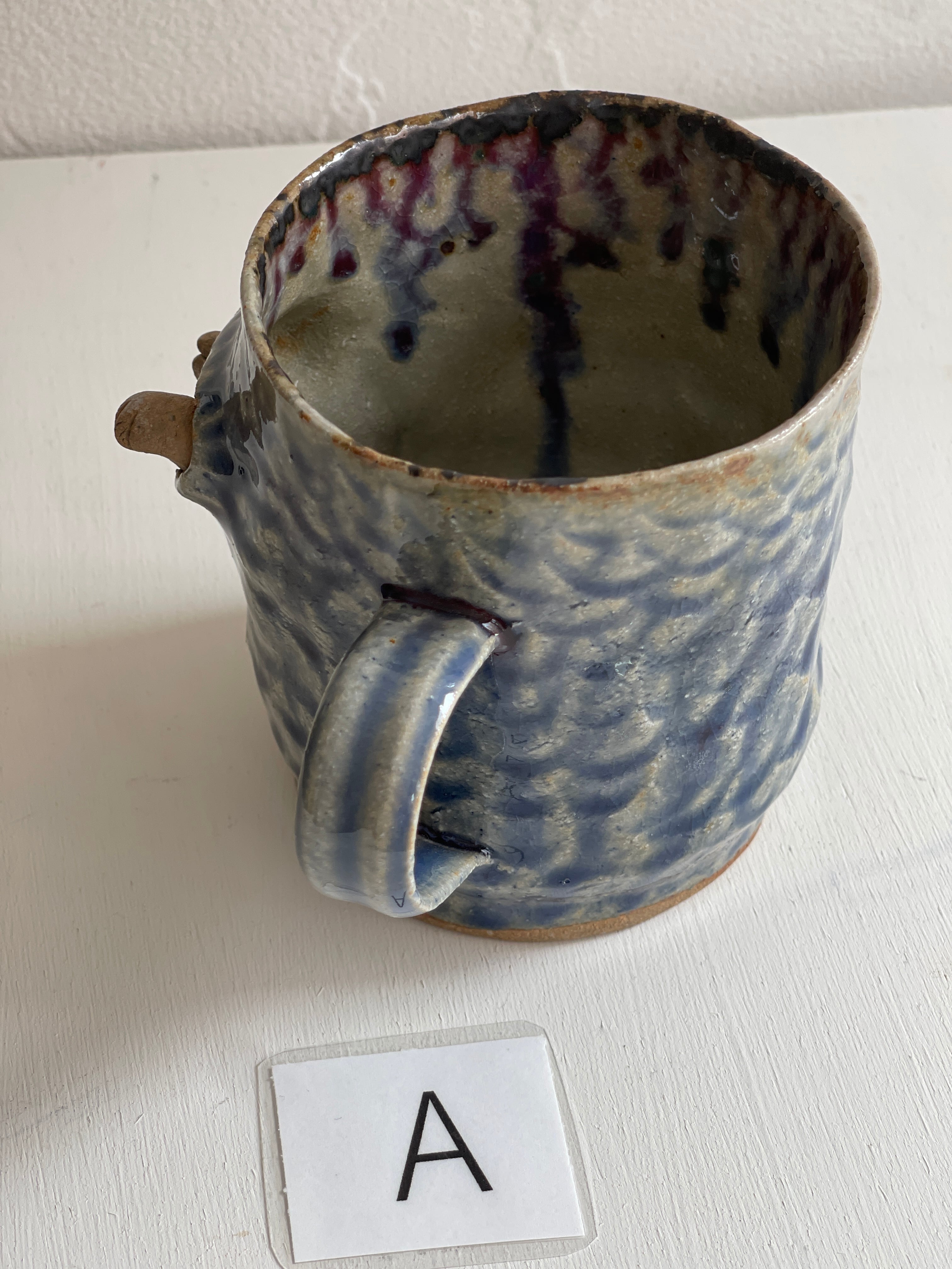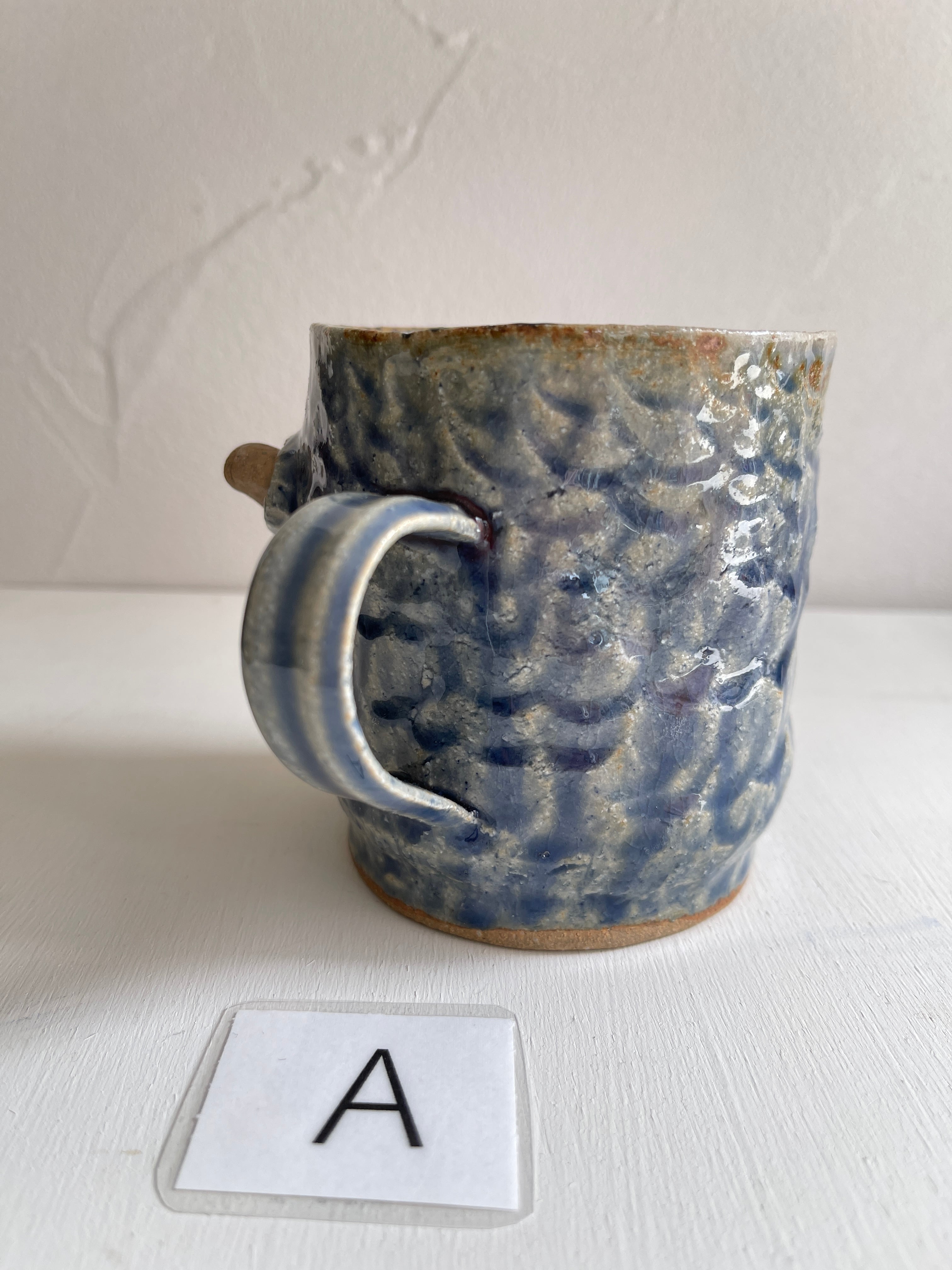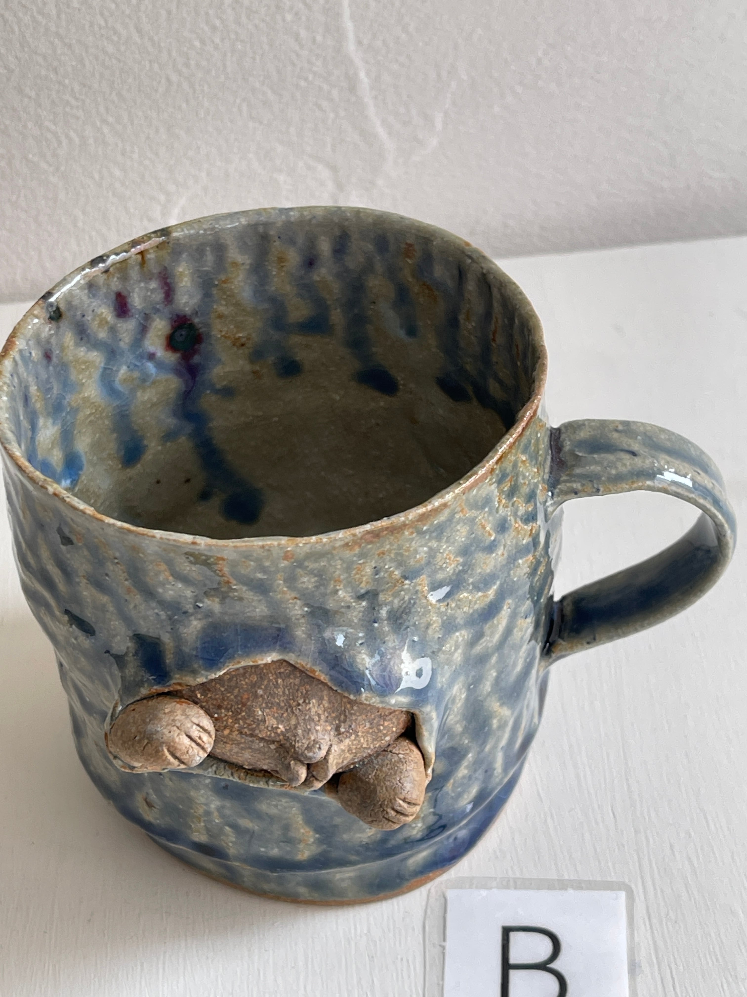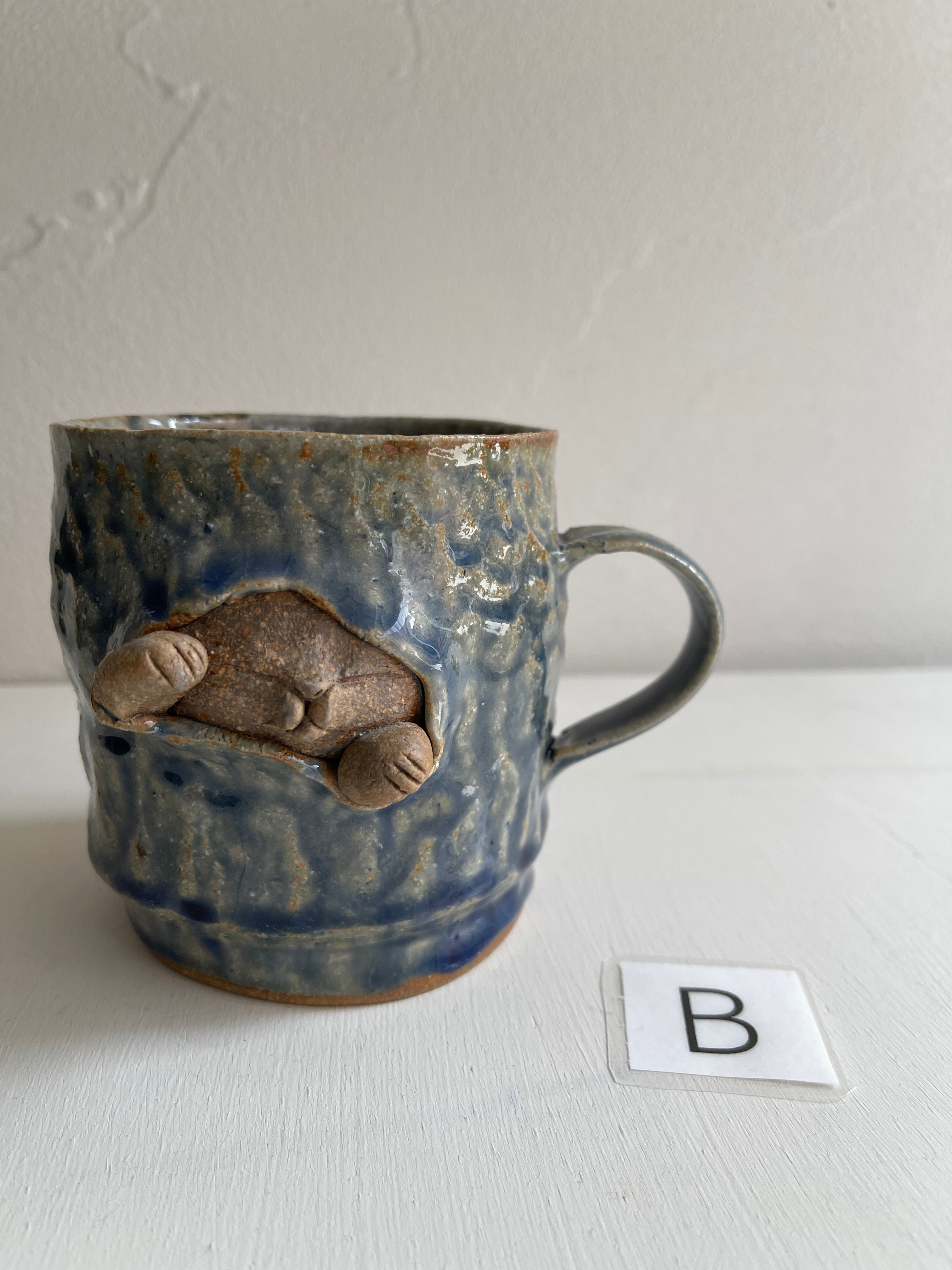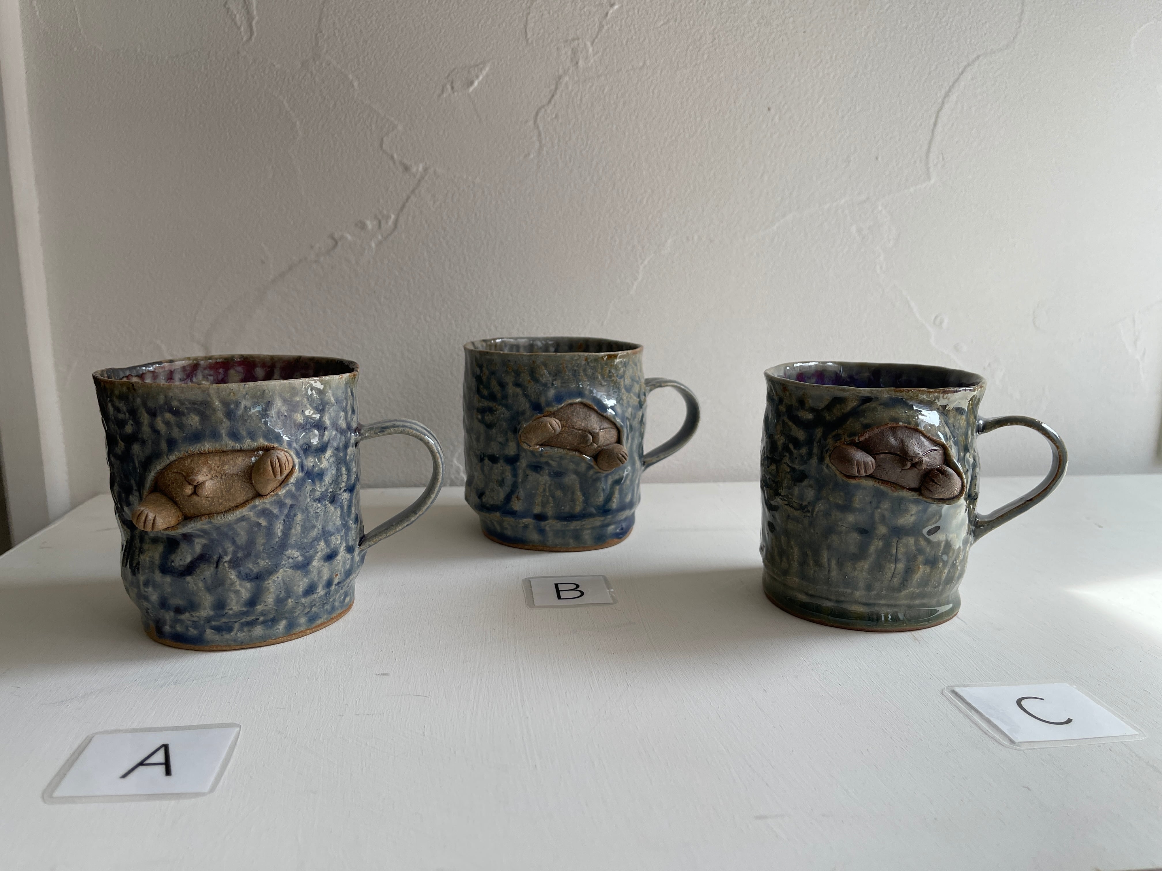 紺碧の青のような色合いの大きなマグカップ。側面から猫が立体的に飛び出しています。