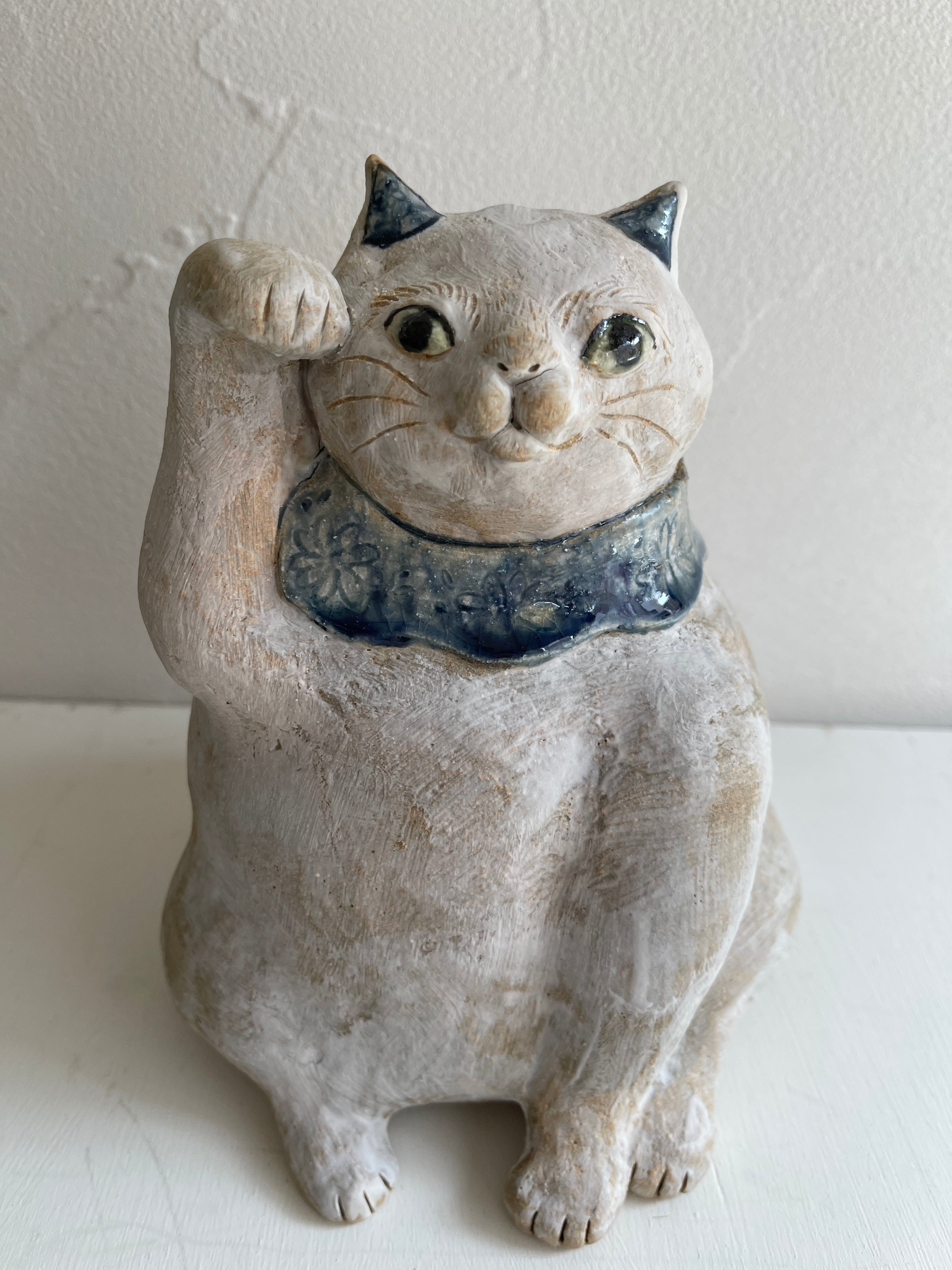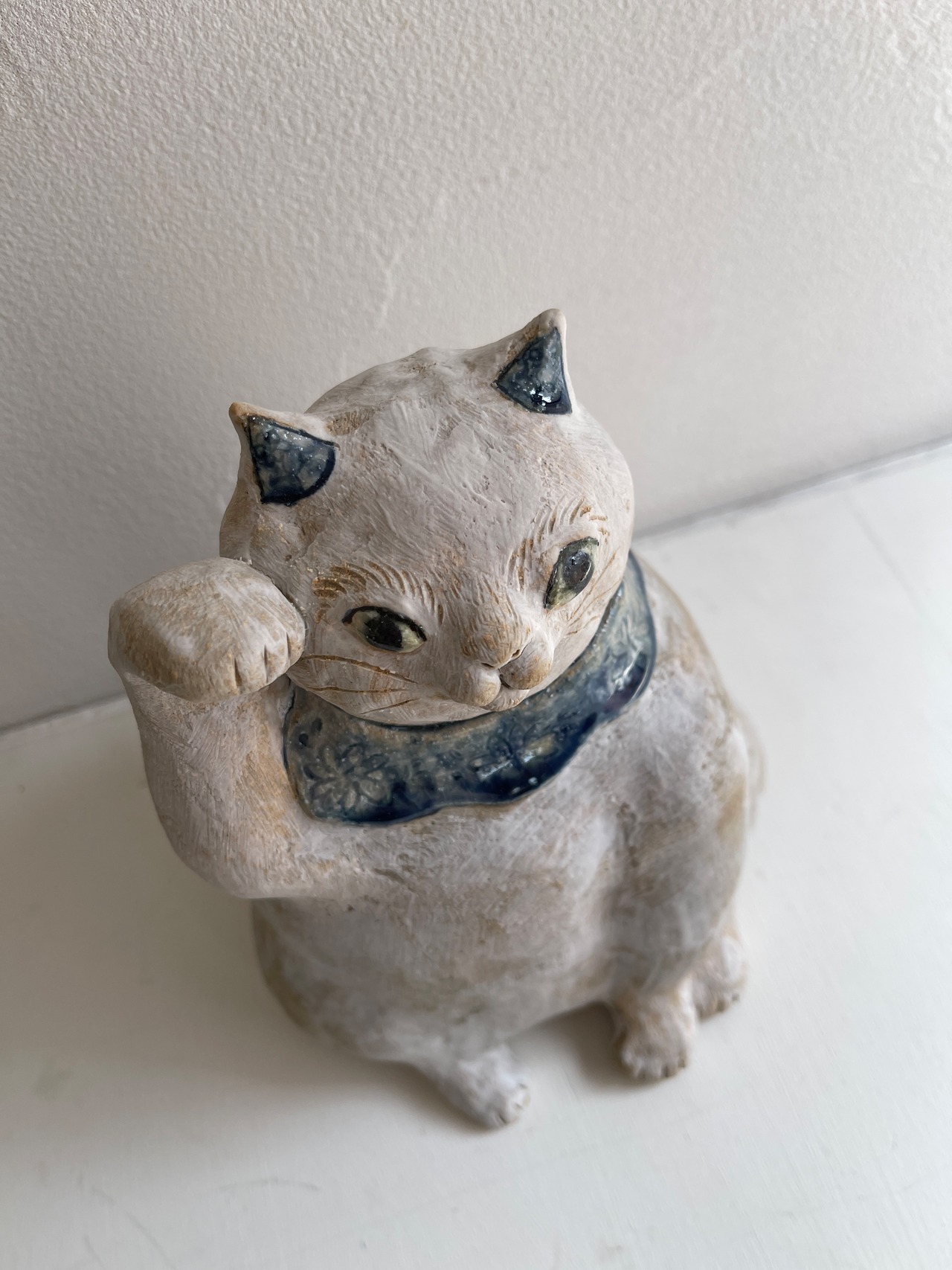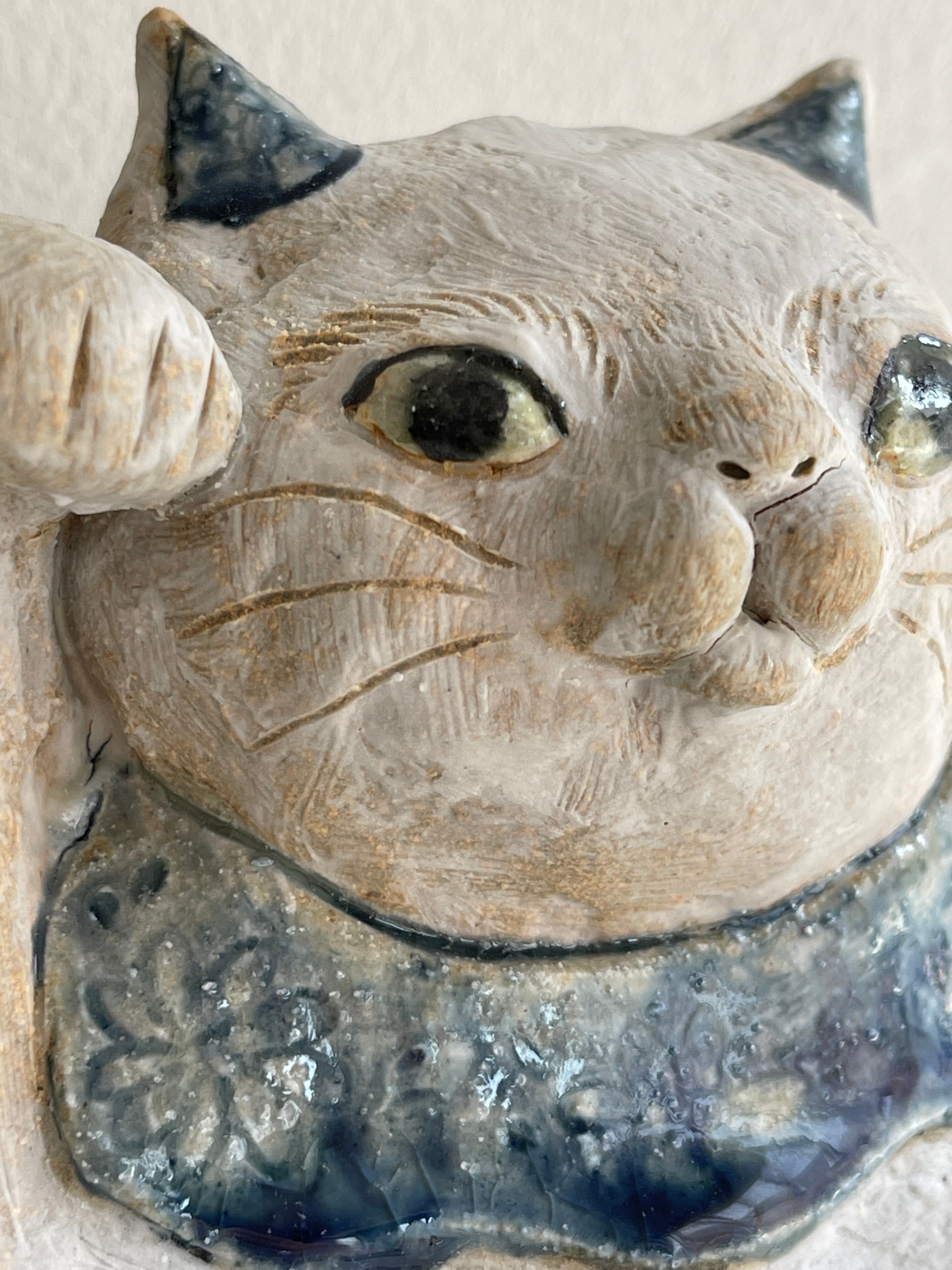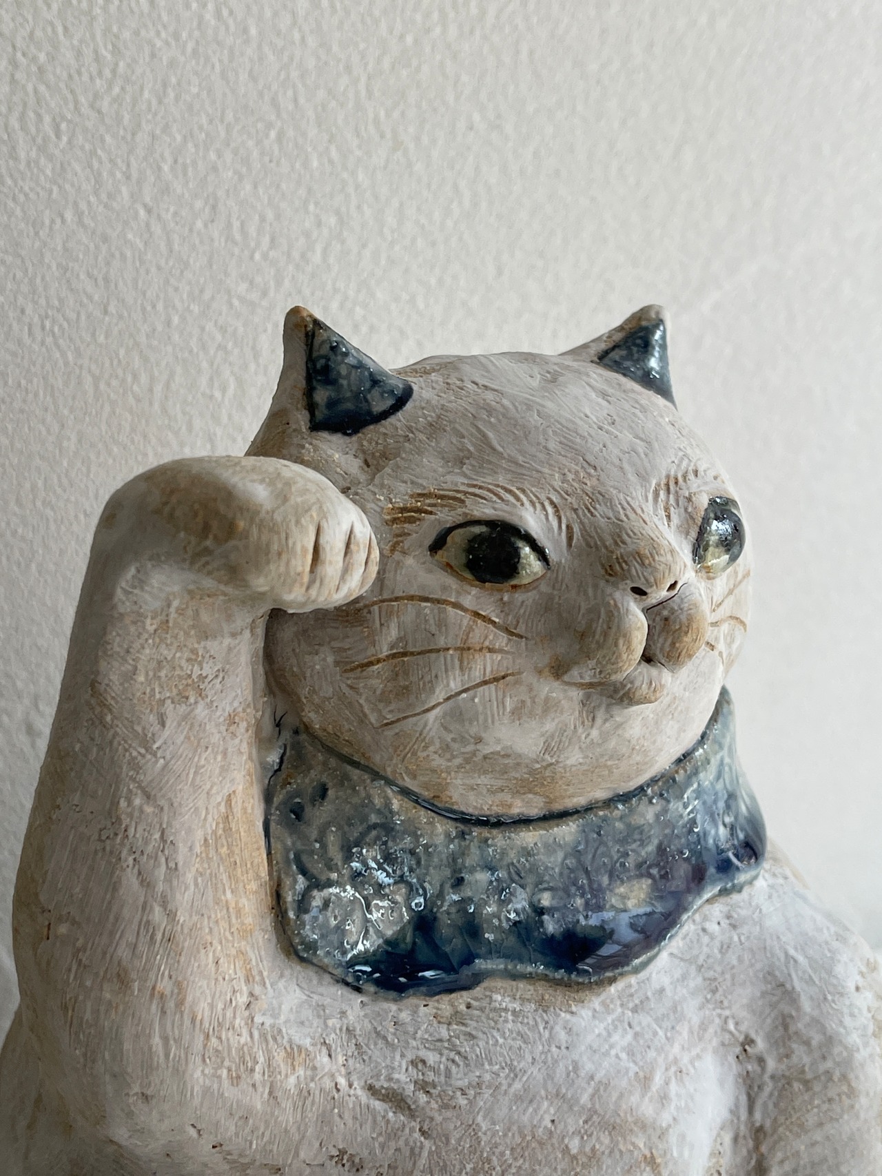 何とも表情豊かな猫ちゃんのオブジェです。右手は金運、幸運を招き、左手は人脈、客招きと言われています。両方招きたいですね。耳の傾きや、身体のふ立体感、顔の愛らしさ、陶器なのに毛並みまで感じ取れるような作品です。