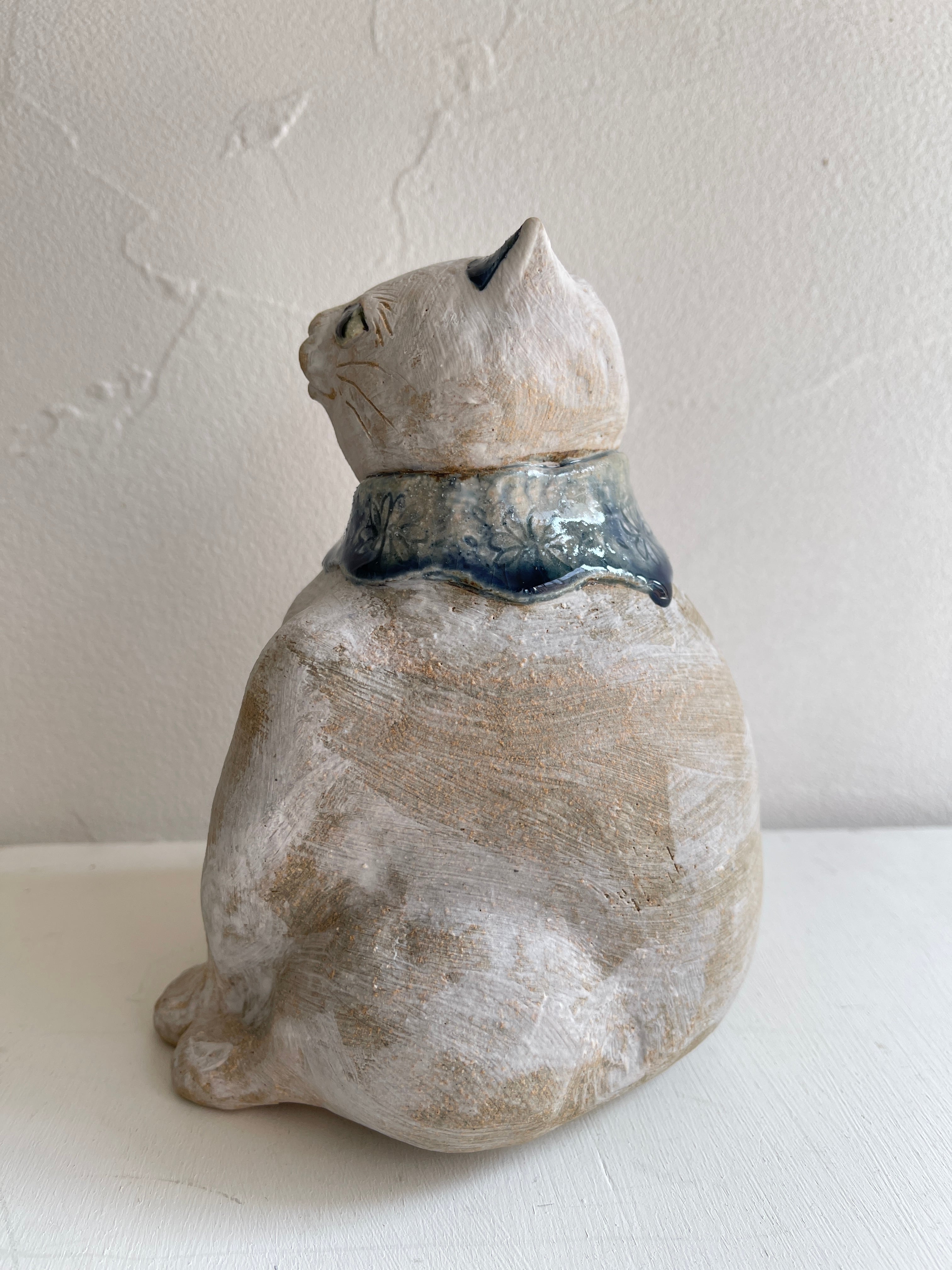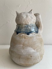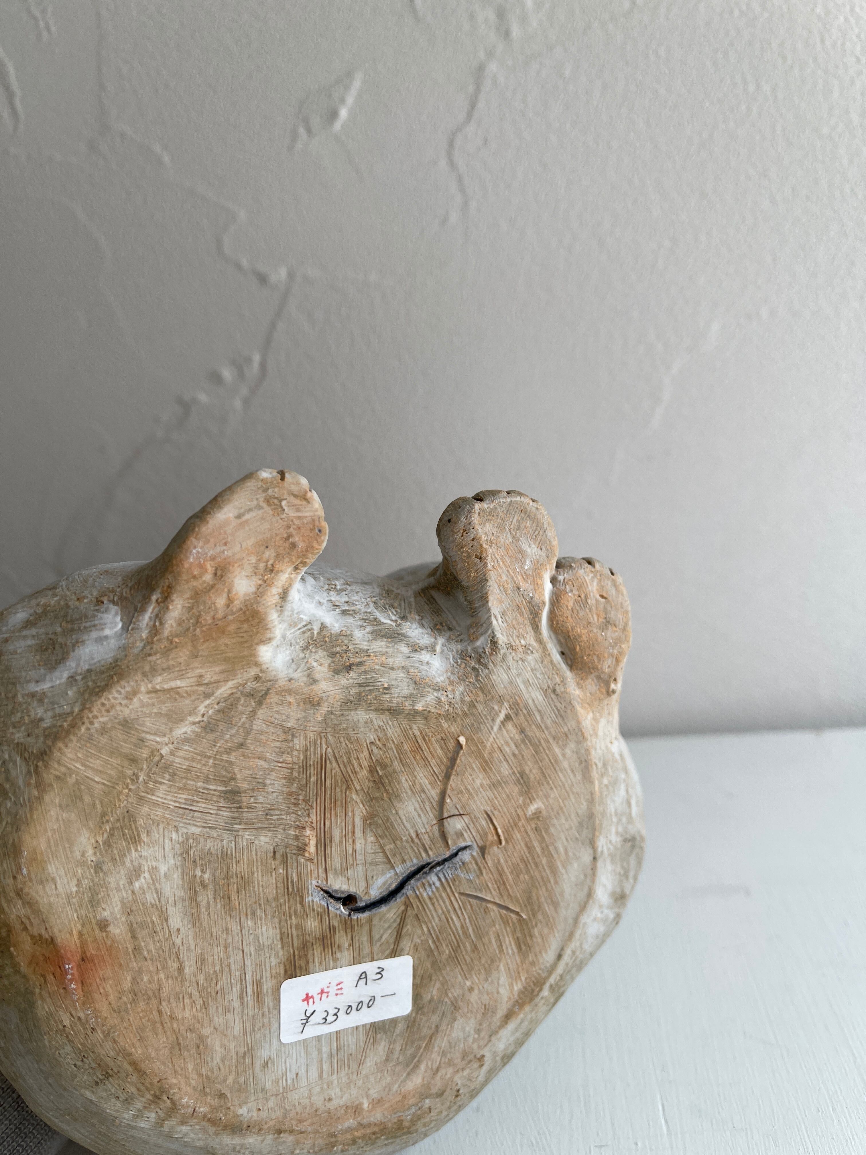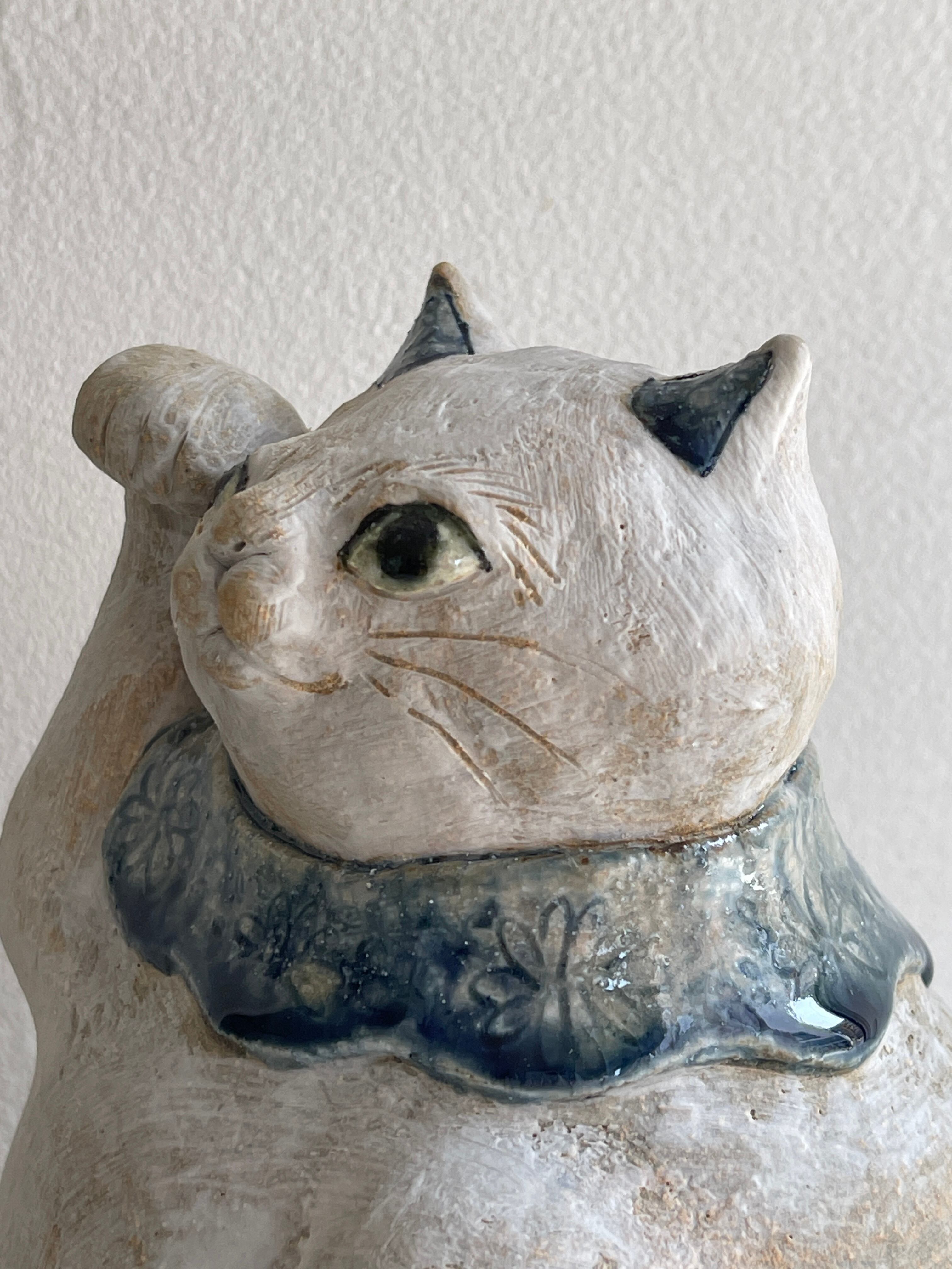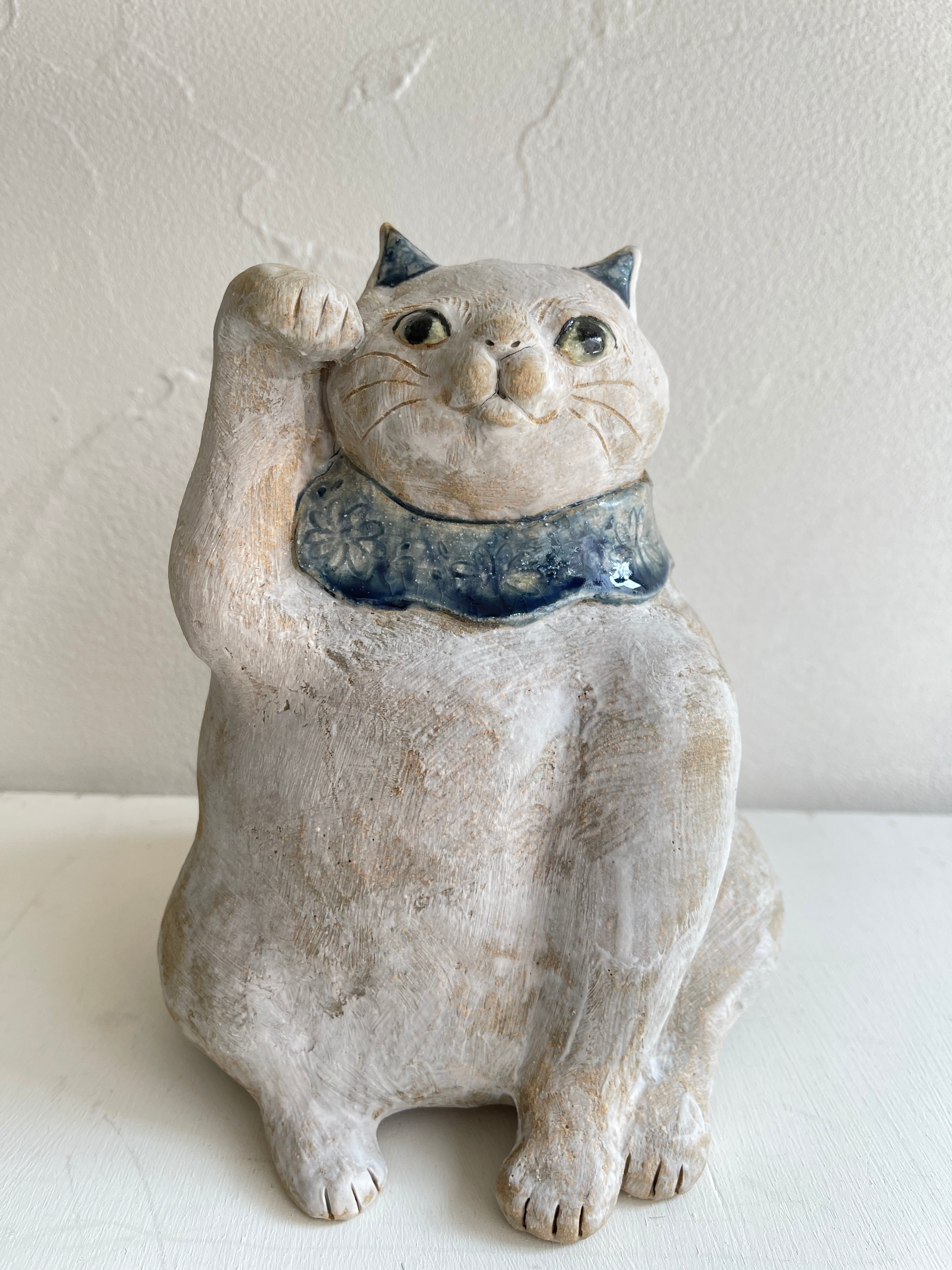 何とも表情豊かな猫ちゃんのオブジェです。右手は金運、幸運を招き、左手は人脈、客招きと言われています。両方招きたいですね。耳の傾きや、身体のふ立体感、顔の愛らしさ、陶器なのに毛並みまで感じ取れるような作品です。